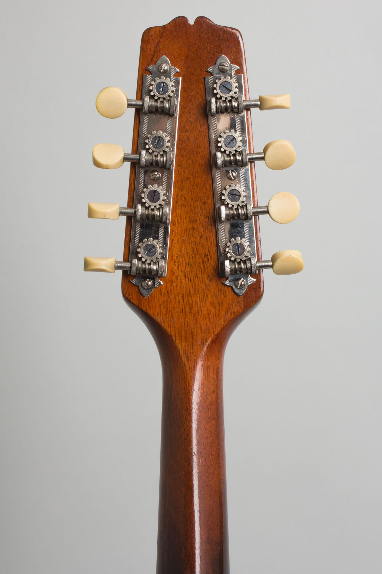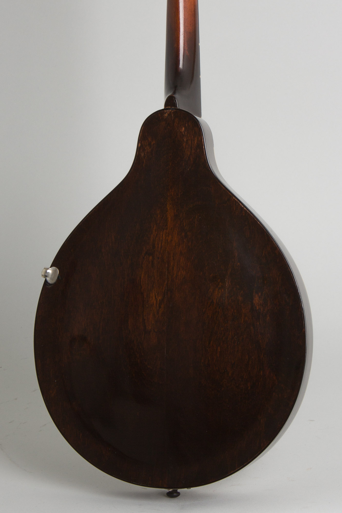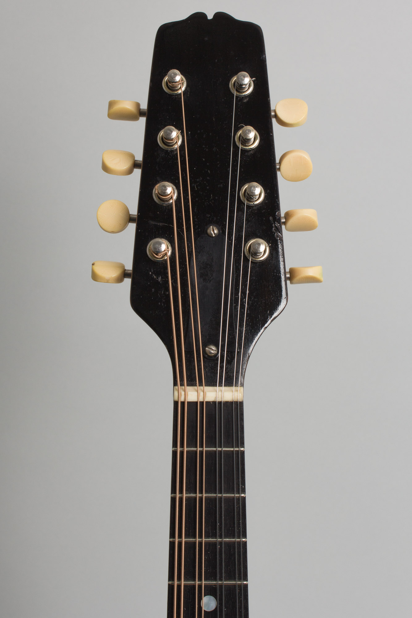 The top on this Style A bears the older "Sheraton Brown" top finish, which was about to be discontinued in favor of basic black. The top is bound in white celluloid with a thin 5-ply inlaid soundhole ring. The back is bound in tortoise Celluloid, an unusual feature for a style A found only right around this time. The tailpiece has the engraved "The Gibson" cover plate and the tuners are pointed-end Waverly strips. The plain headstock does not bear a Gibson logo and the pickguard clamp is one of the last of the old 1910s pieces mated to the new metal shaft, a leftover fitting soon replaced with a simple screwed-on bracket.