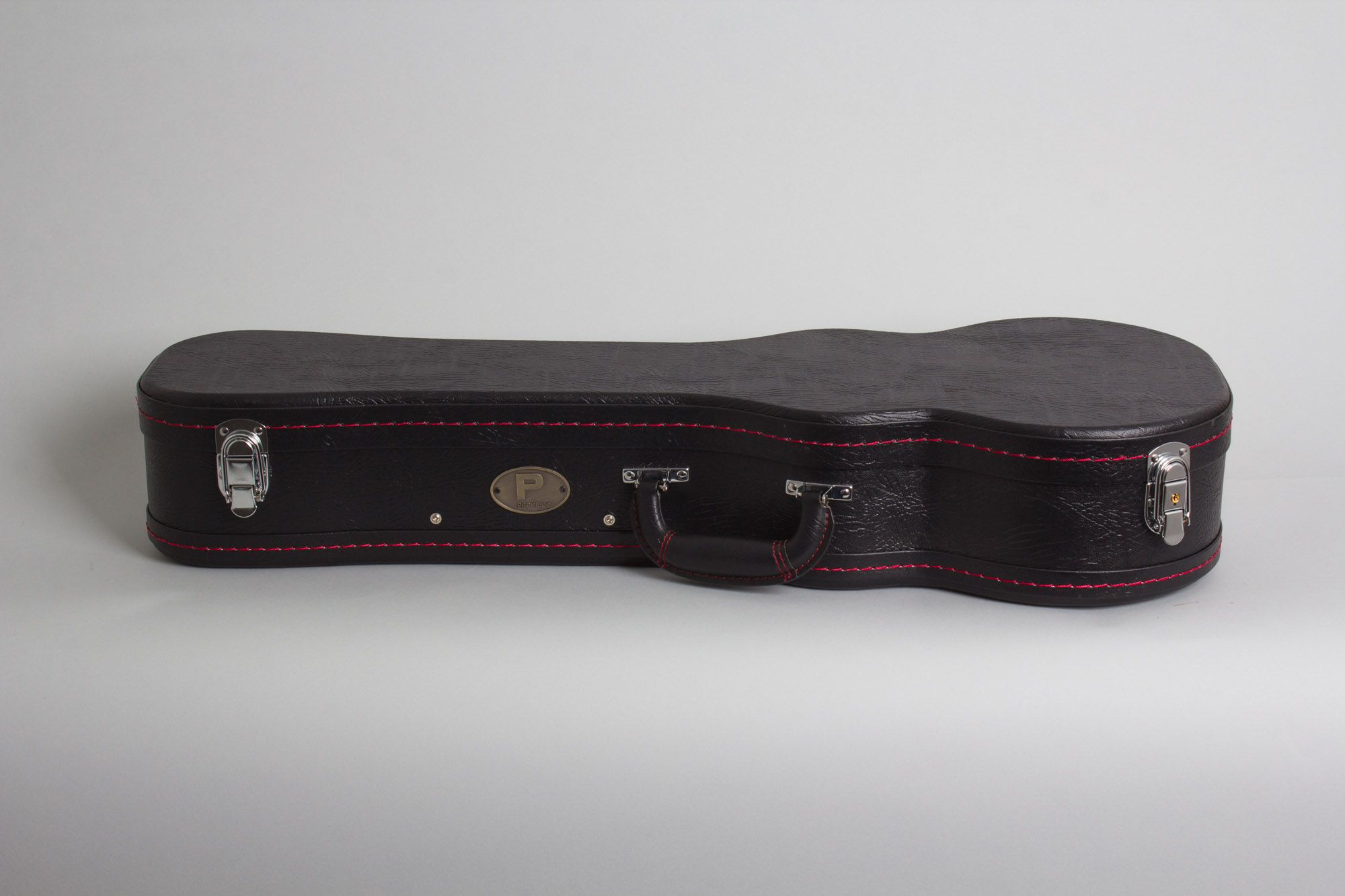 The size of this instrument is closer to what is now considered a "concert" uke than a full tenor. The mahogany body has a triple-bound top and single bound back continued on from the 1920s but the airplane-shaped pin bridge the original model sported is ling gone. The mahogany neck has a rosewood fingerboard with 4 pearl dots and the headstock is marked with a banner decal reading "Johnny Marvin Professional Tenor Uke". The tuners are the same Champion pegs used by Martin in the 1940s.