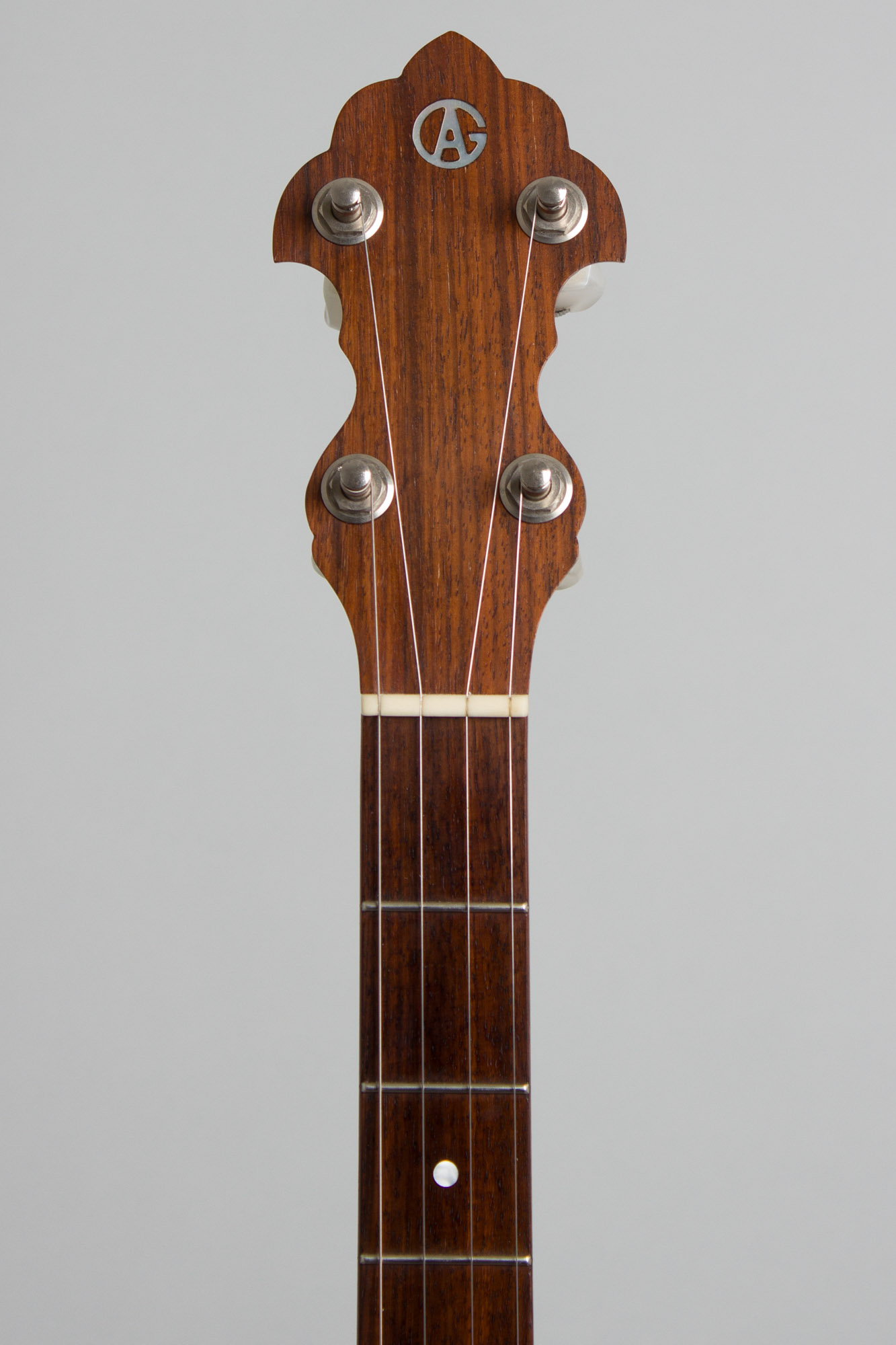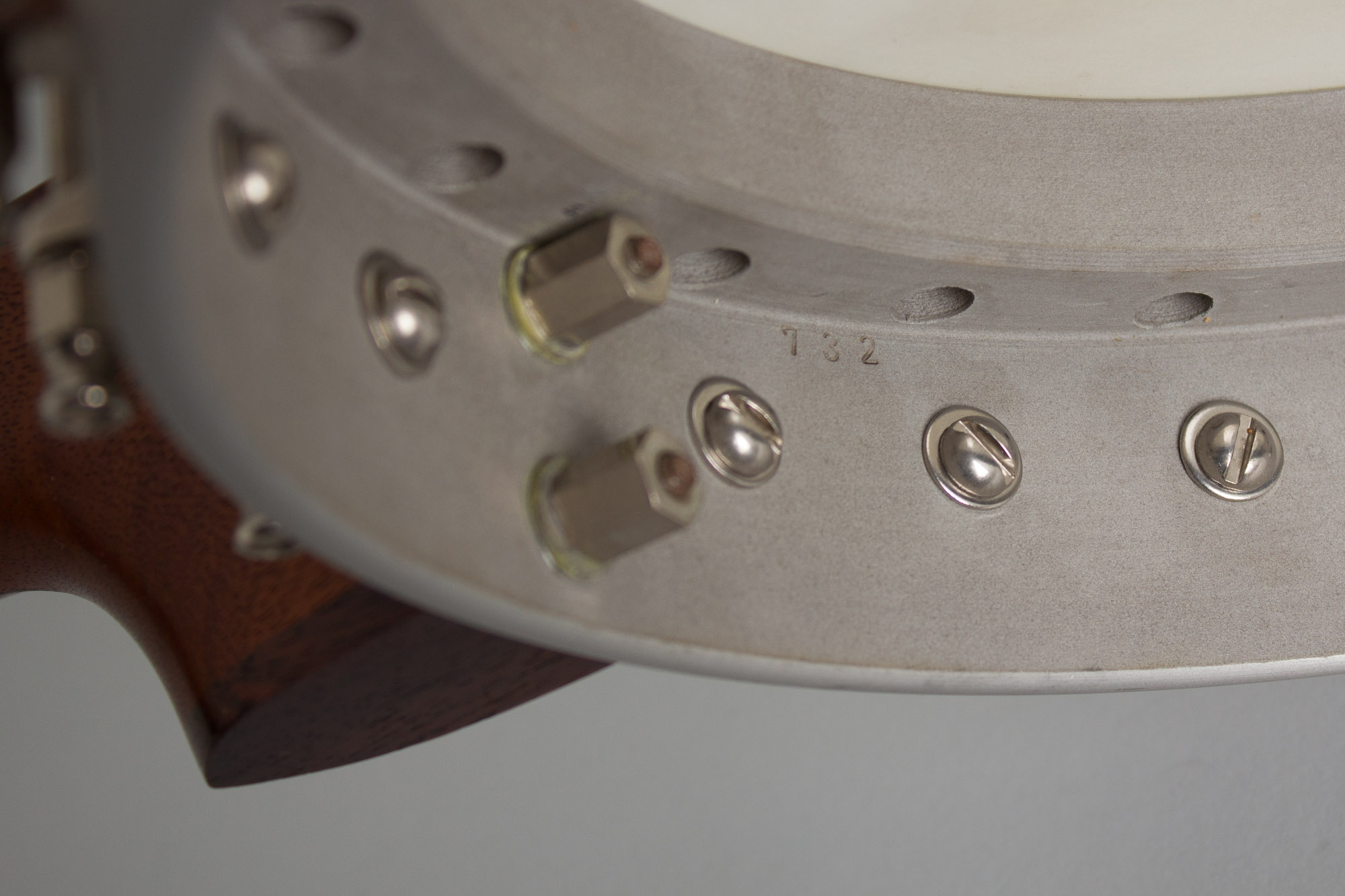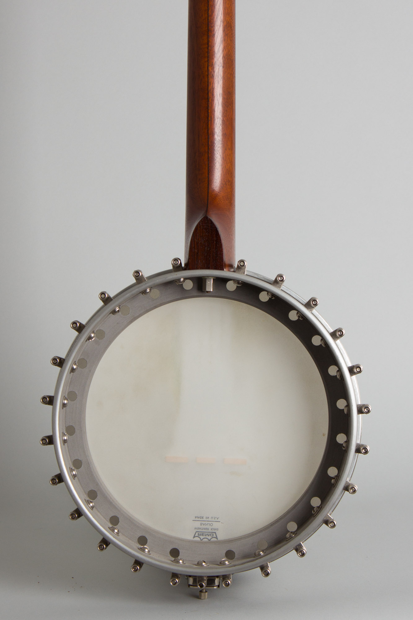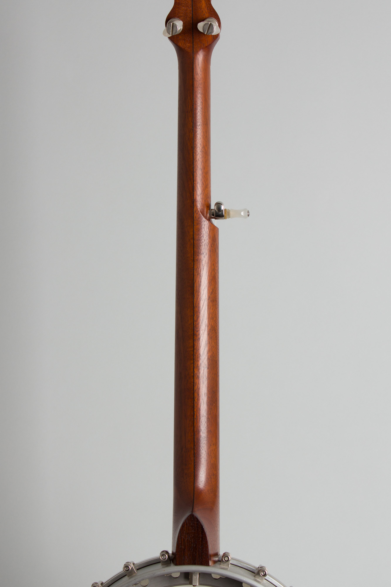This 1991 Goose Acres openback 5-string is built around a Cleveland foundry aluminum rim with an integral arch-top tone ring. The area between the outer rim and inner raised section has 24 round sound ports facing to the rear. The neck is in the classic Vega pattern made of laminated mahogany with a thin center strip and topped with a dot inlaid rosewood fingerboard. The headstock is faced in rosewood and carries typical 1980s Planet tuners with large pearloid buttons. The neck is bolted directly to the rim with no dowel or co-orinator rod. For a metal-rim banjo the sound is warmer than one might expect, with a nice ring but never harsh. This is a very nice (if not wholly traditional) old time banjo that in a pinch can sub in a Bluegrass jam!