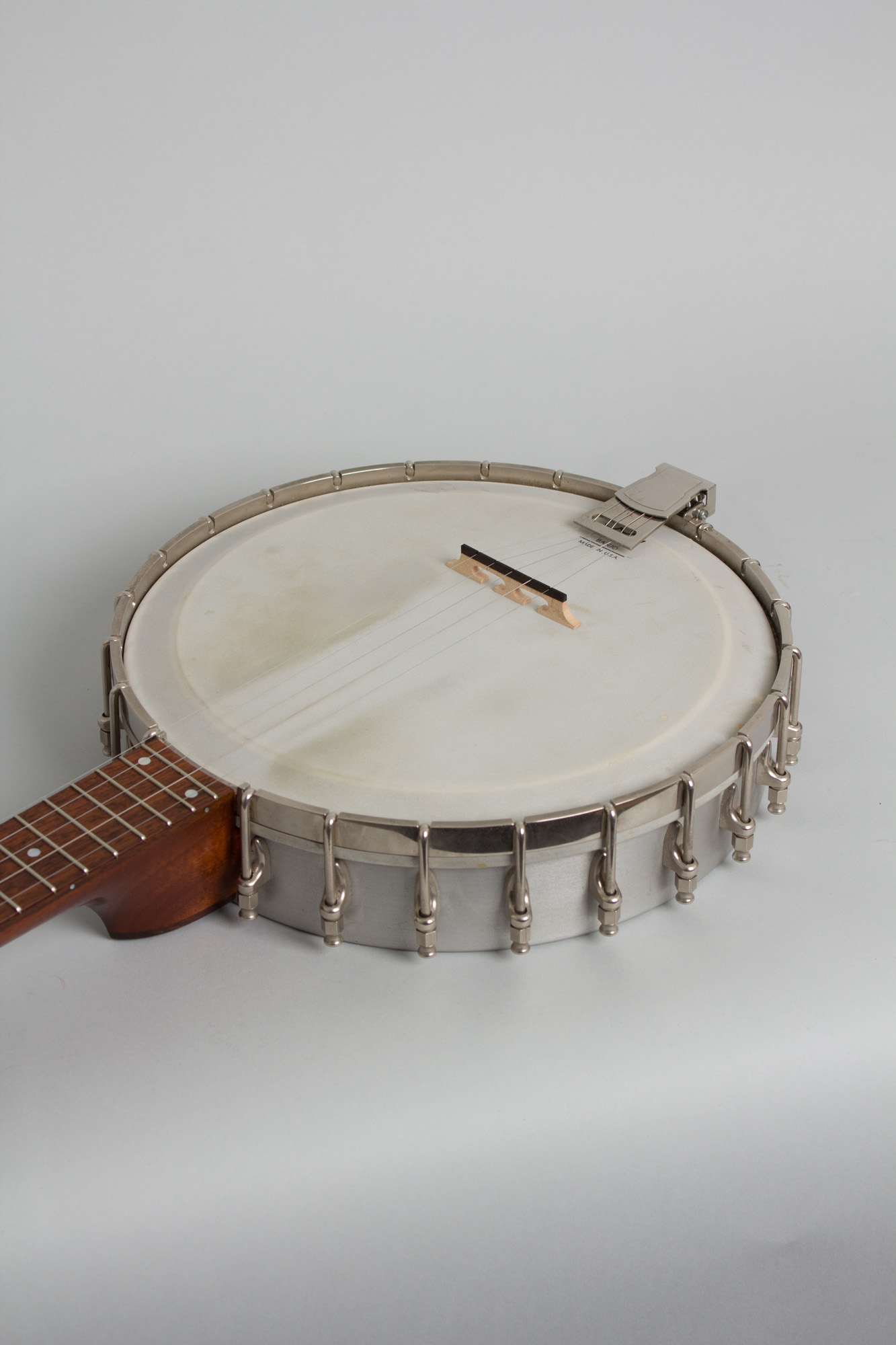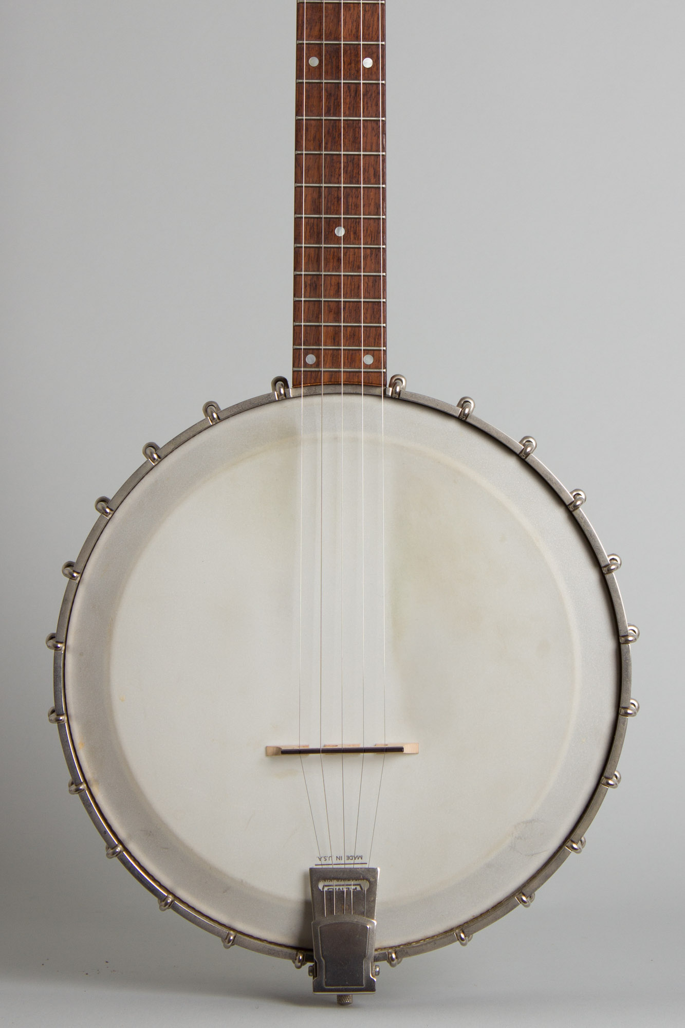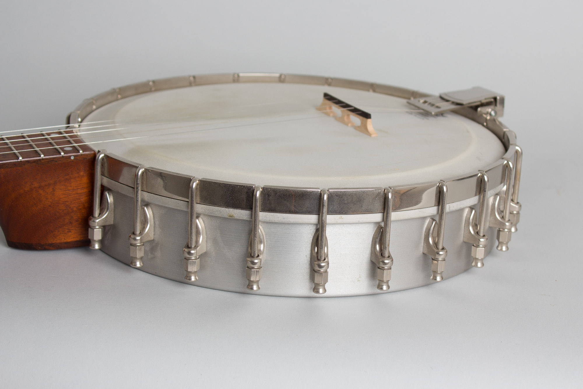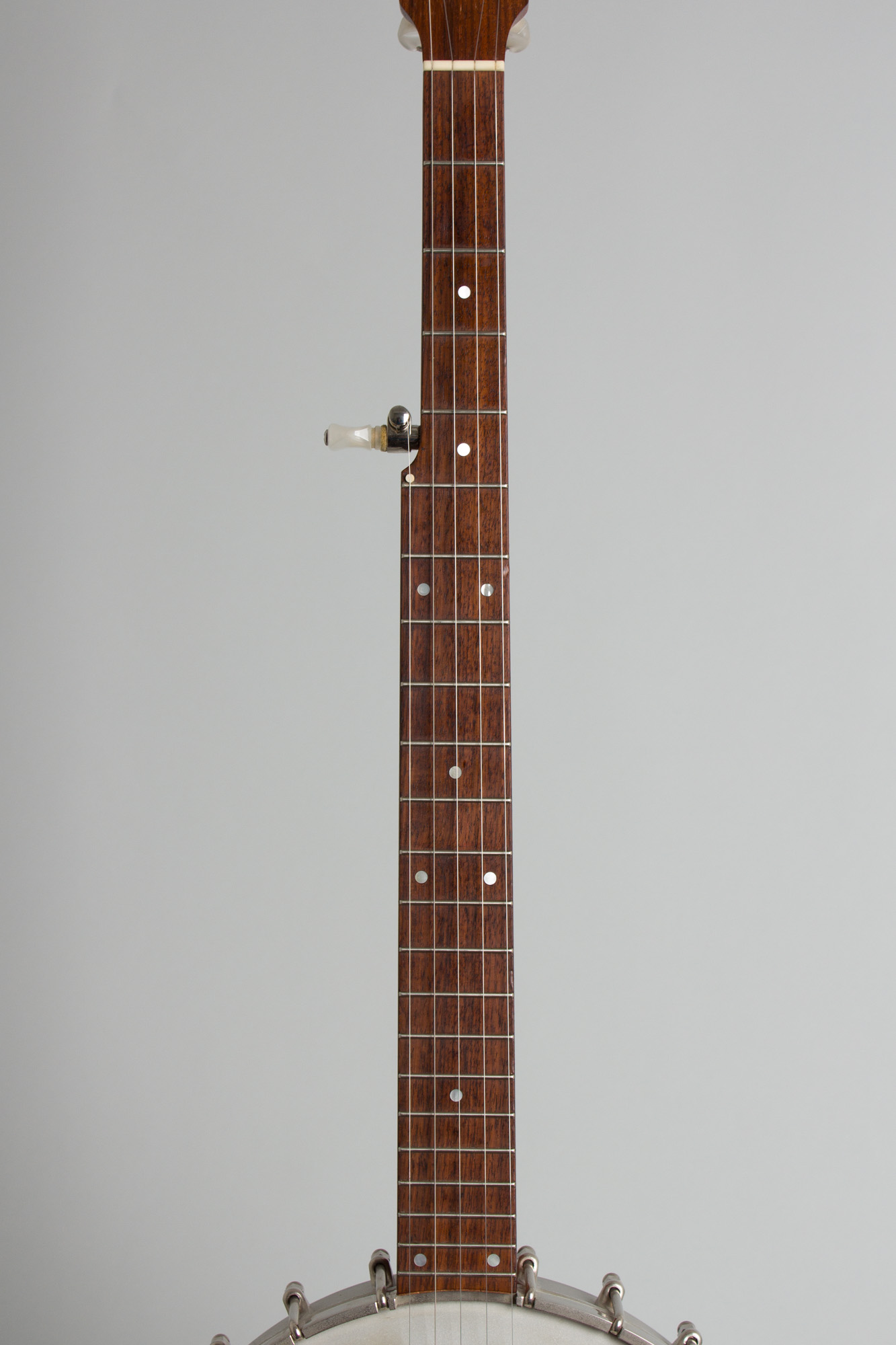 This 1991 Goose Acres openback 5-string is built around a Cleveland foundry aluminum rim with an integral arch-top tone ring. The area between the outer rim and inner raised section has 24 round sound ports facing to the rear. The neck is in the classic Vega pattern made of laminated mahogany with a thin center strip and topped with a dot inlaid rosewood fingerboard. The headstock is faced in rosewood and carries typical 1980s Planet tuners with large pearloid buttons. The neck is bolted directly to the rim with no dowel or co-orinator rod. For a metal-rim banjo the sound is warmer than one might expect, with a nice ring but never harsh. This is a very nice (if not wholly traditional) old time banjo that in a pinch can sub in a Bluegrass jam!