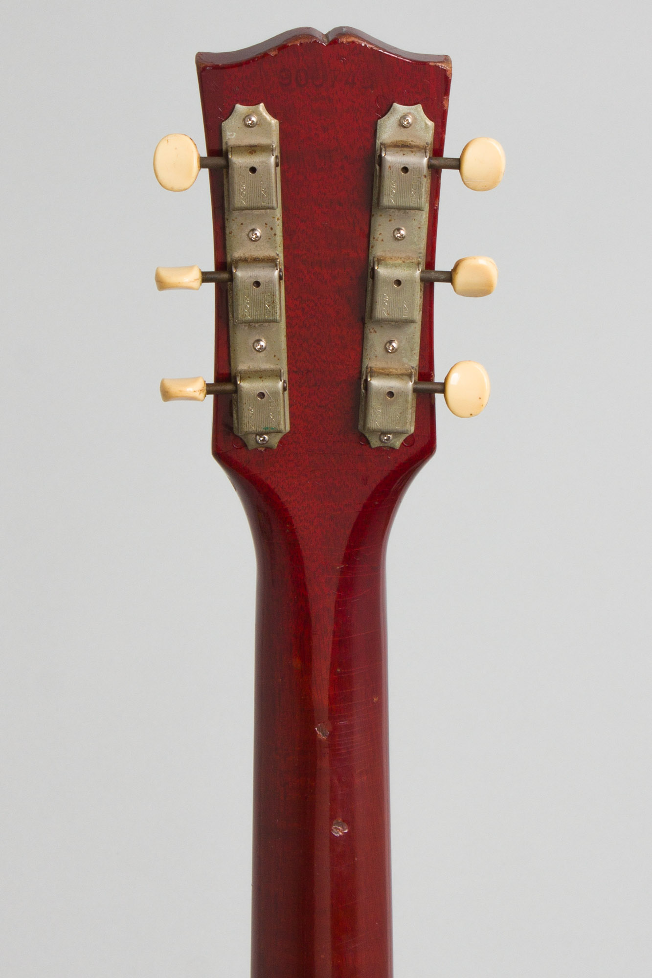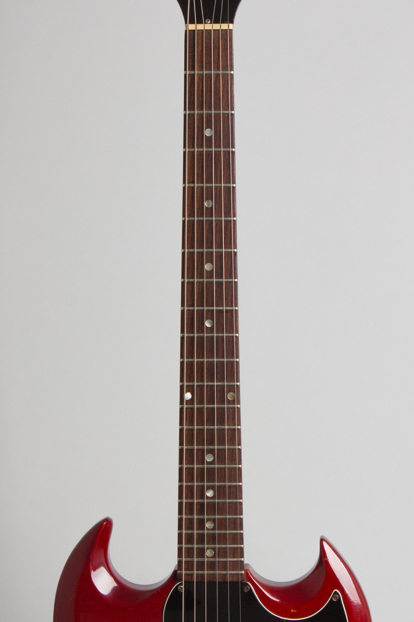 This transitional dark cherry SG Junior was built around the turn of 1965-66, the last great years of Gibson's classic electric era. It has a visible pot date of the 39th week of 1965, and a serial number in the "900xxx" series that is a bit of an anomaly, not unusual for Gibson in this period. Gibson re-used several multi-zero number series multiple times from 1966-70; although most references state the "900000" series was not used until 1970, here it is on what is indisputably a 1966 guitar. A 1969-70 Junior would be a totally different instrument, with a pickguard covering the face and the later streamlined neck joint.