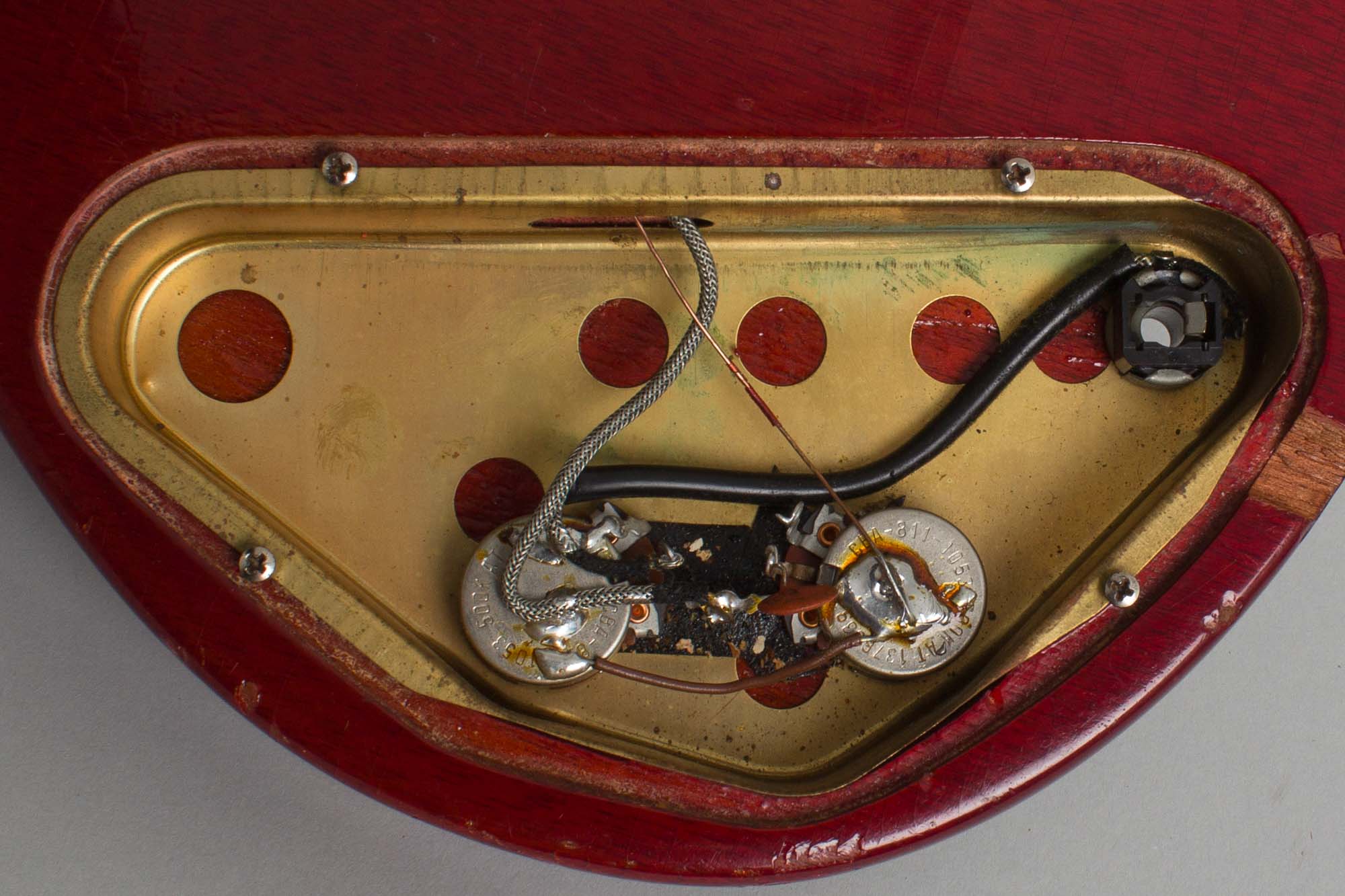 This is a largely original guitar showing some wear and tear but still playing very well. The deep cherry finish has very little fade and retains a deep strong color. There is light checking and small dings, dents and scrapes overall; the back of the neck has a couple of feelable dings in the lower positions but not much play wear. The bottom edge of the body took a hit at some point; there is a decent sized chip of wood missing from the back edge of the control cavity and a couple of tight grain cracks to the body in this spot. These have been stabilized and are not conspicuous; there is also a small finish chip missing by the output jack.