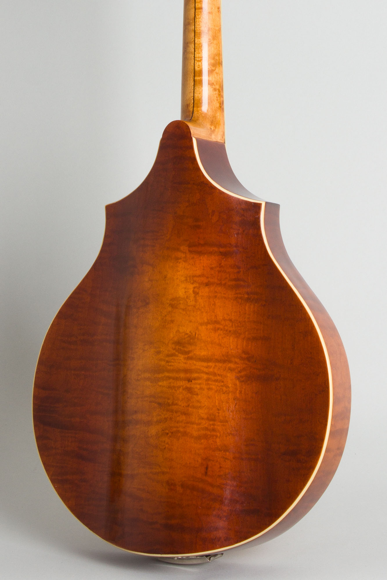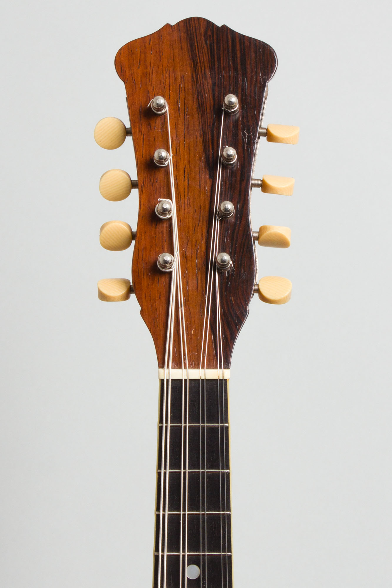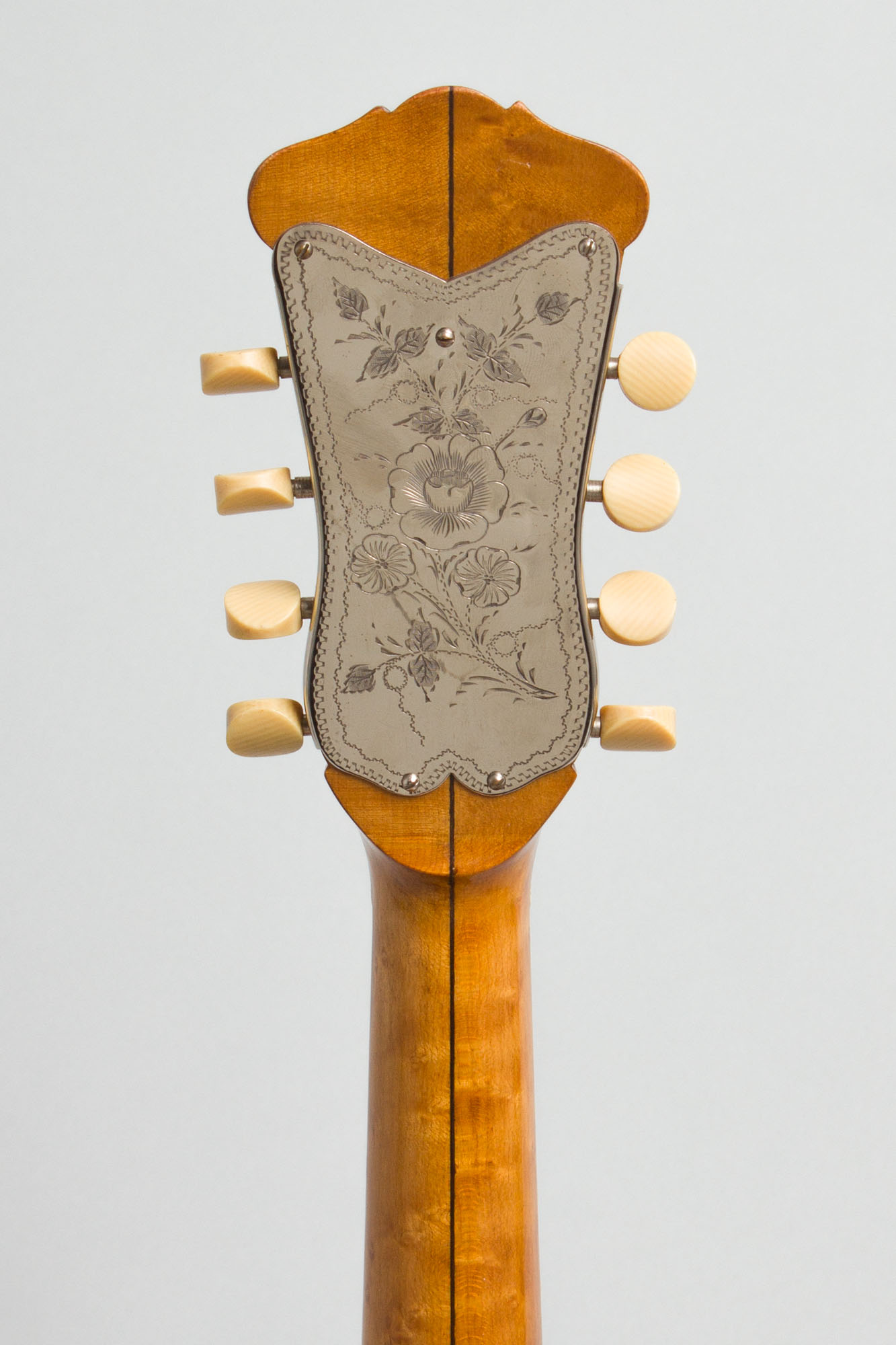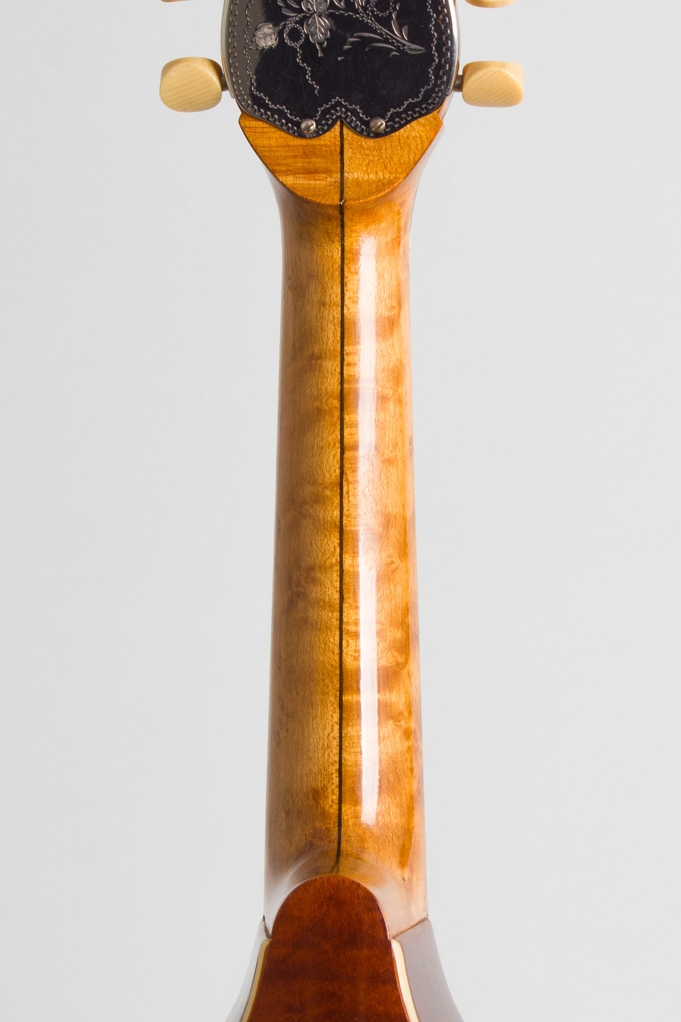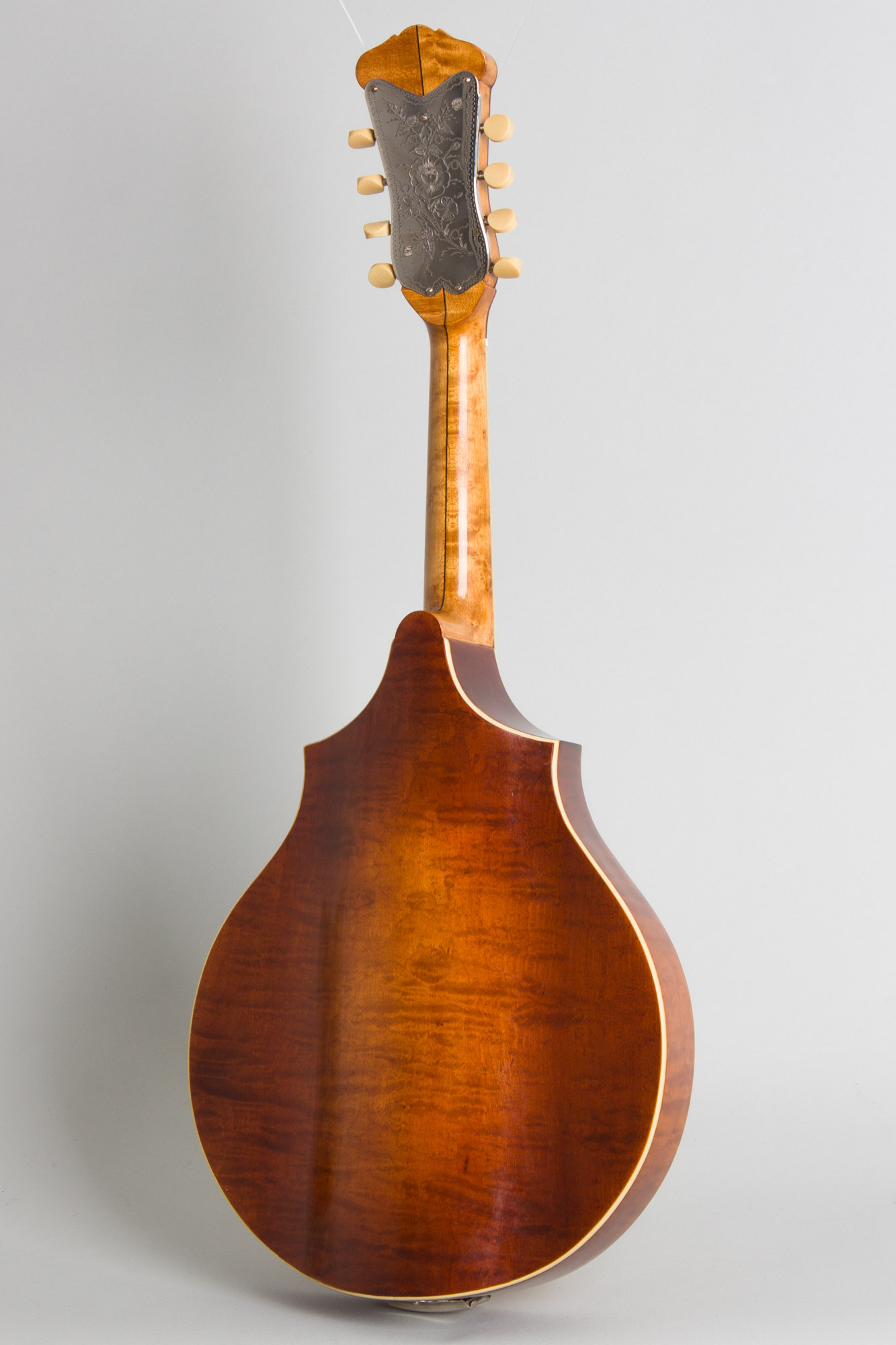 The 3-piece laminated figured maple neck has a flat radius, bound ebony fretboard with mixed dot and shaped engraved pearl inlay. The headstock is faced in rosewood with inset bowlback style tuners under an engraved backplate. The carved bridge is ebony with a bone insert, the tailpiece has a fancy engraved "clamshell" cover. This Model 205 is a splendid example; all finish and hardware are original and it is an excellent playing and sounding mandolin with a sweet singing tone, more powerful than one might expect. This is the nicest "cylinder back" we have ever had, a lovely instrument in every way.