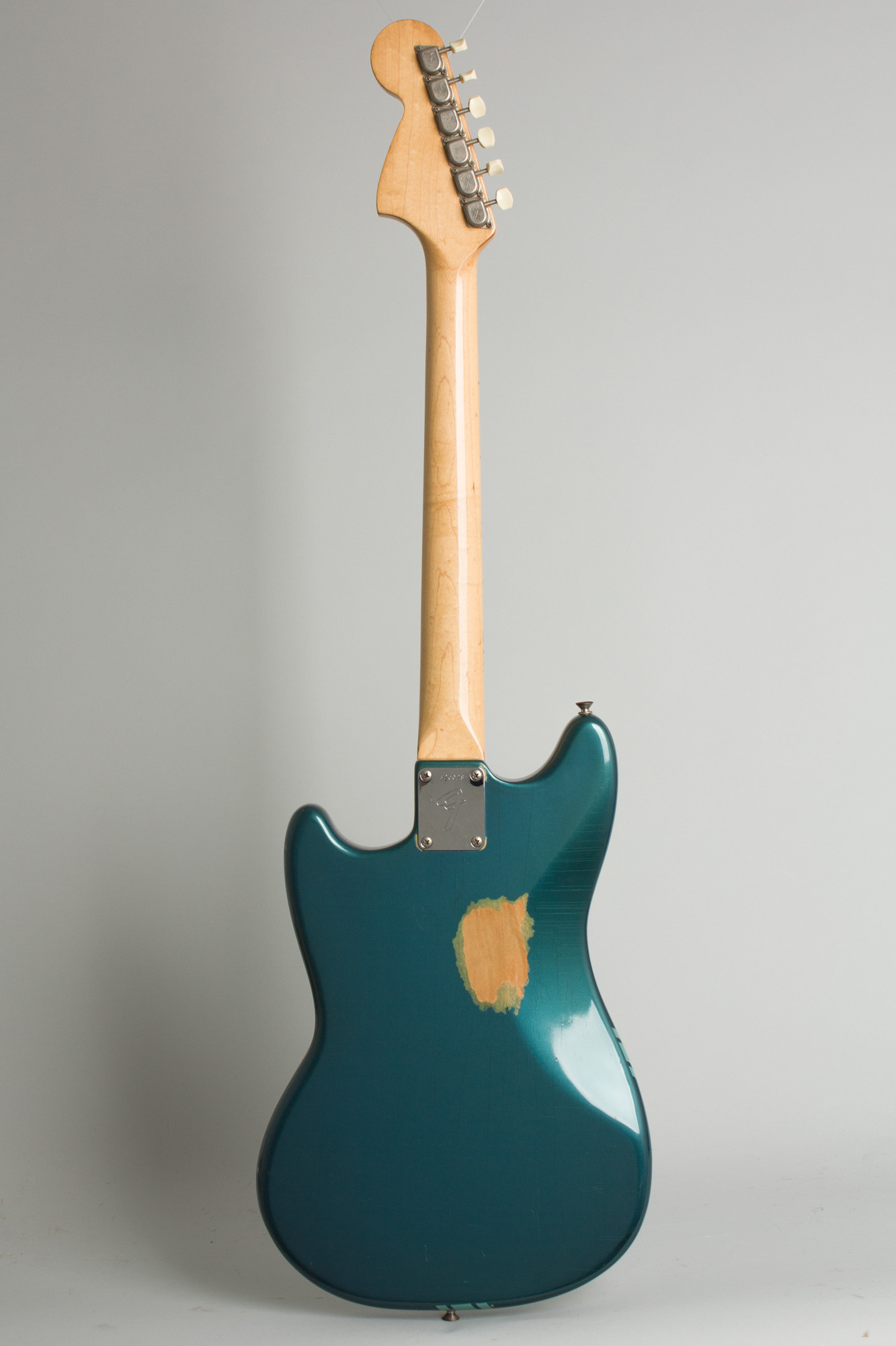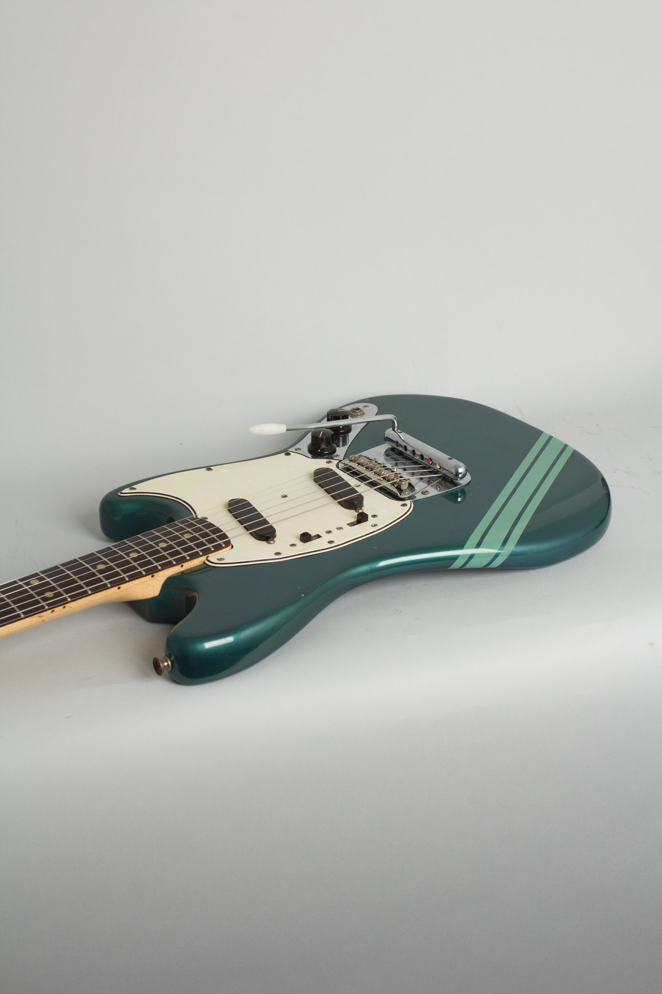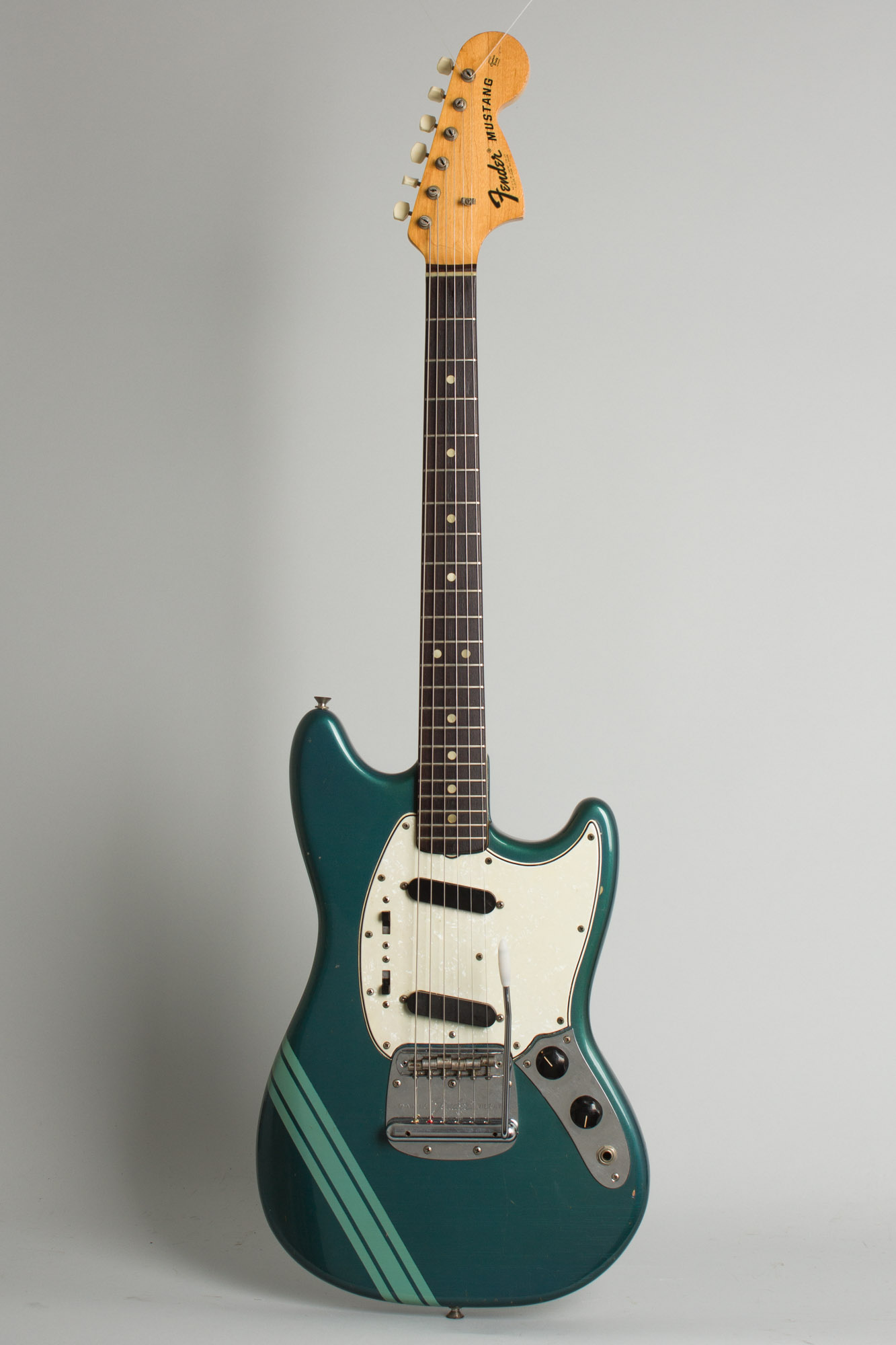 Fender Competition Mustang Model Solid Body Electric Guitar (1971), made in Fullerton, California, serial # 320028, Lake Placid Blue with Racing Stripe finish, alder body, maple neck, rosewood fingerboard, original grey hard shell case.