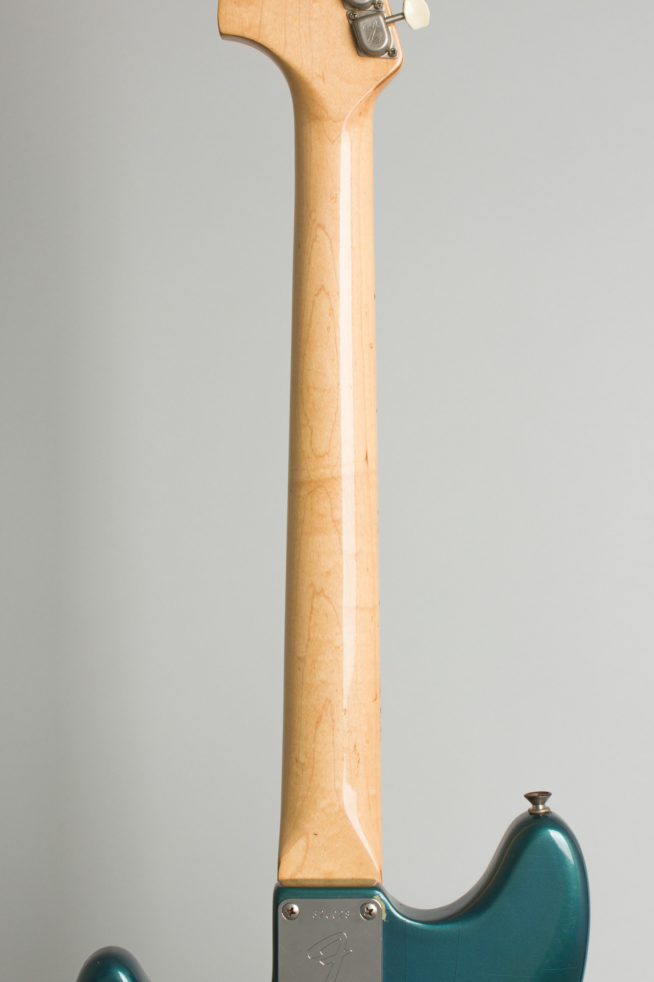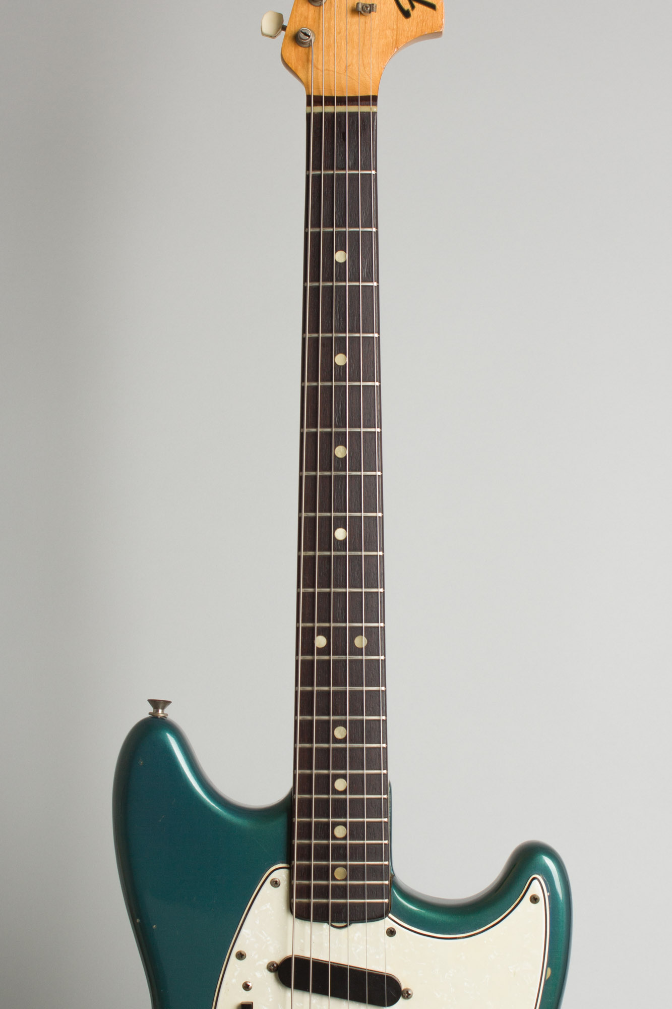 Except for the lack of a matching headstock, the features of this Mustang remain nearly identical to late 1960s models. The neck has the typical lacquer headstock over poly, which Fender did in this era to "set' the decal properly. The neck even has a bit of figure in the maple.