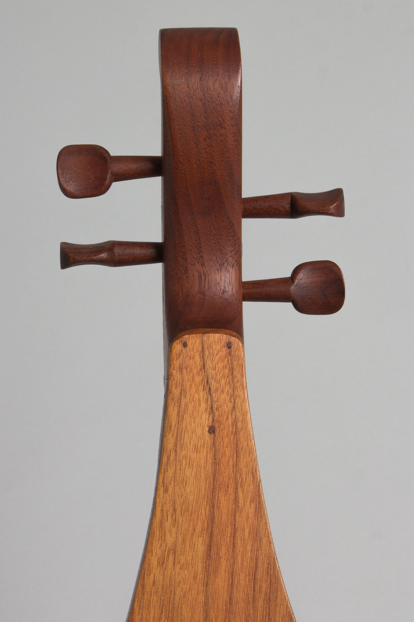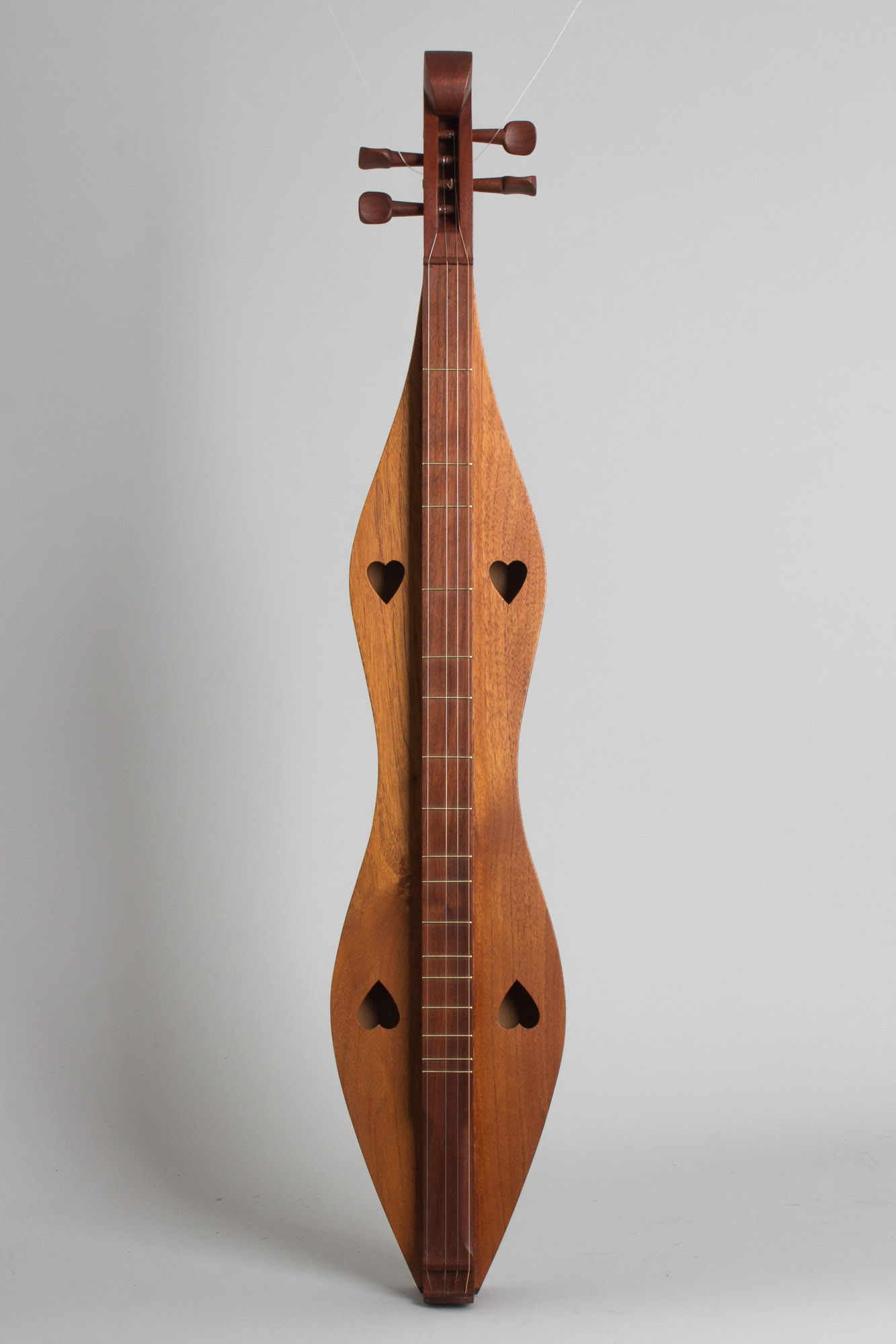 This is a pretty straightforward, but nicely constructed example of a classic 4-string Appalachian dulcimer made entirely of handsomely grained cherry wood with friction tuners and a wooden tailpiece over stainless steel frets. It has a traditional hourglass shaped body and the ever-charming heart shaped soundholes. The string spacing is interesting on this very comfortable playing dulcimer; rather than one course of two closely parallel strings, the center two strings are close enough to be fretted together but still far enough apart to be played as individual strings.