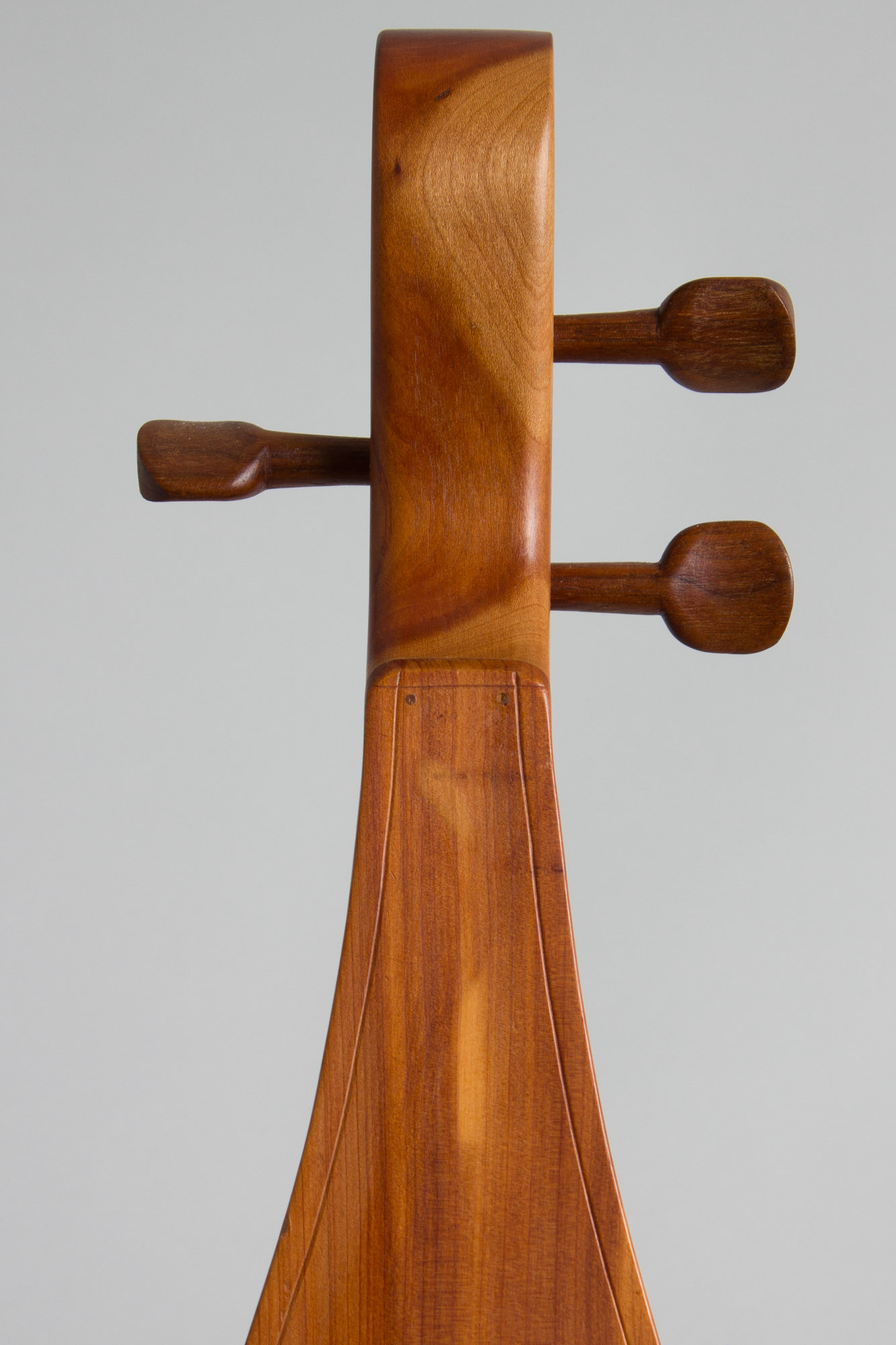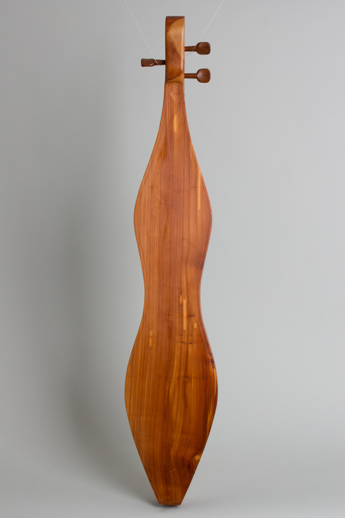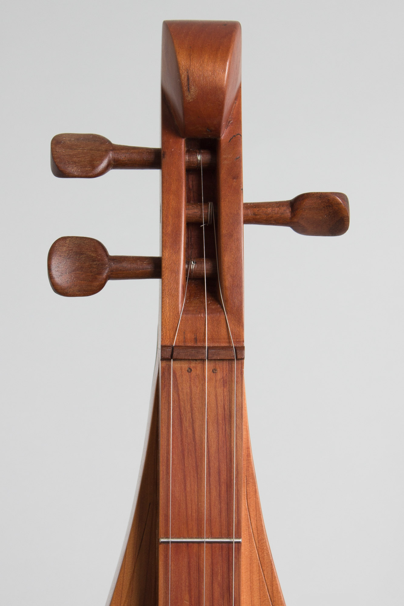 This is a pretty straightforward, but nicely constructed example of a classic 3-string Appalachian dulcimer made entirely of handsomely grained cherry wood with friction tuners and a wooden tailpiece over stainless steel frets. It has a traditional hourglass shaped body and the ever-charming heart shaped soundholes.