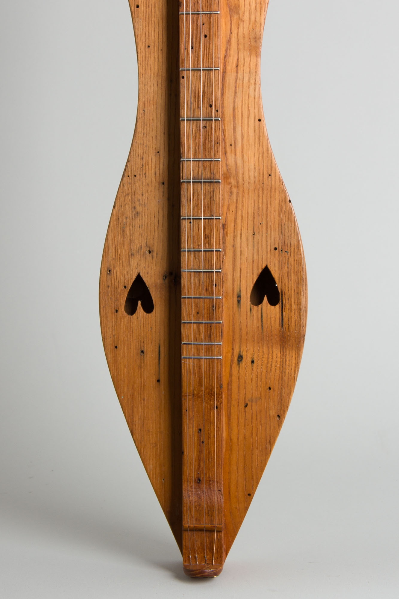 This is an excellently preserved example of a higher quality genuine handmade Appalachian dulcimer. The wormy chestnut has a particularly large smattering of worm holes all over but very little by way of cosmetic wear; there is a well-sealed and basically invisible crack on the lower righthand side. Hicks offered superior buildmanship and a tone that is much more robust and pleasant than many of the common kit-made dulcimers at the time, though there remains a charming "folksiness" to the work after decades of autodidactic lutherie.