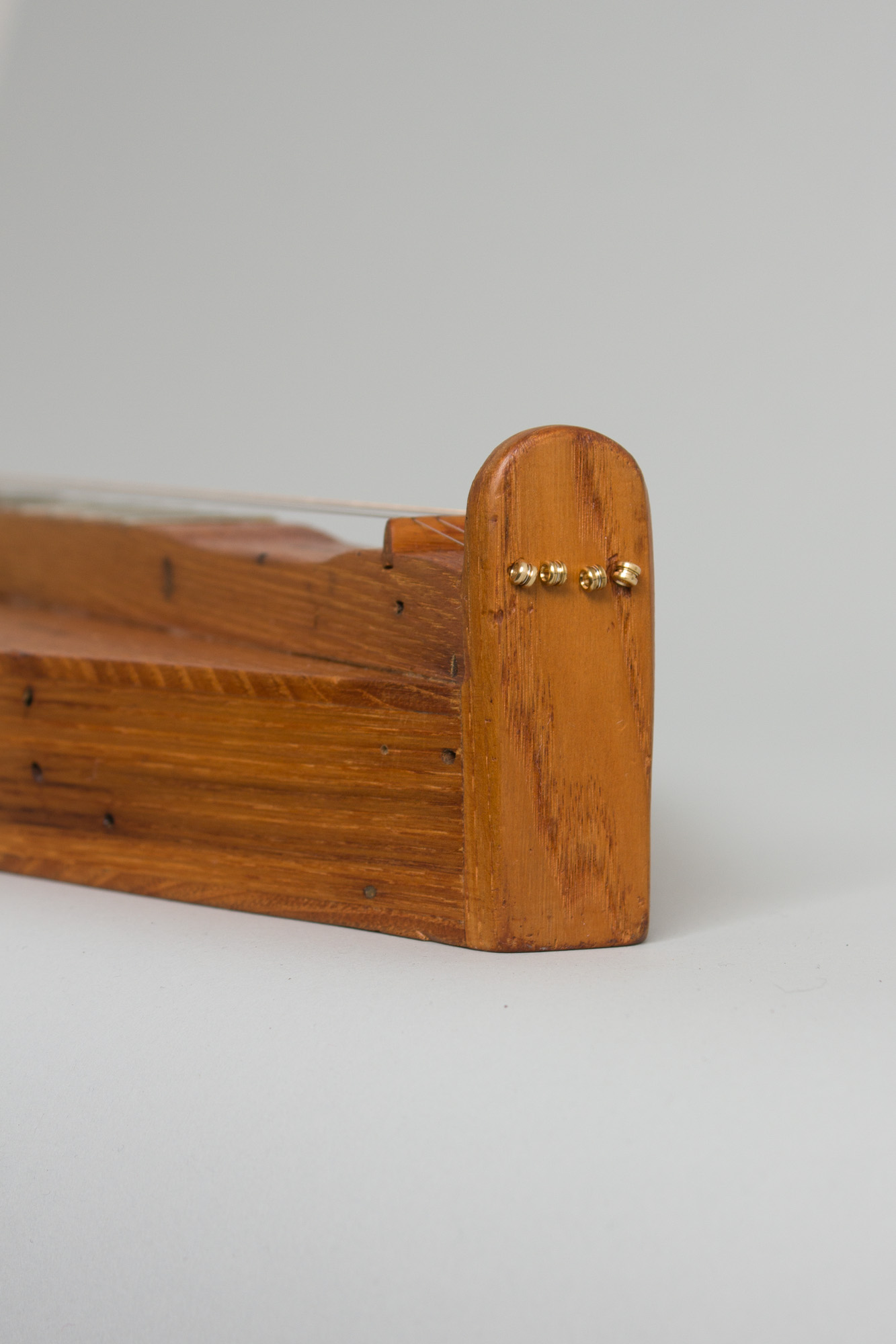 This is a four-stringed dulcimer, with the highest melody string doubled for an even chimier sound. The strings pass over original, minimally worn frets over the bridge and through a thick chestnut tailpiece with four holes. It has a traditional hourglass shaped body and some particularly folkloric and charming heart shaped soundholes.