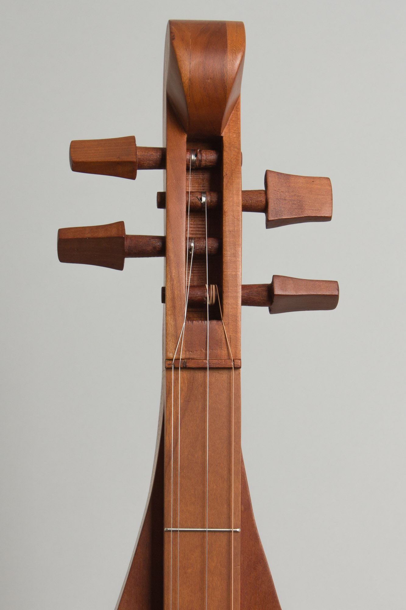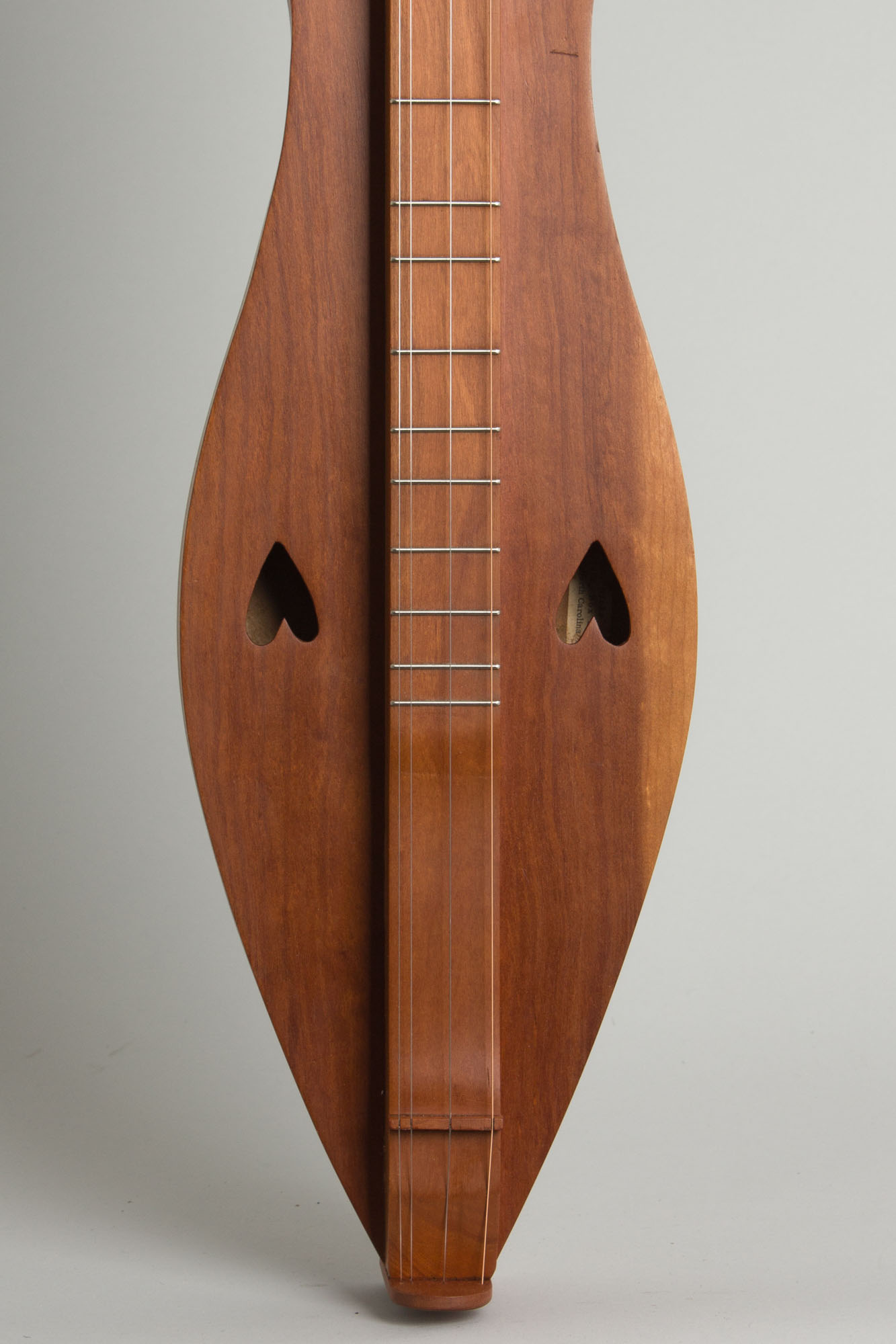This is a pretty straightforward but nicely constructed example of a classic 4-string Appalachian dulcimer made with cherry all the way down. Matching hand carved tuners are nestled into a lump-scroll cherry headstock, a common choice of wood used by Hicks and his like due to its beauty and native abundance. This is a four-stringed dulcimer, with the highest melody string doubled for an even chimier sound. This was a later in life example from Hicks and it is refined in many ways, but there is yet a bit of folky experimentation at the tailpiece. He employs a mixture of thin steel nails for loop end strings and one single flathead screw guiding the center string. It has a traditional hourglass shaped body and the ever-charming heart shaped soundholes.
