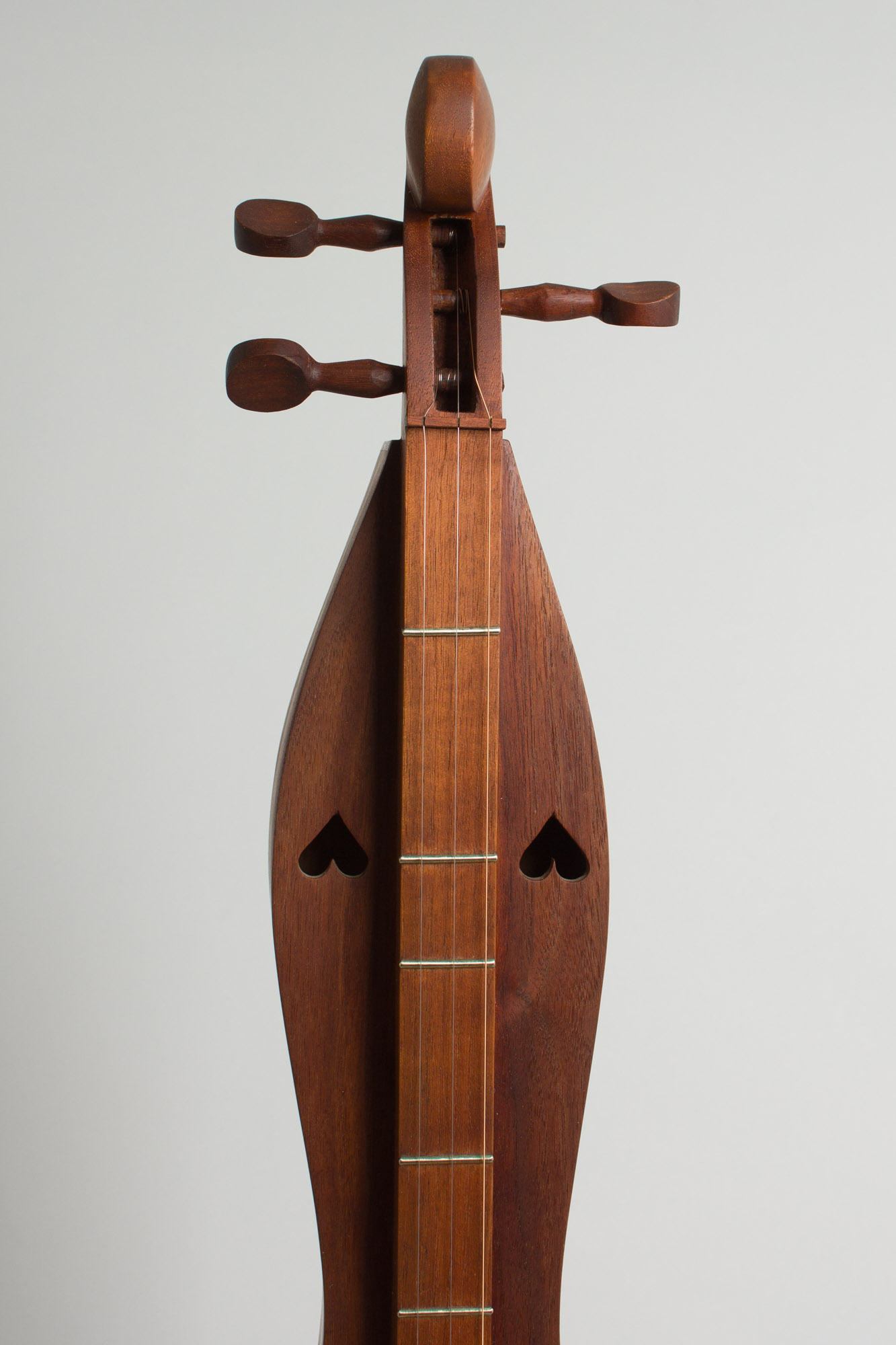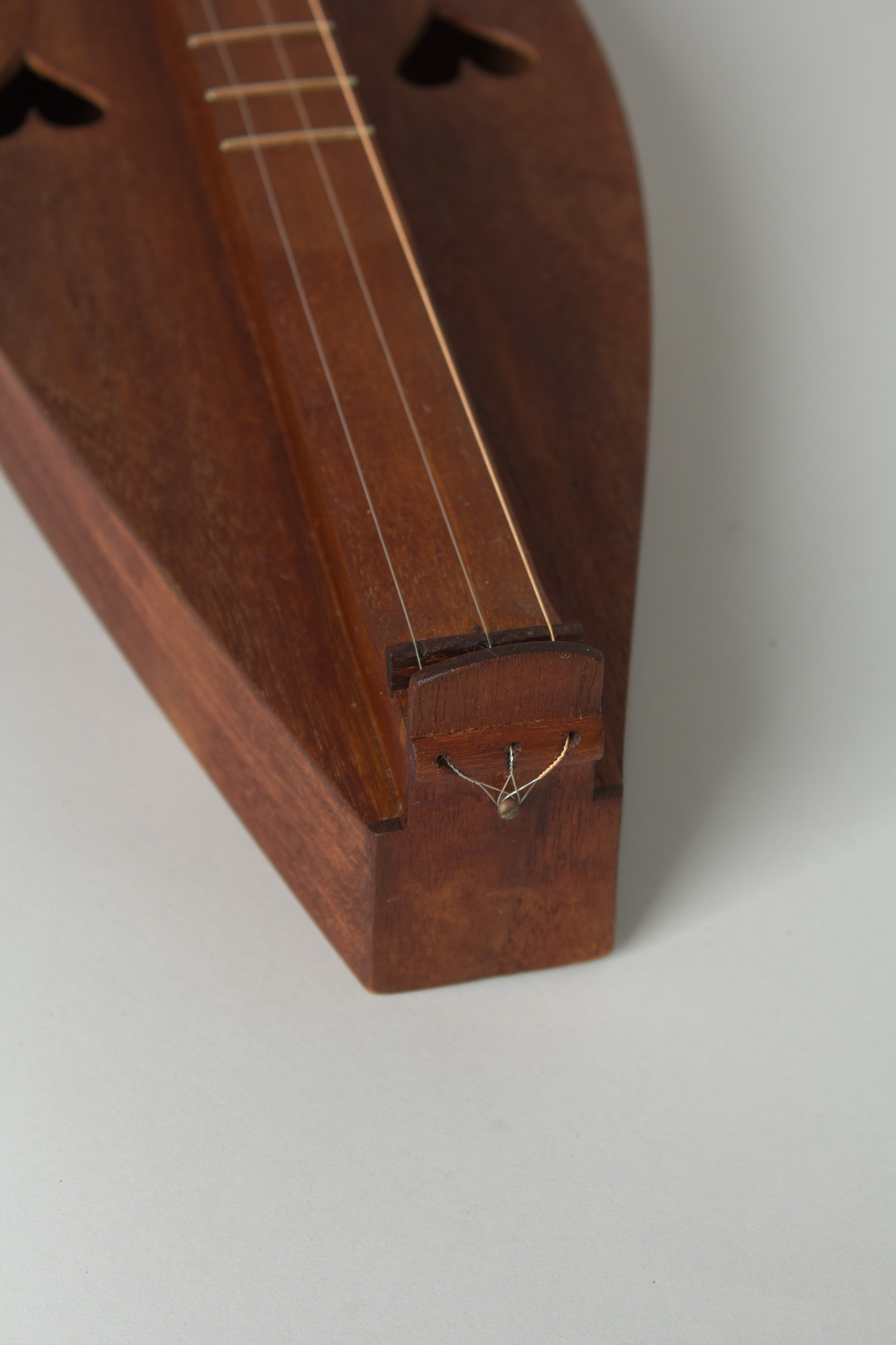 This is a pretty straightforward but nicely constructed example of a classic 3-string Appalachian dulcimer made with a cherry top with walnut back and sides. Matching hand carved tuners are nestled into a cherry scroll headstock; the darker wood friction pegs and nut appear to be rosewood, which would be uncommon but very special. Presnell may have kept a small amount of this exotic wood around to give his dulcimers a little something special in the details or for more deluxe special orders, but it is also possible that these were replaced at some point and upgraded from what would have presumably been cherry pegs. The strings pass over original, minimally worn frets and a possibly non-original rosewood bridge to a single metal nail endpin. It has a traditional hourglass shaped body and the ever-charming heart shaped soundholes.