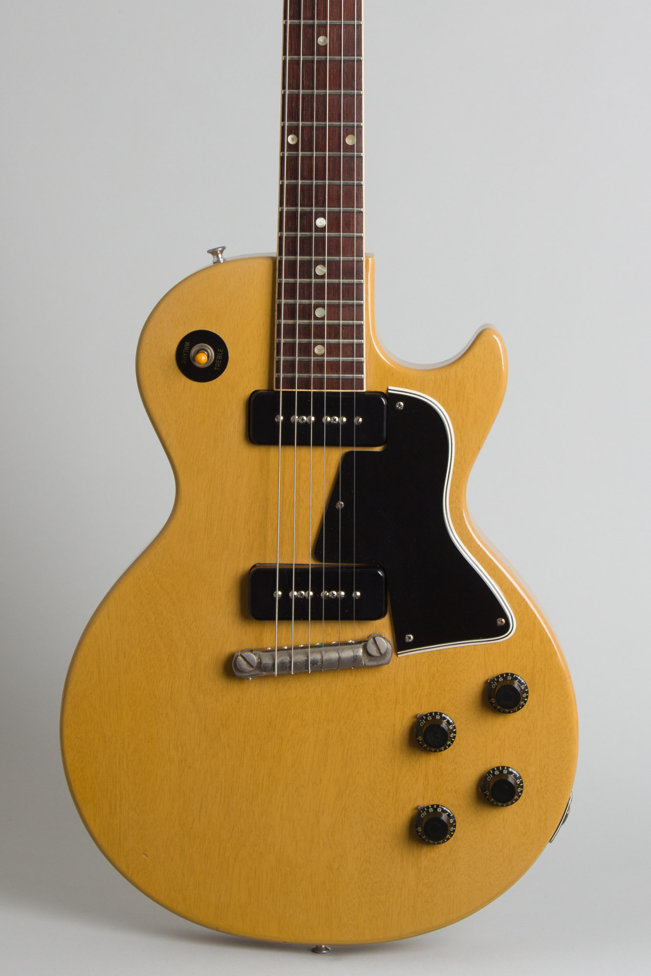 This is a super nice example of an early 1957 single-cutaway Gibson Les Paul Special, showing light signs of use but still in overall very clean shape for well over 65 years on. The features are typical of this first variant of the model with a light "limed mahogany" finish on the body and neck, two powerful P-90 pickups with black plastic "soapbar" covers, black bonnet knobs, a multi-ply beveled-edge black celluloid pickguard and the nickel-plated bar bridge/tailpiece assembly. The headstock carries a pearl Gibson logo and silkscreen "Les Paul Special" designation on the face and mounts plastic-button Kluson Deluxe strip tuners. The finish on this one is a medium-banana shade, with less yellow hue in the finish than some.