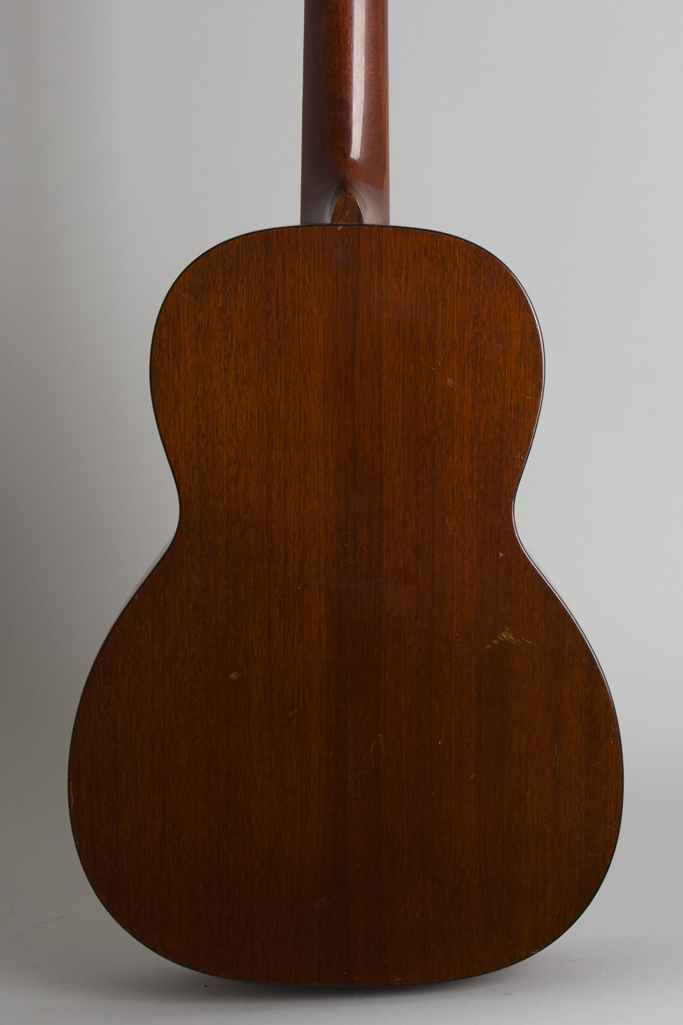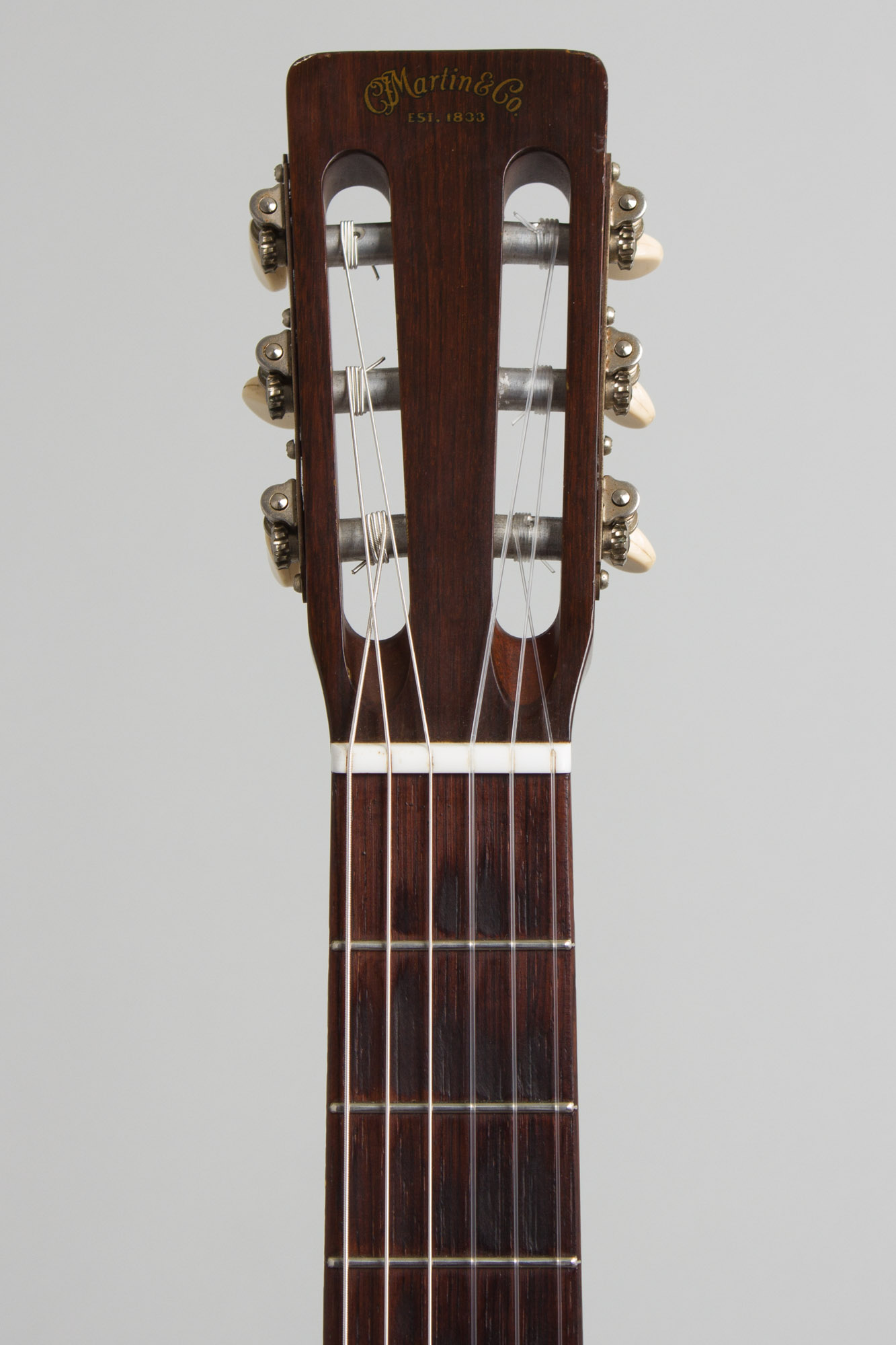 This guitar shows some general play wear, appearing used but not abused. The original lacquer finish shows average wear overall, heaviest on the top with dings, dents, and scrapes, most notably pick and fingernail wear to the spot where there would be a pickguard on a "normal' Martin, as well as strumming marks above the soundhole. The back of the neck is relatively clean with some chipping to the finish along the edges of the fingerboard. There is a small tight grain split just below kerfing along the waist on the bass side, which does not appear to extend to the interior. The guitar appears all original with no visible alterations; the original bridge, braces and bridgeplate are all still intact.