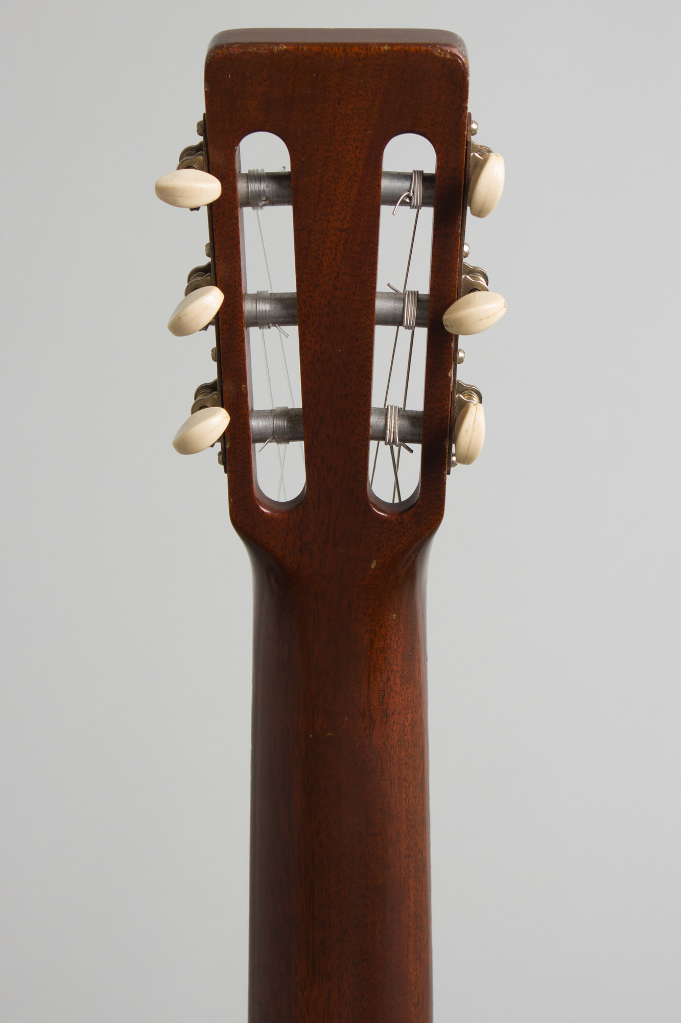 The 00-18C is built with Martin's traditional materials: mahogany back, sides and neck and a spruce top. It uses the traditional 19th century Martin 12-fret body shape and headstock, but internally is a delicately fan-braced like a classical guitar. This style Martin is not well remembered now, but was popular at the time with amateur and even some professional folk players strumming in the "Hoots" of the '60s. This is a lovely and sweet-sounding guitar that deserves a better reputation than it often gets, neither "fish nor fowl" perhaps to many modern players but an appealing creation nonetheless.