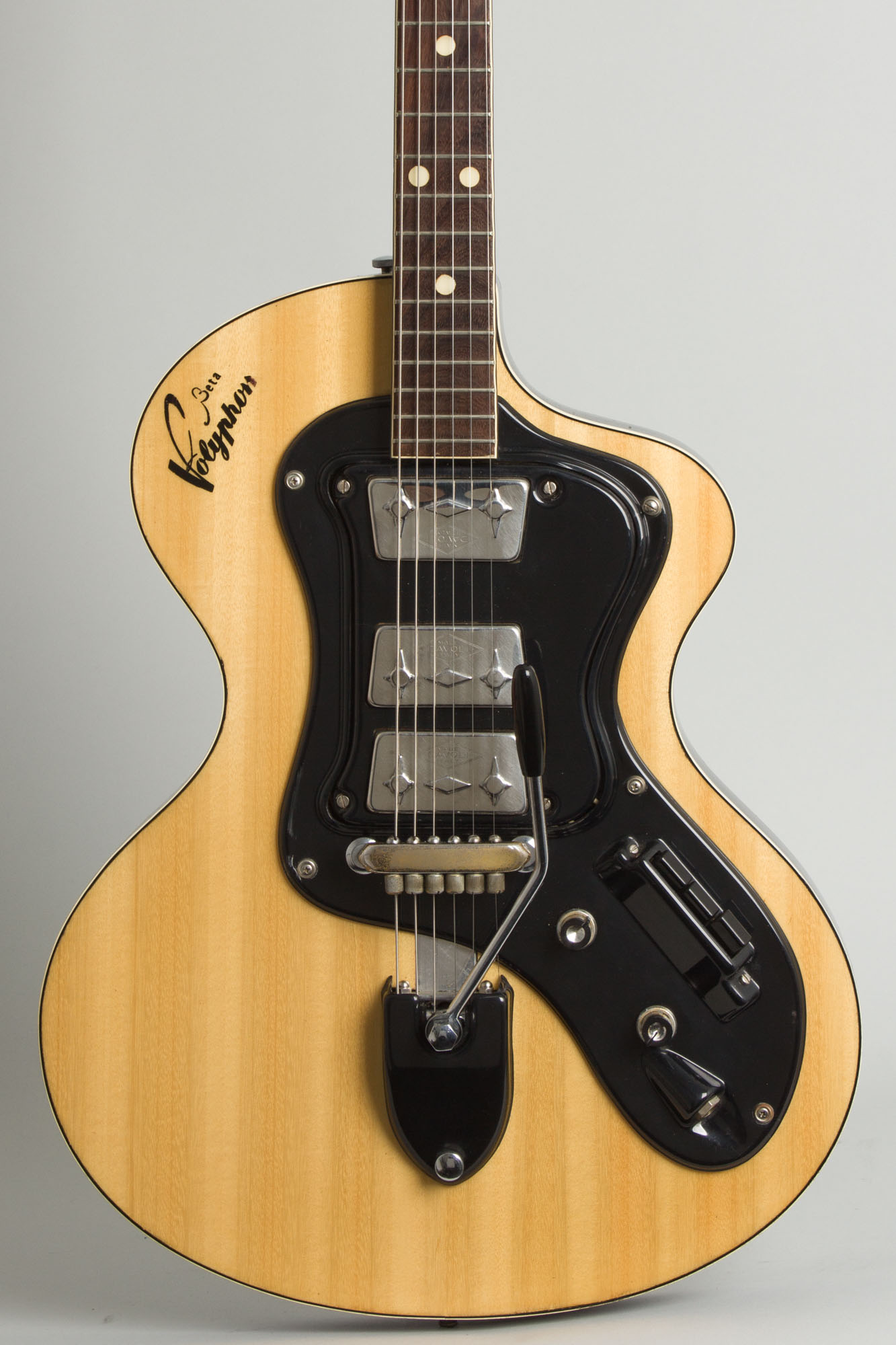 The Polyphon body is 16" wide but thin at the rim, built of plywood and plastic with an arched back, flat top, and soft cutaway on the treble side. This particular Polyphon mounts three of the trapezoidal Davoli pickups that Pioli favored in a two-stage pickguard/pickup/bridge assembly made of vac-u-formed plastic. These are controlled by a single master volume and a tone knob, with a bank of three accordion-style selector switches below turning any pickup on or off. The jack is mounted in a raised plastic bay similar to Hagstrom practice. Wandre's proprietary plastic-sheathed aluminum neck is fitted here with a single-sided headstock; this style was designated the Polyphon "Beta". The "Alpha" models had the older standard 2-sided tuner arrangement.