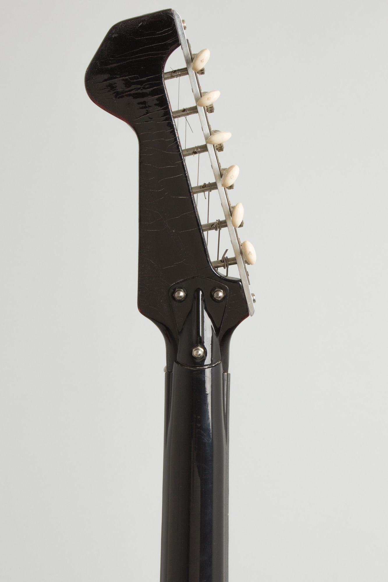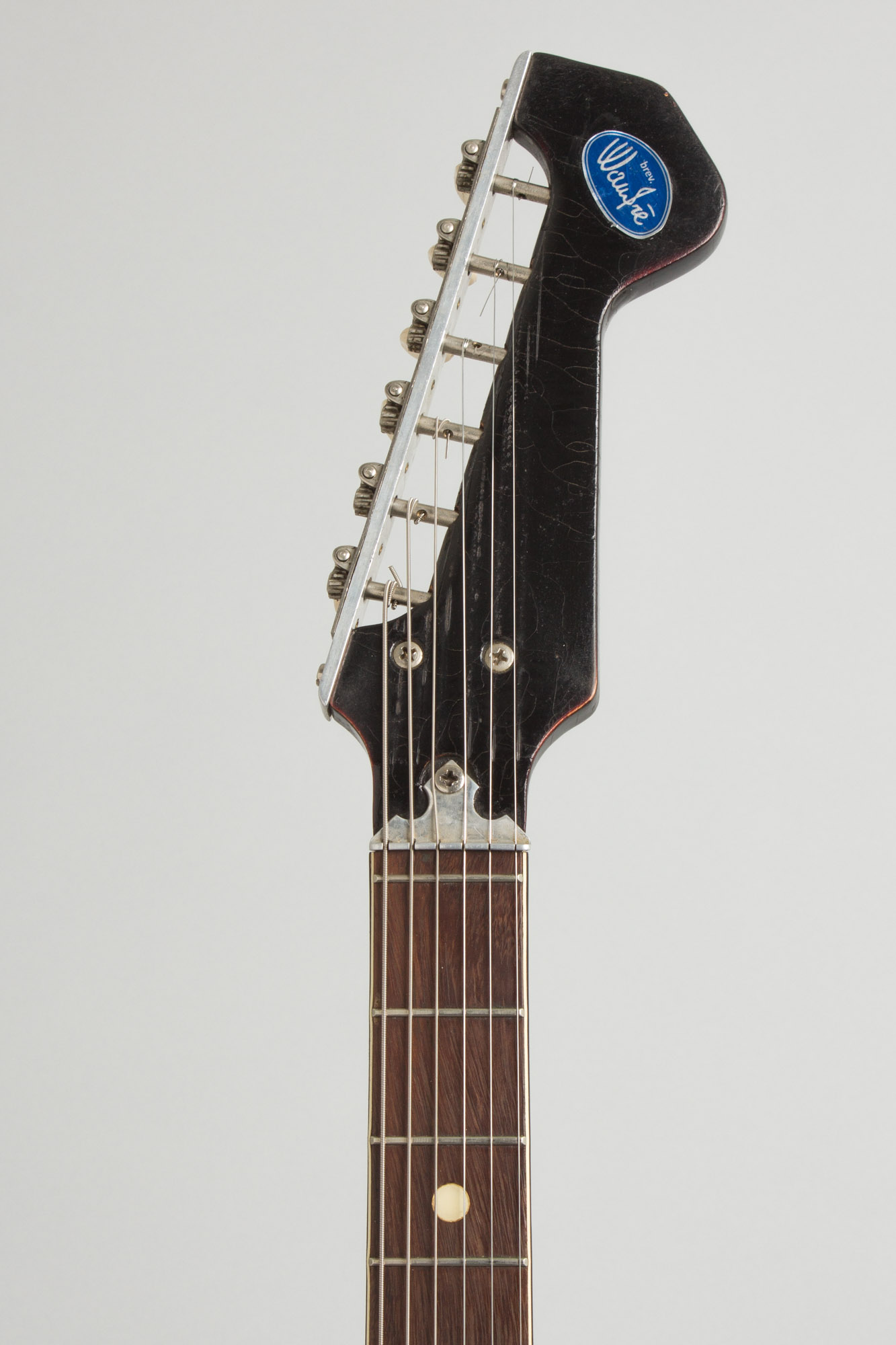 Overall this rare guitar is in fine playing condition with no major damage or repair and, rarely and critically, all original hardware present and intact. This is no small feat for a Wandre guitar, which are notoriously prone to plastic parts breaking or tiny bits and pieces going missing. As is typical, the plastic sheathing on the body has some long checking lines but is fully intact and not separating anywhere. The original black lacquer paint on the headstock face is heavily checked; there is a teeny bit of what looks like clear nail polish on the back and edges of the headstock, likely an attempt to prevent further checking. This is sporadic and does not cover the whole of the area, and fortunately the Wandre logo sticker is intact.