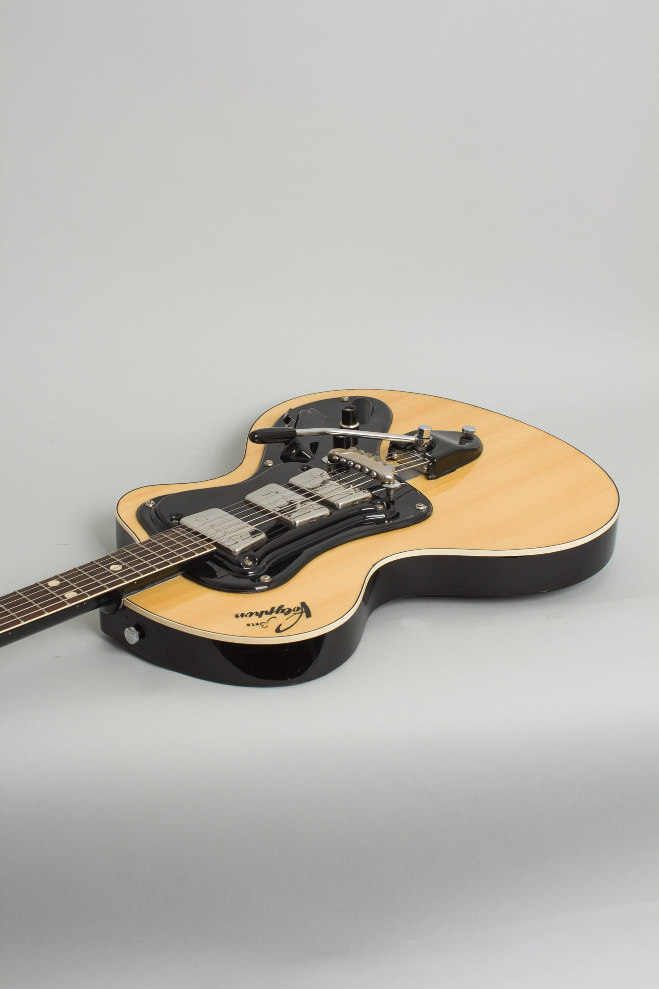 Wandre Polyphon Beta Model Semi-Hollow Body Electric Guitar (1964), made in Cavriago, Italy, natural finish, wood and plastic body, plastic sheathed aluminum neck with rosewood fingerboard, black soft shell case.