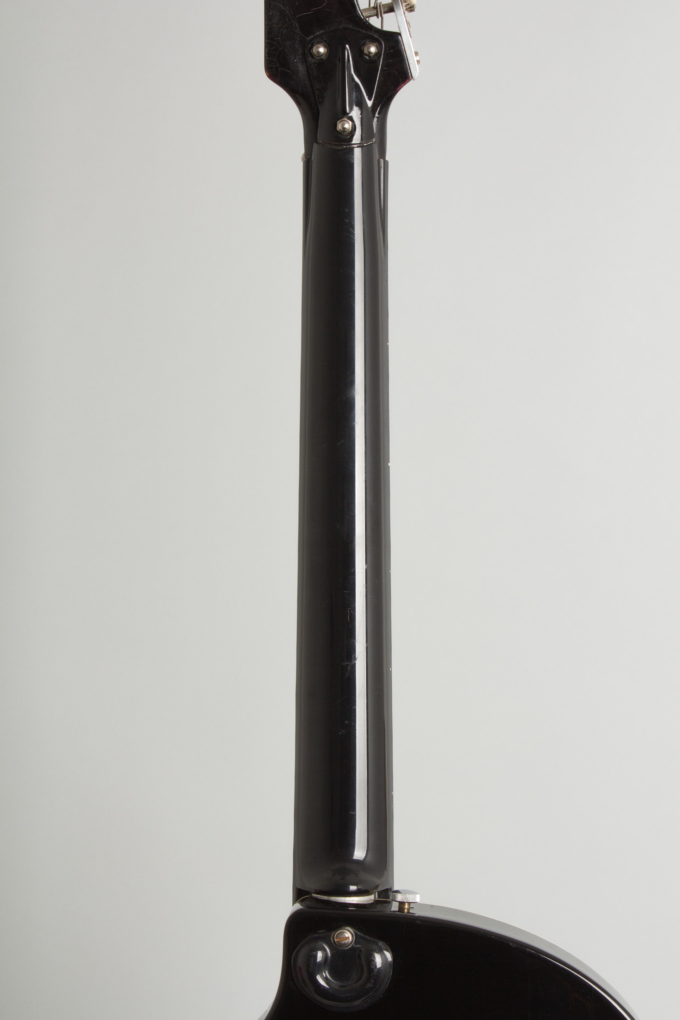 The plastic neck sheath shows no aging distress at all, just a few small nicks and dings and still plays smooth and easy. The "natural" Formica top shows small nicks and dings, but no major wear; the back is in comparable condition. The "Polyphon Beta" applique is even wholly present, never having seen the paint scratched or rubbed off over the years as often happens.