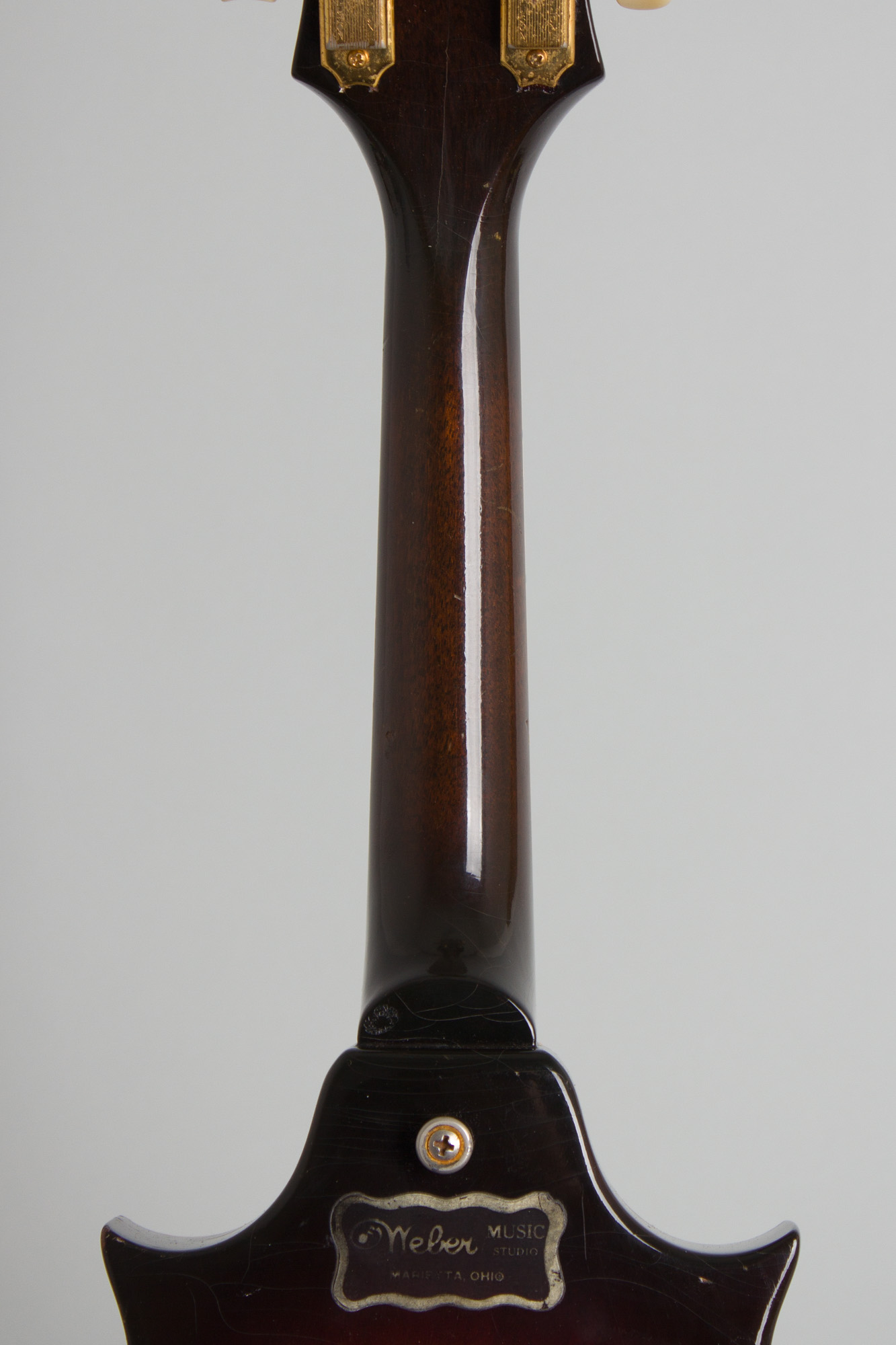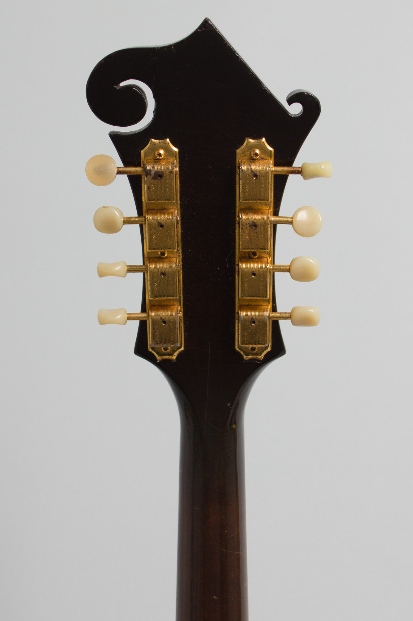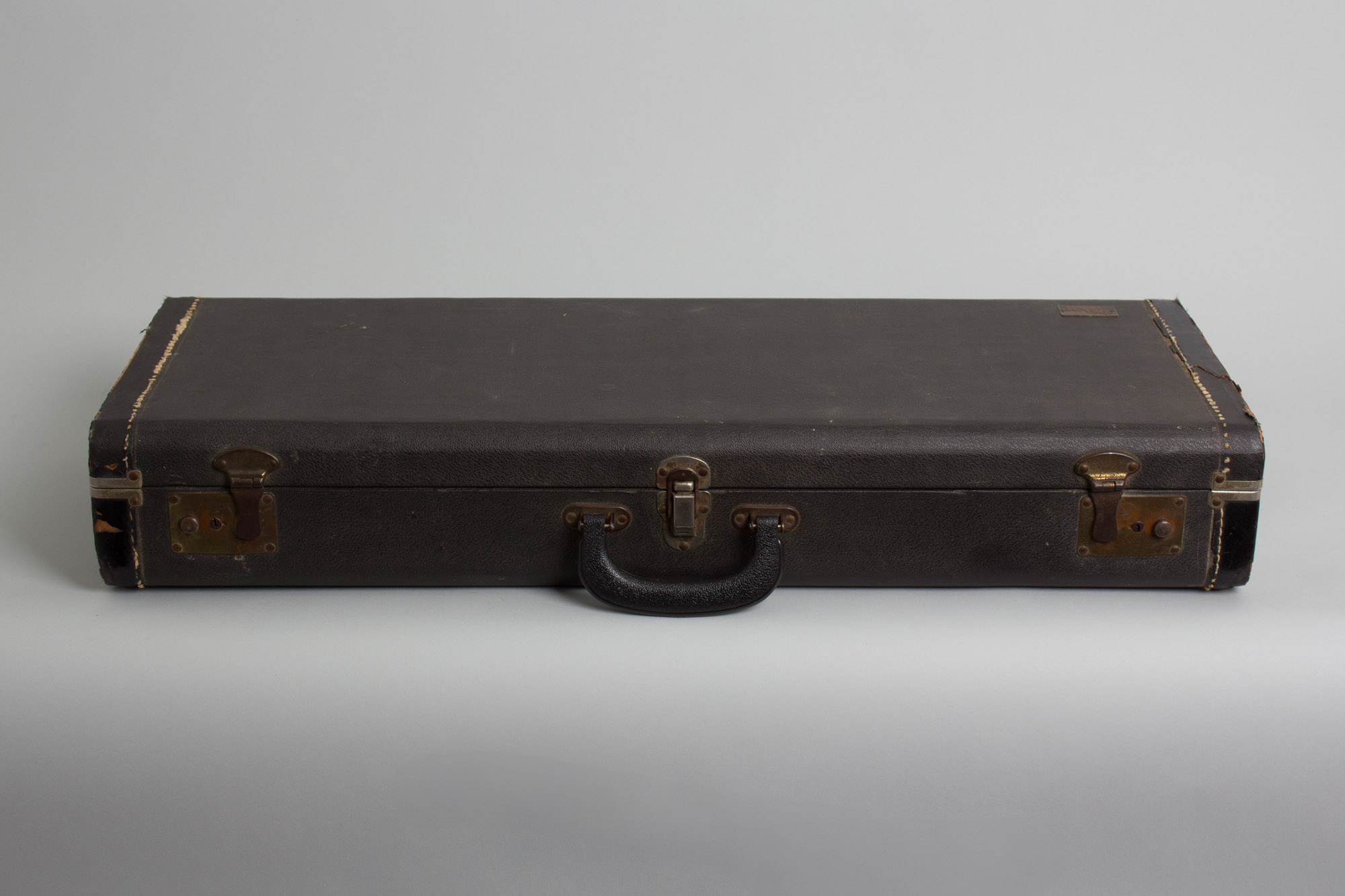 There is a typical scroll repair, well done with just topical touchup but visible. The back of the neck has a check behind the truss rod running from just below the nut up to the level of the first tuner shafts; this does not appear to have opened fully into a crack, or if it did was very solidly and neatly sealed up with no touchup applied. The original frets have been crowned down a bit with little subsequent wear and this is a fine playing and sounding Florentine, still housed in the original deluxe rectangular yellow-lined brown HSC. Overall Very Good + Condition.