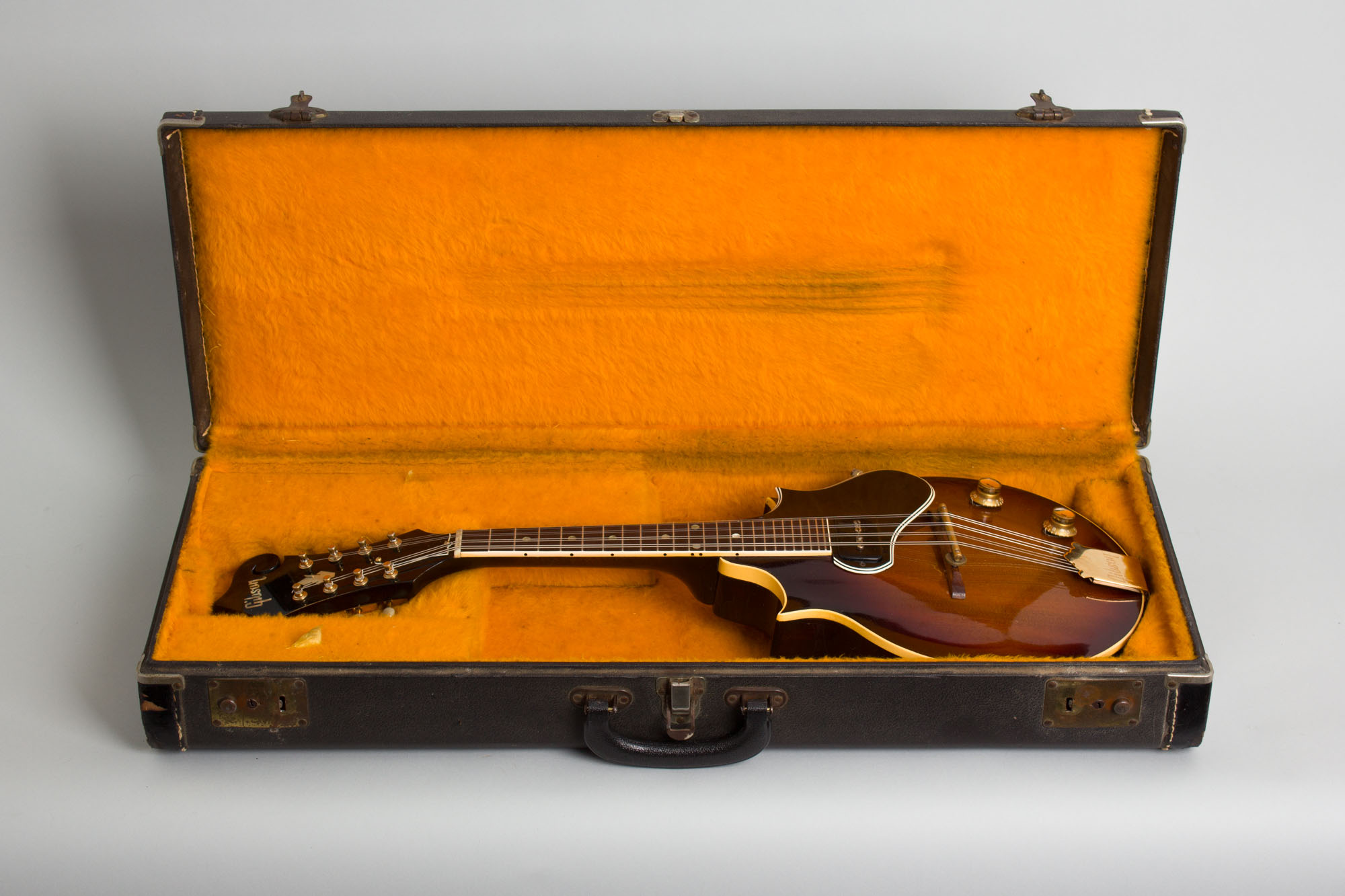 Gibson EM-200 Florentine Model Solid Body Electric Mandolin (1965), made in Kalamazoo, Michigan, serial # 307297, sunburst top, natural back and sides finish, mahogany body and neck, rosewood fingerboard, original black hard shell case.
