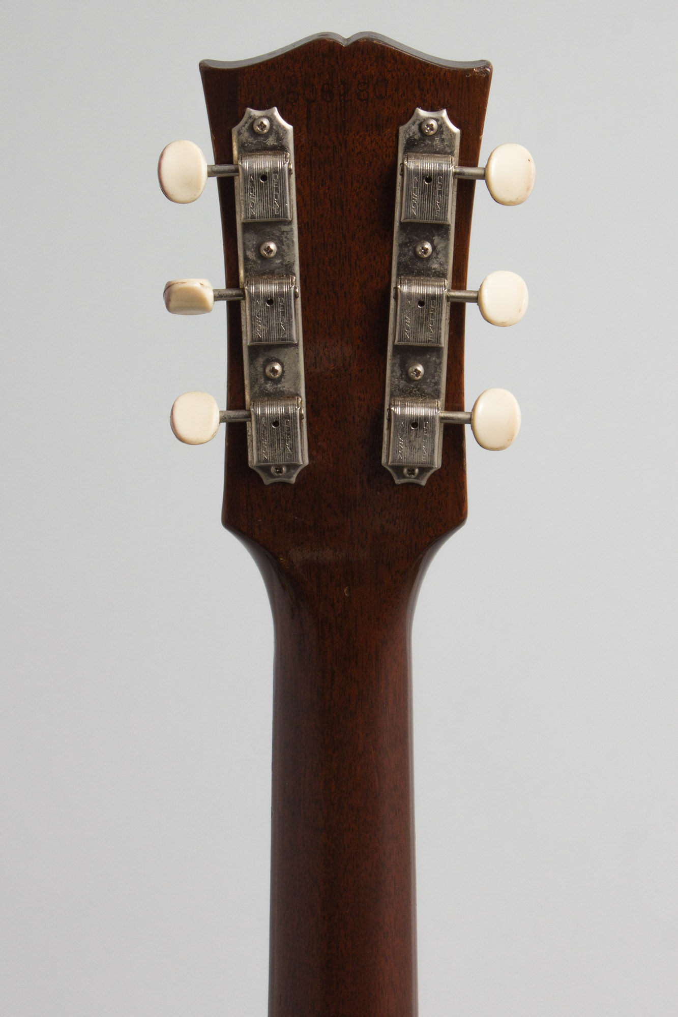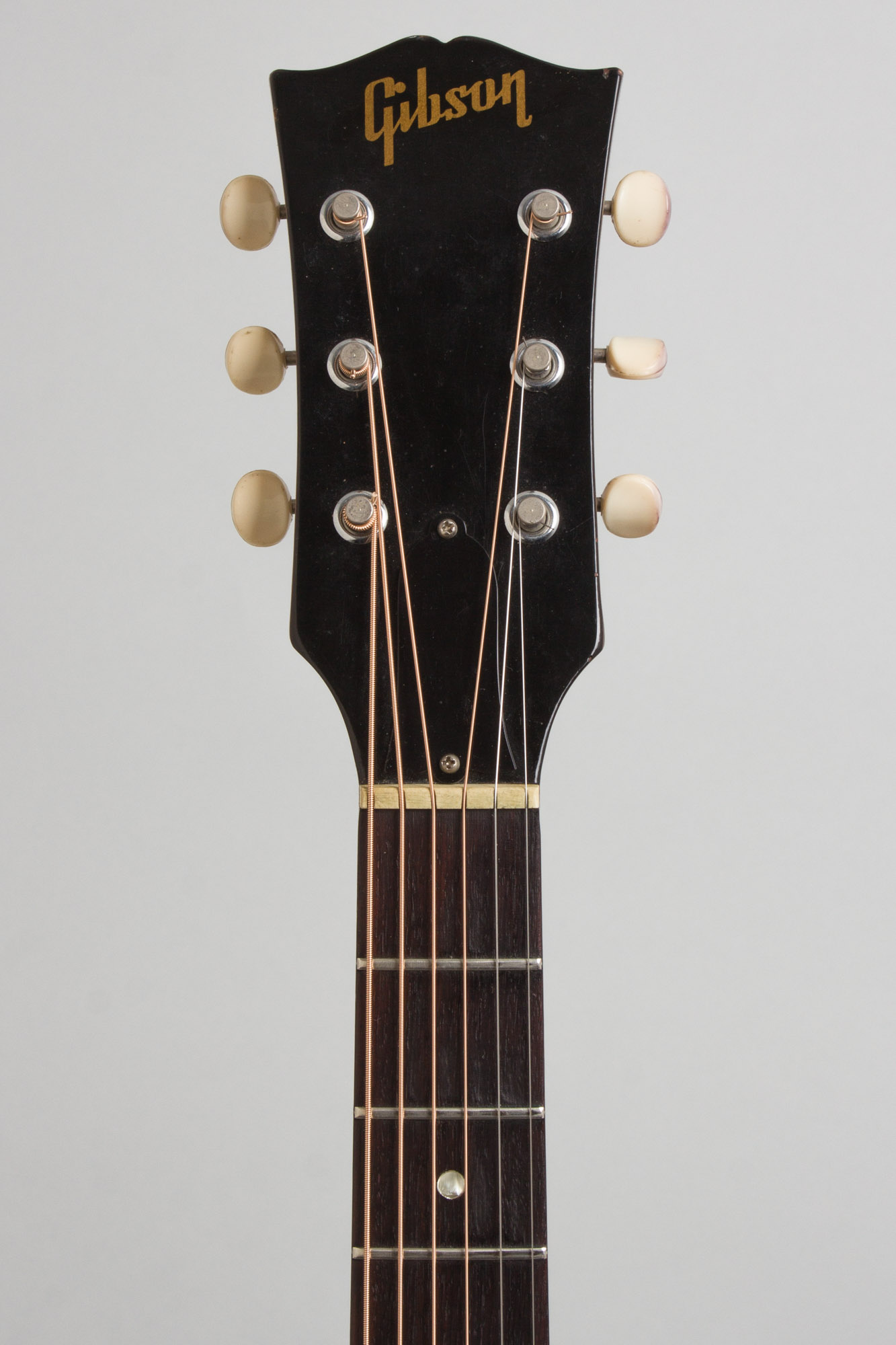 This guitar's serial number is in a series run in both 1965 and 1968; based on the bottom belly bridge design we gauge this to be a '68 model but the other differences are actually fairly minor, mostly the slimmer 1 9/16" nut width on the neck. The J-45 is built with mahogany back, sides and neck with a spruce top and dot-inlaid rosewood fingerboard. The top is actually made up from four pieces of spruce, a fairly unusual feature in this era; perhaps Gibson ran short of that wood for a spell.