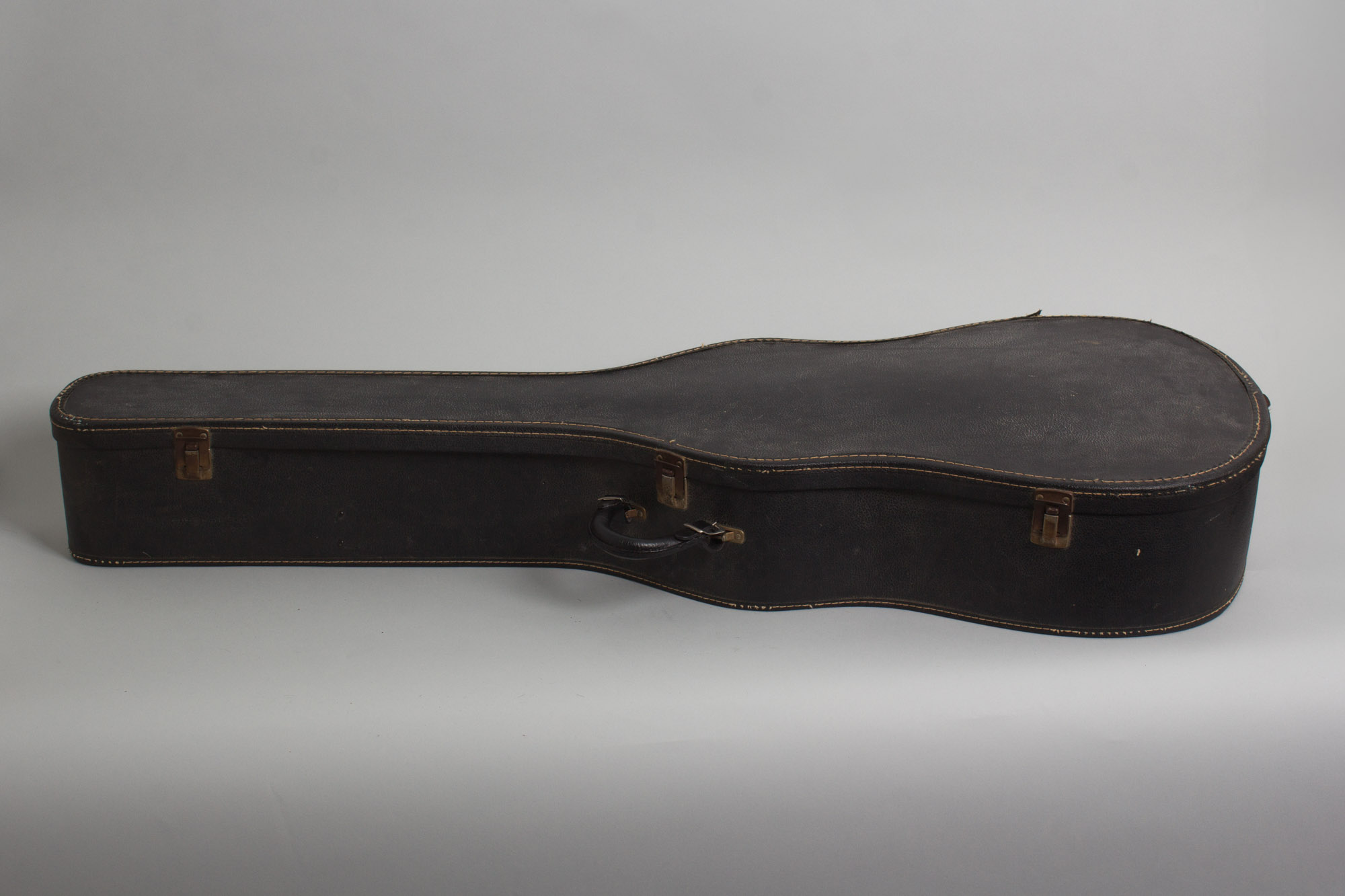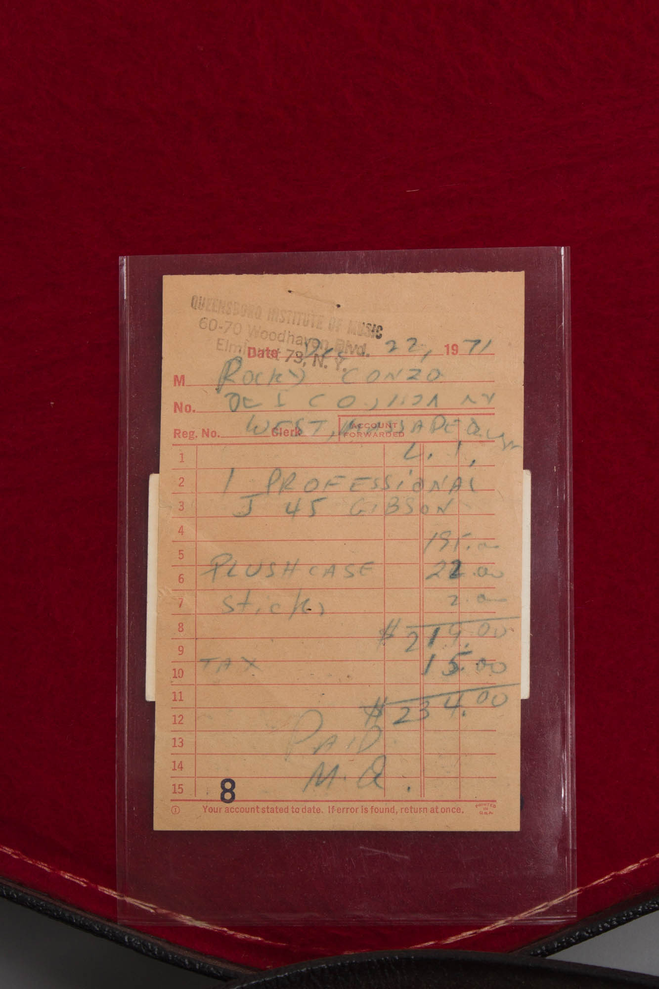 The only notable repair is a one sealed split on the upper bass bout where the upper piece of spruce on the 4-piece top was joined to the center section. Internally the guitar remains original and undisturbed except for a plugged endpin jack hole for a removed pickup, and a small clip for retaining the wire stuck under the top. It has never had a neck reset (the idea of the adjustable bridge in the first place!) and is an excellent player with a fairly bright, midrangey sound typical of later '60s Gibsons. This is nice find in a '60s J-45, complete in the original chipboard case with a receipt indicating it was bought in 1971 from the Queensboro Institute of Music, a familiar name to old-timers from the area. Overall Excellent Condition.