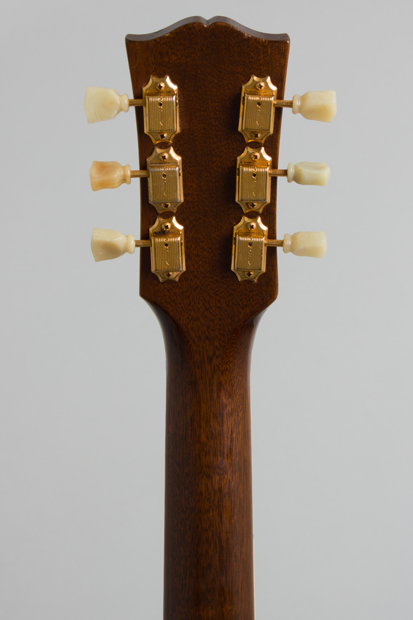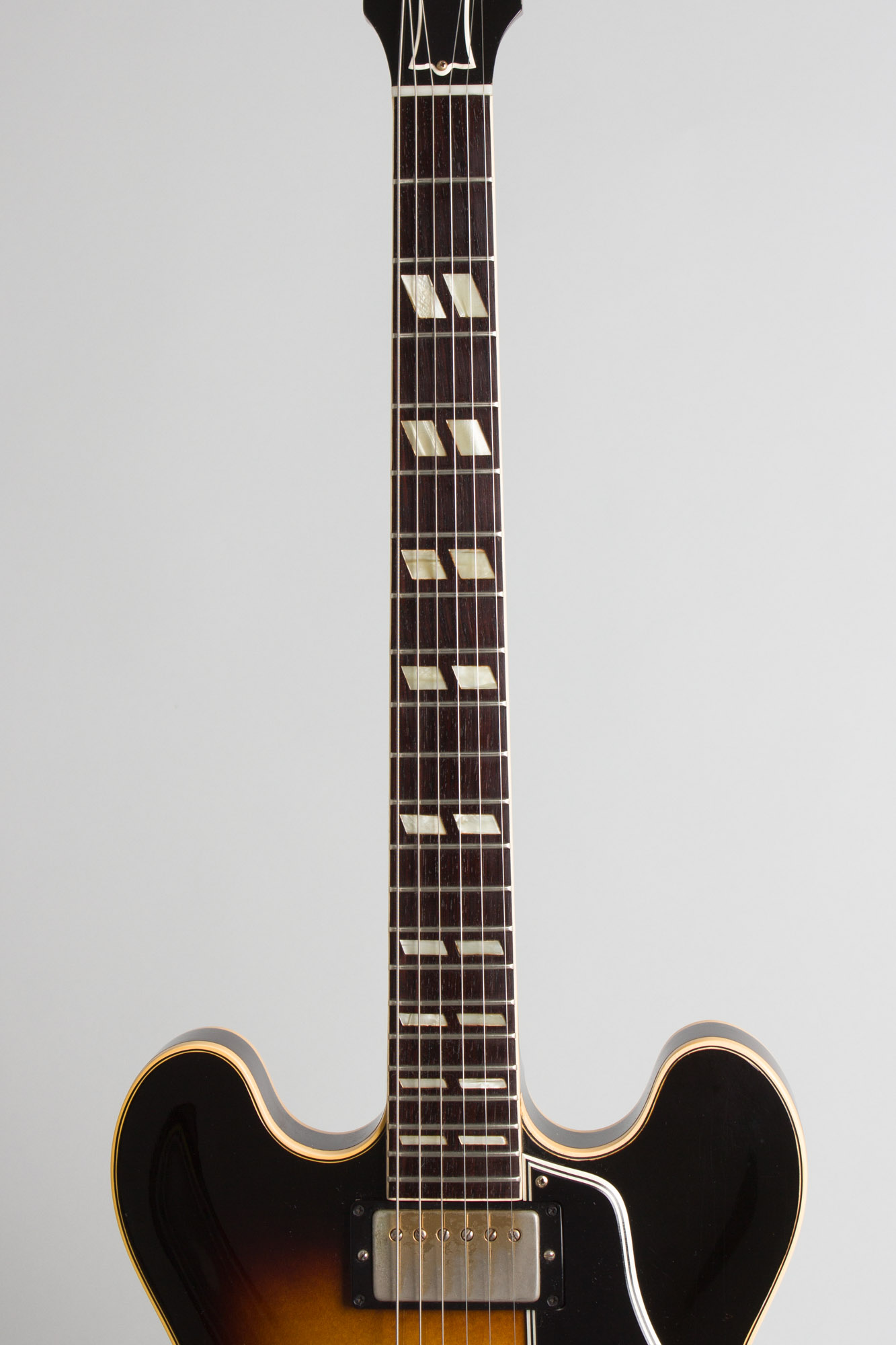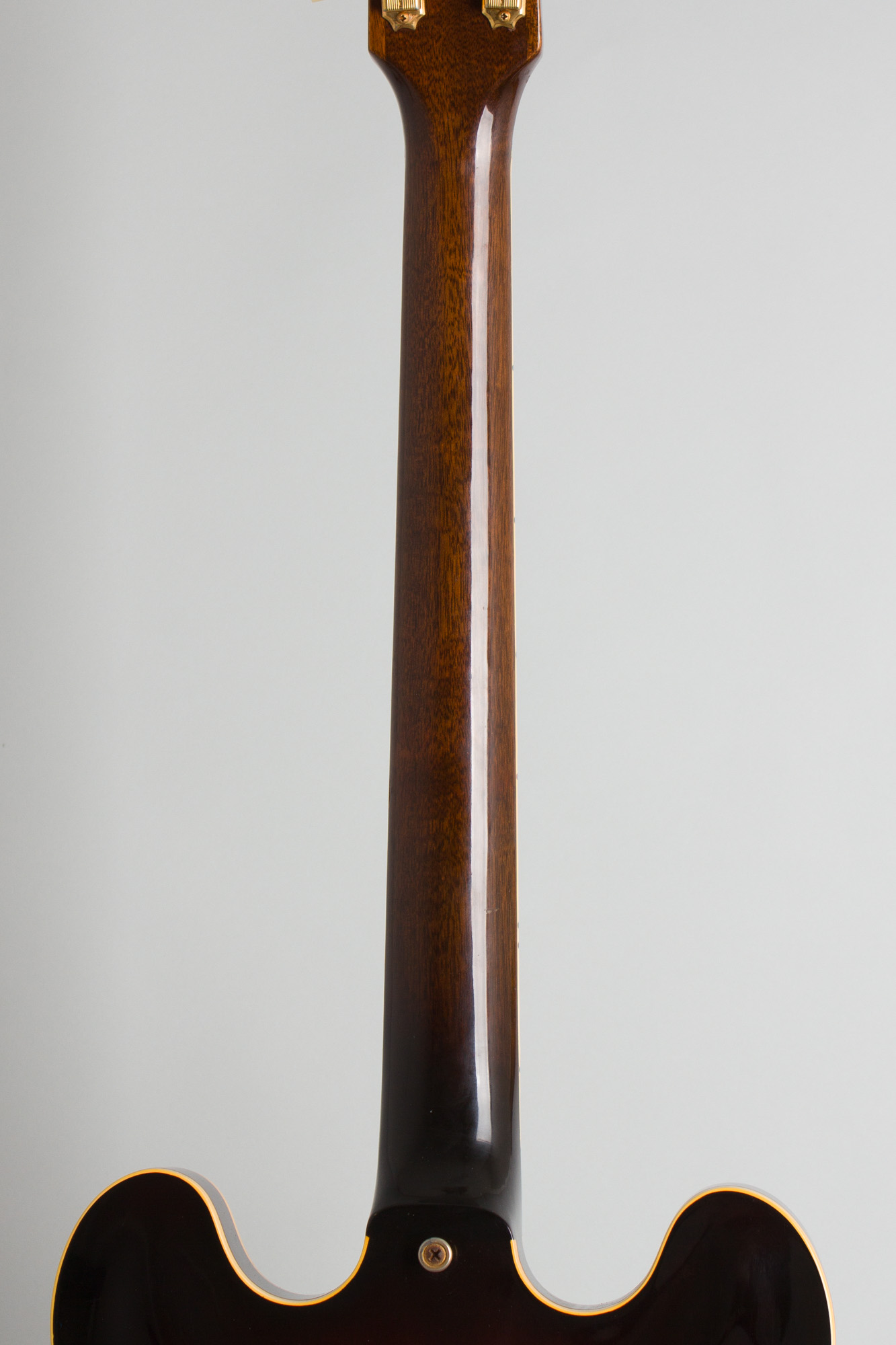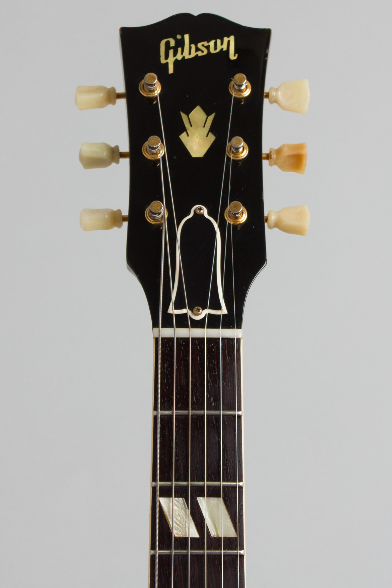 Essentially a somewhat fancier version of the recently launched thinline semi-hollow ES-335, the 345 was added to the line in spring 1959. This model retained the 335's semi-hollow thinline 16" body but was dressed up a bit adding gold plating, a bit of extra binding and trapezoid pearloid fingerboard inlay to the mix. The "A" Artist serial number on the label under the bass soundhole indicates this guitar was shipped in December 1959. The neck profile is round-backed but quite a bit slimmer than earlier '59 examples, feeling like the transition to the slim, flat 1960 profile had already begun. The longer pickguard extending past the bridge is another characteristics of the early models.