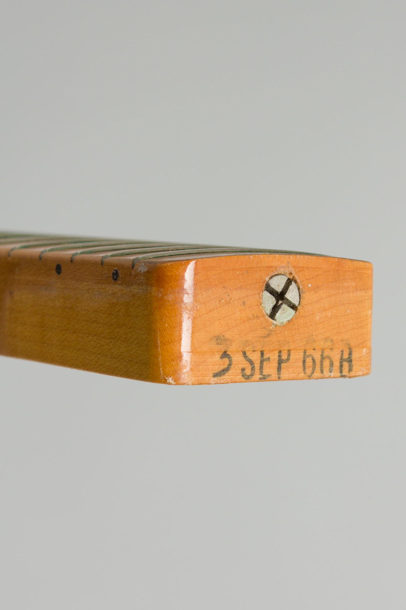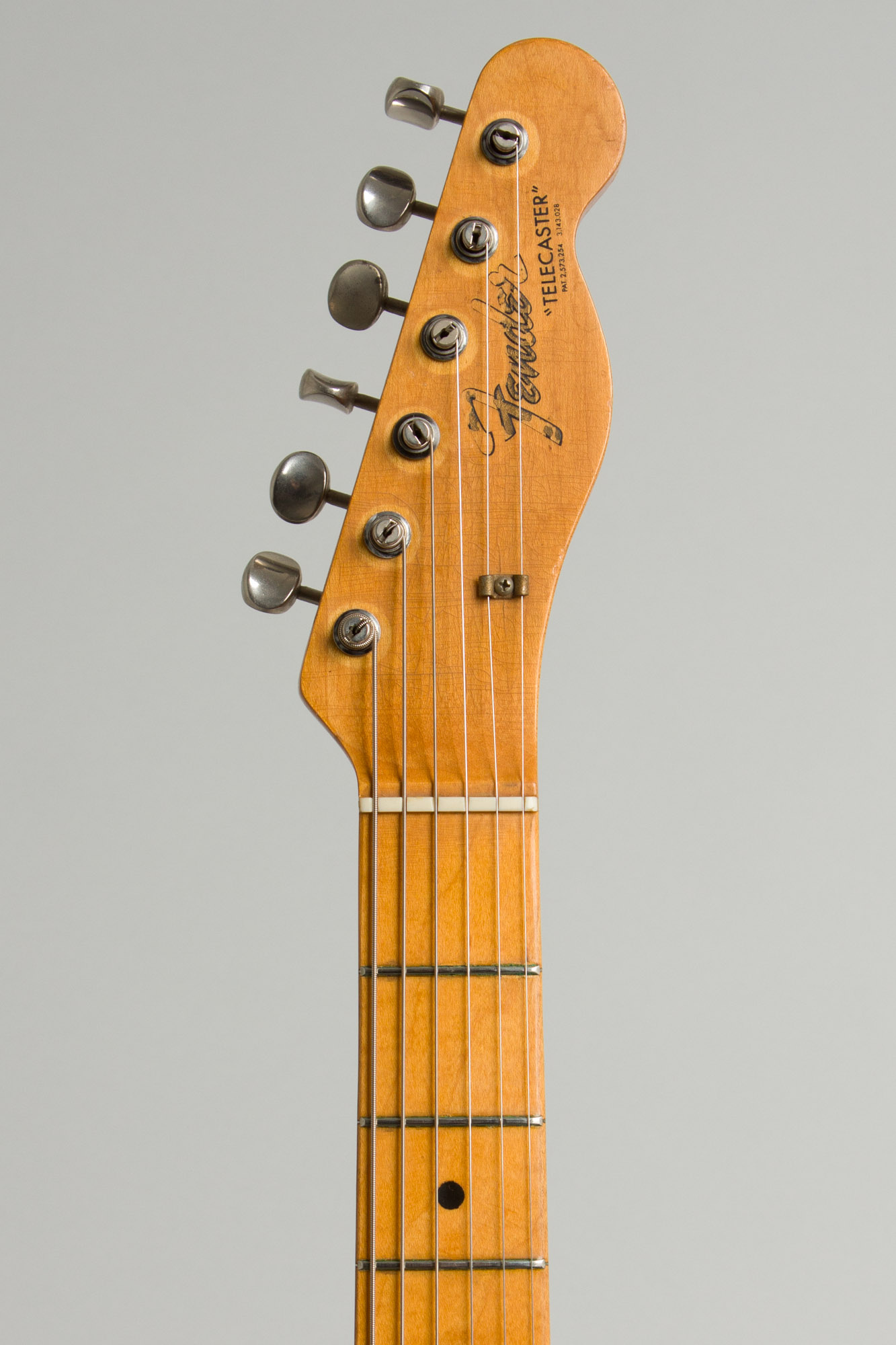The neck retains the original finish with some ambering of the lacquer but actually not that much wear. The headstock has checked and darkened somewhat; the Fender logo decal is fairly well worn with much of the gold fill missing but the black outline largely intact. The tuners have been restored to correct double line Kluson Deluxe machines, rings visible on headstock face and hidden screw holes on the back indicate Mini-Schallers were once installed. What appear to be the original frets have been crowned down fairly low showing some subsequent wear; They play well enough but if you prefer a larger fretwire then this guitar will soon be ready for a refret. The nut appears original.
