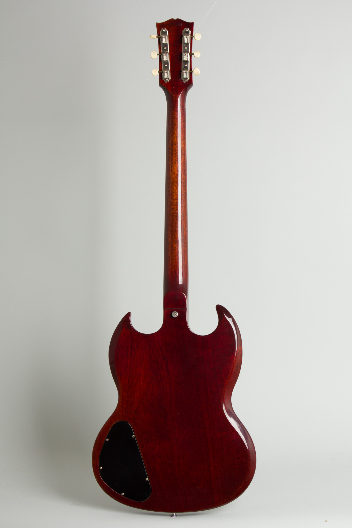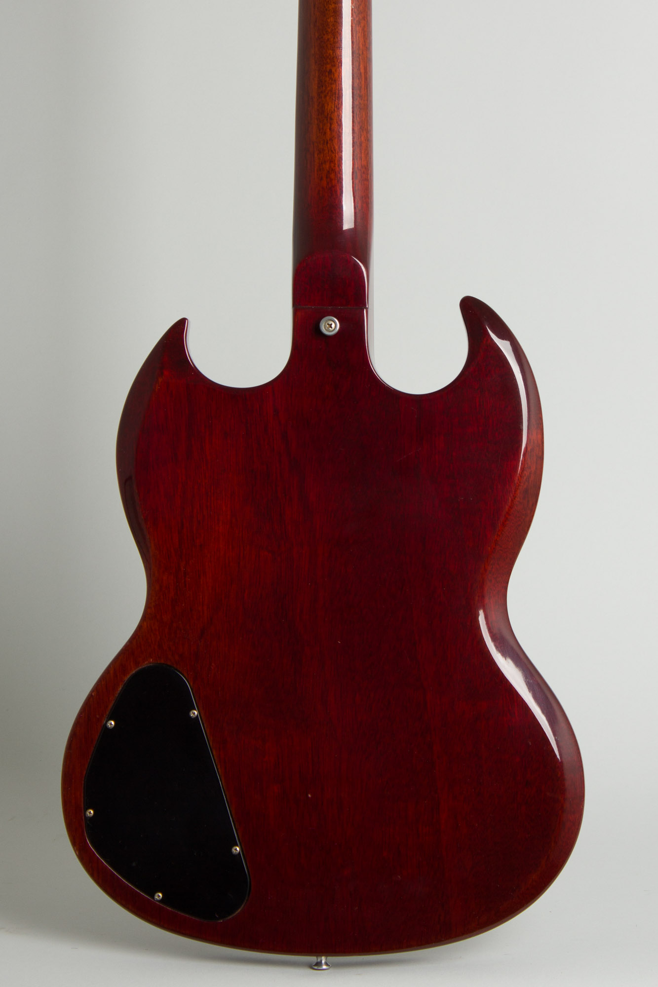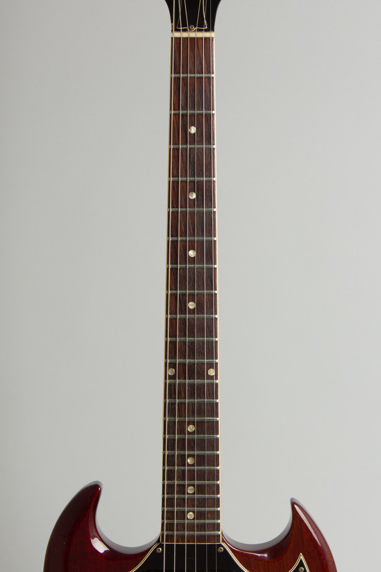 This is a very nice example of the later 1960's style SG Special, clean overall and an excellent player. The guitar mounts two hot P-90 pickups in the larger pickguard adopted in 1966, when the SG series was redesigned to use a single universally routed body for all variants. It also has the streamlined and much more solid neck joint adopted at the same time, which finally cured the heel issues that often plagued earlier SG's. The cherry finish is darker than earlier examples, with an almost burgundy hue.
