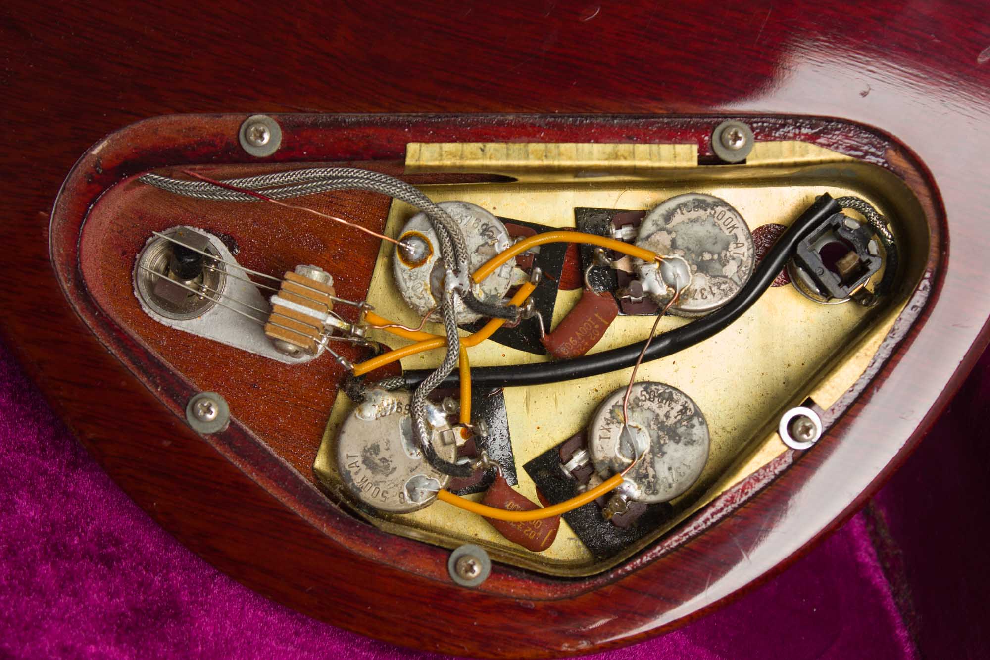 The guitar carries all chrome hardware, including the "short" Vibrola and solid bridge that were standard fittings used throughout the '60's. The plastic "Witch Hat" amp style knobs are particular to this later '60s period. The only hardware not original are the Kluson Deluxe strip tuners; this guitar has had several tuner fittings over the decades. The pickups are the original P-90's mated to an untouched wiring rig with pots dated the 34th week of 1969.