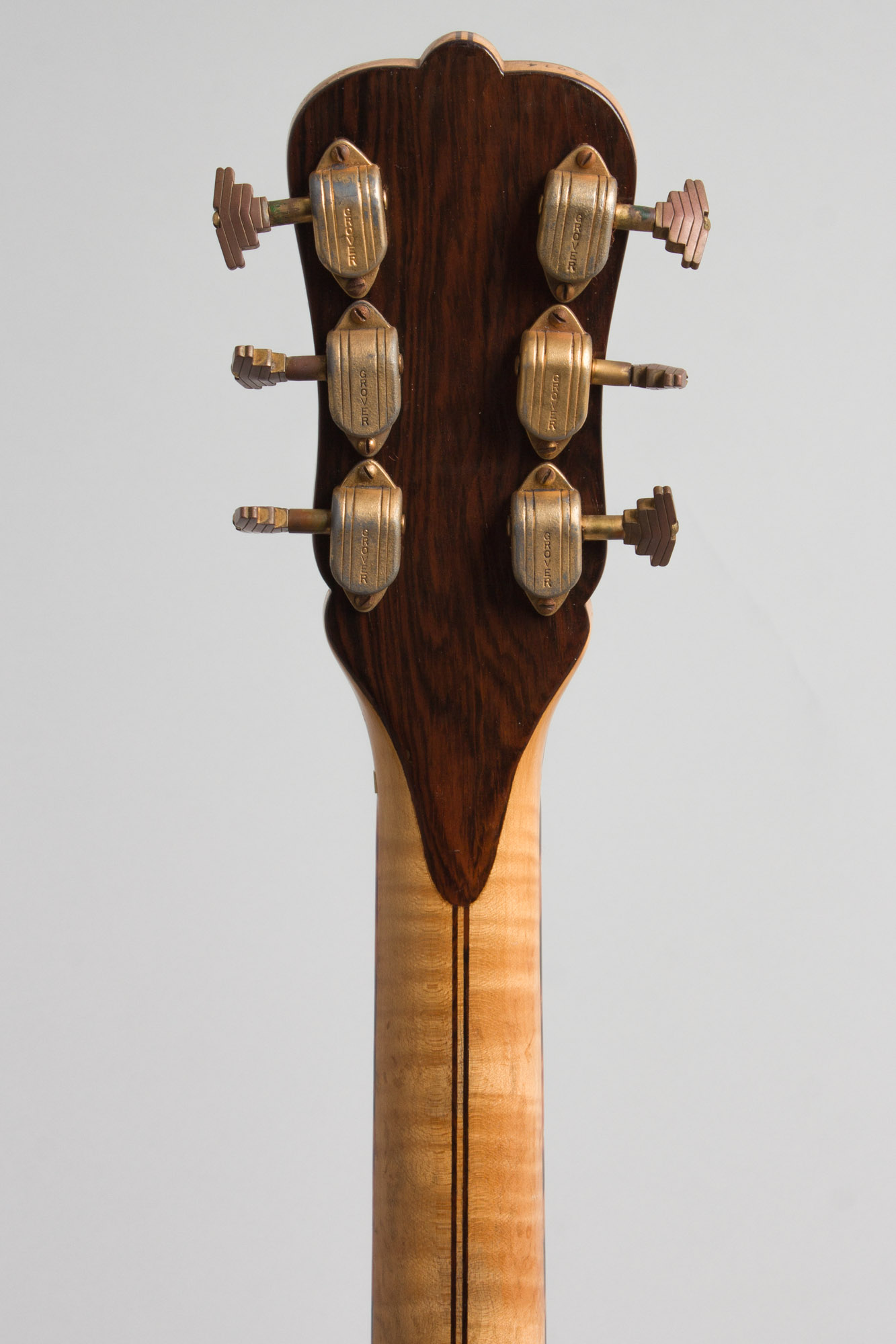 This guitar has many layers of binding everywhere with a striking boldly grained tortoise celluloid outer layer, including the "Light bulb" headstock, extended pickguard and ebony fingerboard, which has shaped split block inlay. The gold-plated tuners are the pre-war style Grover Imperials considered the best available the same time. The original "Synchronized" carved rosewood bridge and "Chromatic" harp-like tailpiece are stylish deco sculptures in their own right. This guitar plays very well and sounds fabulous, simply a superb Brooklyn rarity and one of the most individual and unique of all 1940s archtops.