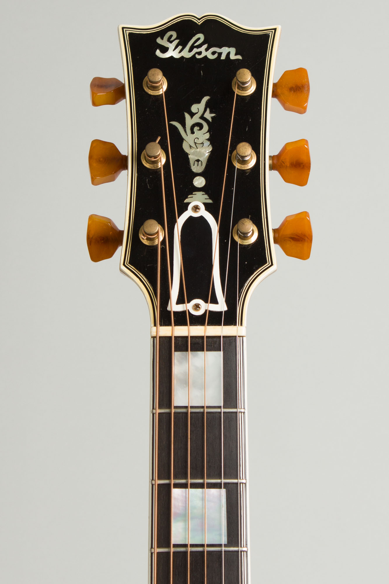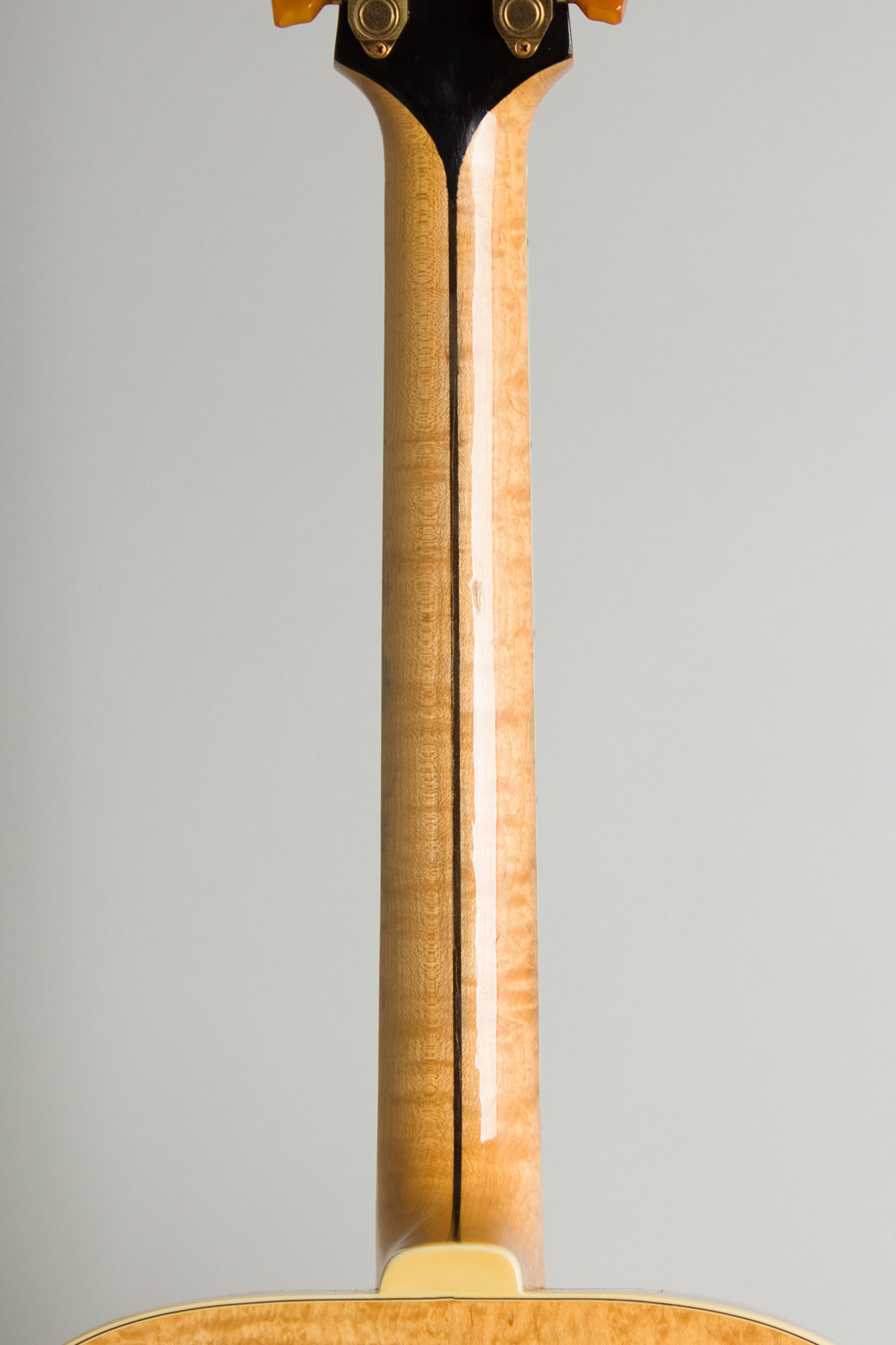 The multi-bound carved spruce top features a clear natural finish that has aged nicely to a lovely amber hue. The 2-piece carved maple back has some lovely is uneven grain figure, with more flame on the lower half and burl on the top. The 3-piece maple neck with an ebony center strip is carved slimmer than some, with a hint of a "V" in the lower positions. The multi-bound headstock features the prewar script logo above the traditional L-5 "Flowerpot" inlay. The tuners are gold-plated Kluson Sealfasts with translucent celluloid "keystone" buttons, a particularly attractive feature just introduced in 1940. The multi-bound, pearl-block inlaid fingerboard is high-grade ebony.