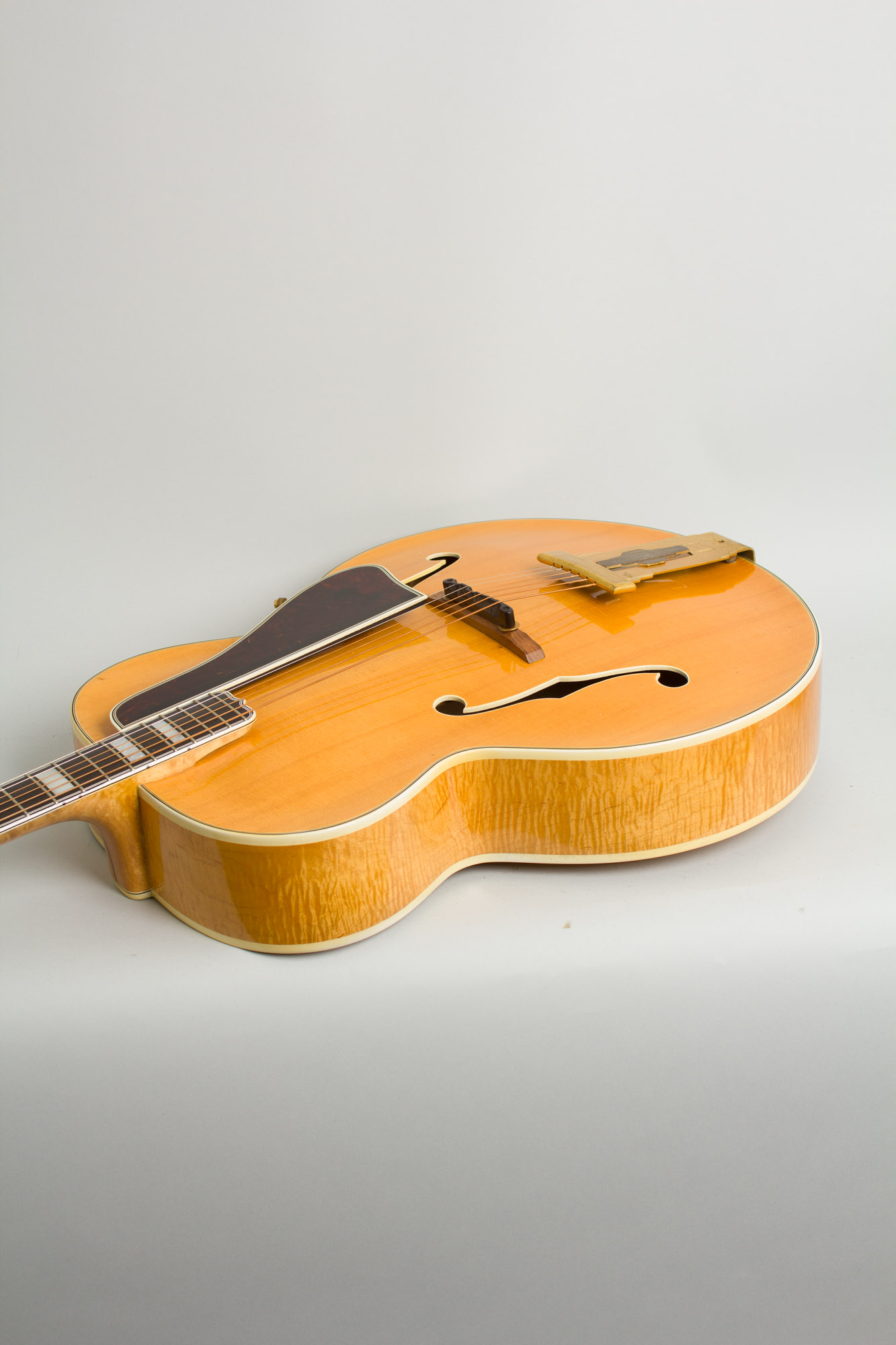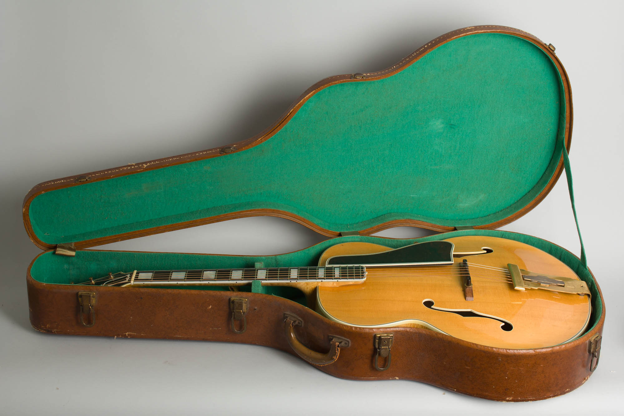 This stunningly beautiful carved-top Gibson is one of only a relative handful of natural finish L-5s shipped out before WWII, and remains beautifully original and very well-preserved. In 1940 a natural finish was one of Gibson's big new ideas, and it was heavily promoted by the company at the time. The most recently researched shipping totals show 41 blonde L-5s shipped in 1941 (followed by 25 in 1942) before the war ended production for a time. This one bears a FON (Factory Order Number) 4584G which indicates a 1941 production date; the label is partially torn missing the last two digits of the serial number but the first three are sufficient to confirm shipment later that same year.