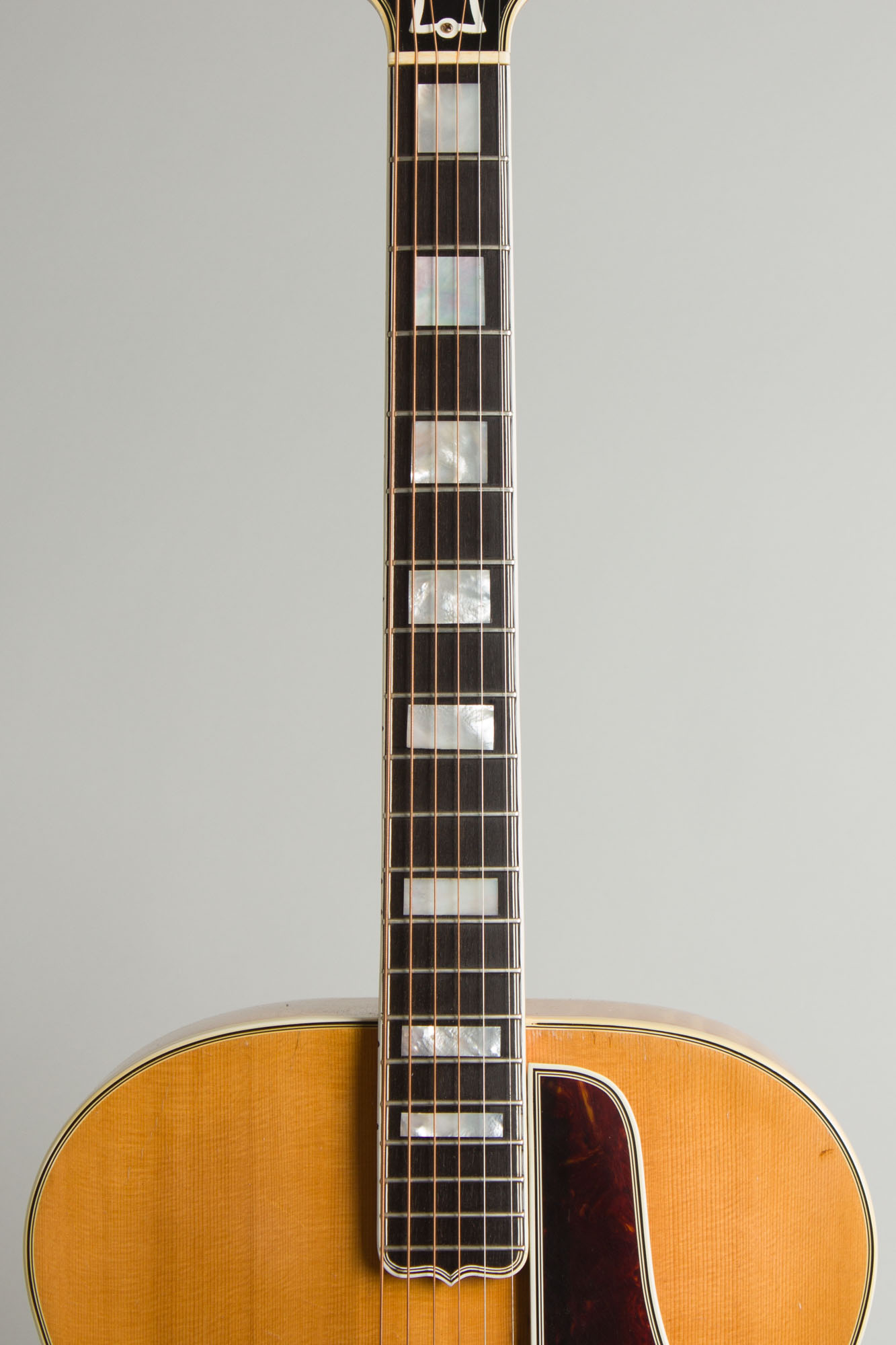 In this period the L-5 was ranked second to the 18" Super 400 in Gibson's line, but many players always preferred the 17" body and it was always a top professional choice. This is a splendid example of a high-deco swing-era blonde L-5, simply as classy an archtop guitar as it gets. This is also an excellent-playing and sounding instrument, with a big incisive tone that rings for days yet never sounds shrill.