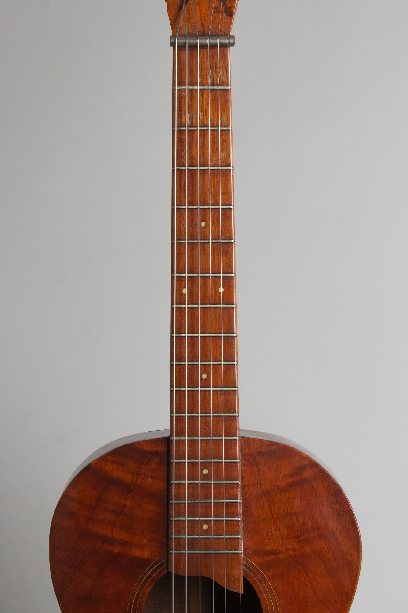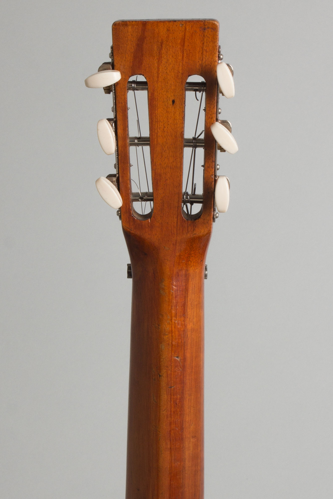 Kamaka guitars were built primarily for local Island musicians, so they remain little known outside Hawaii as there was no reason to export them to the Mainland where guitars were plentiful. This example has all the hallmarks of one built in the 1920s or early '30s. It is a Hawaiian-style instrument set up for steel playing constructed entirely of Hawaiian koa. Like Hawaiian ukuleles the top is flat but the back is slightly arched, held that way by heavy braces. The wood has some dramatic figuring, particularly on the beautifully bookmatched back. The top is braced in a very simple "A" pattern with very stout straight braces in front and back of the soundhole and a couple of short pieces angled back towards the bridge. There is a reinforcing strip down the center seam but no bridgeplate, true to its ukulele roots.