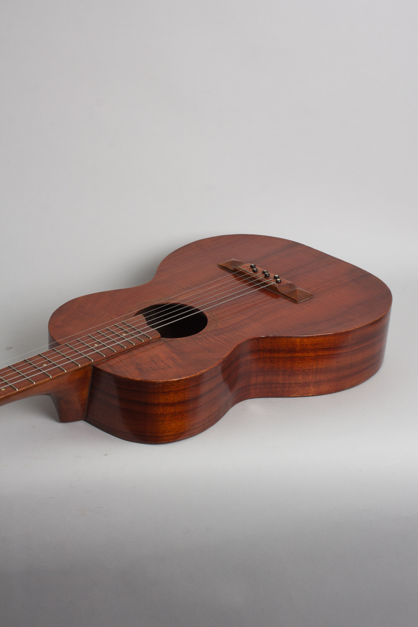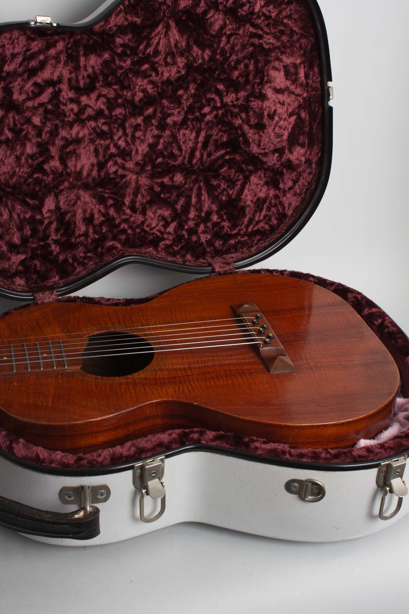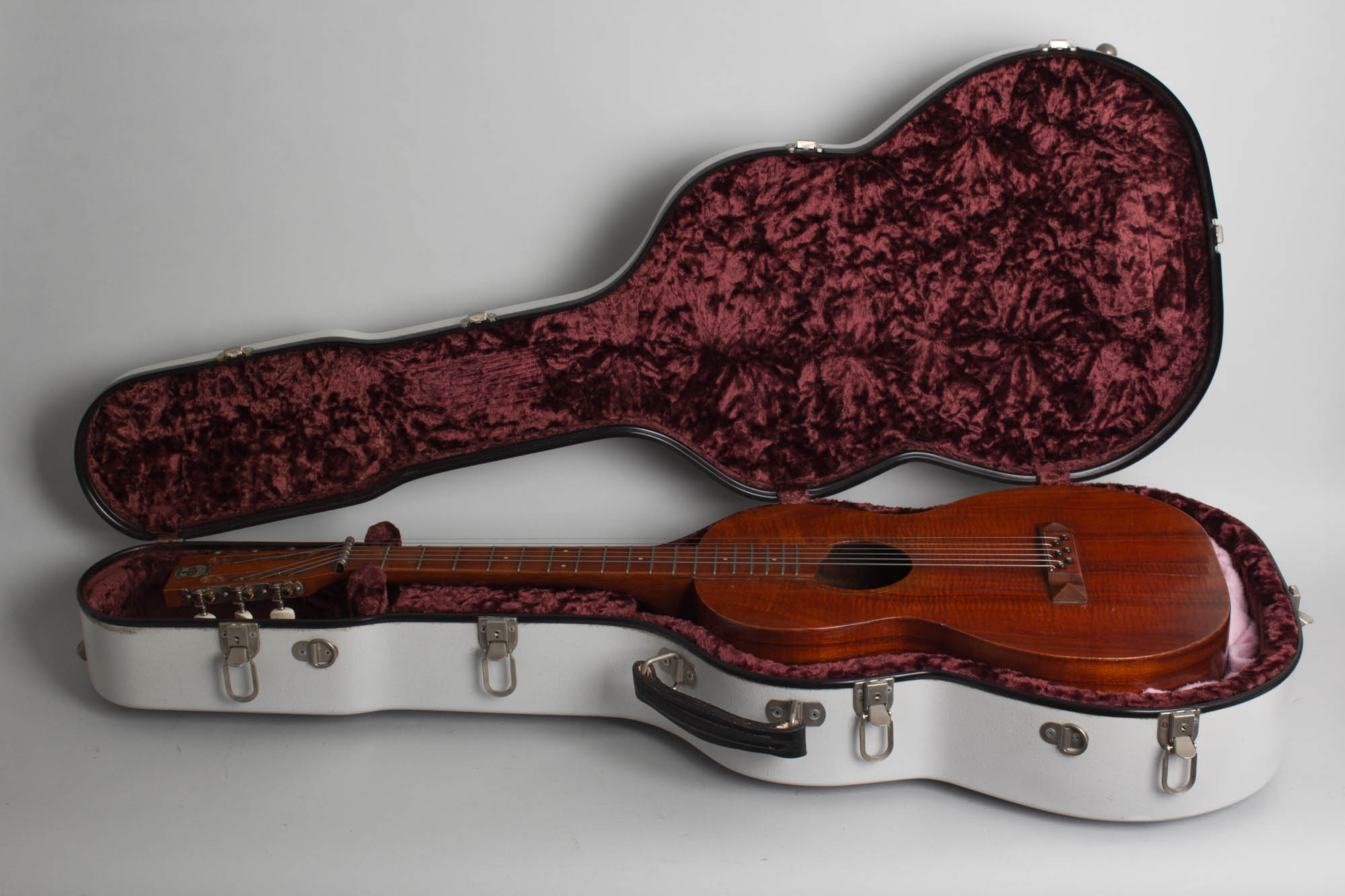 As noted this instrument is set up in the Hawaiian style for steel playing, although it appears someone once played it "Spanish" style as there is some light wear to the fingerboard. The neck angle makes that unfeasible for most players today and the Spanish heel construction precludes a Martin style neck reset; it is likely the guitar was built as a Hawaiian style instrument from the beginning. The tone is lovely and different from most other lap style guitars, rich with surprising depth for a smaller body guitar. This is simply gorgeous, playable piece of history that rings out with the true Island sound with every glissando. It includes a high-grade molded fiberglass Calton hardshell case. Very Good + Condition.