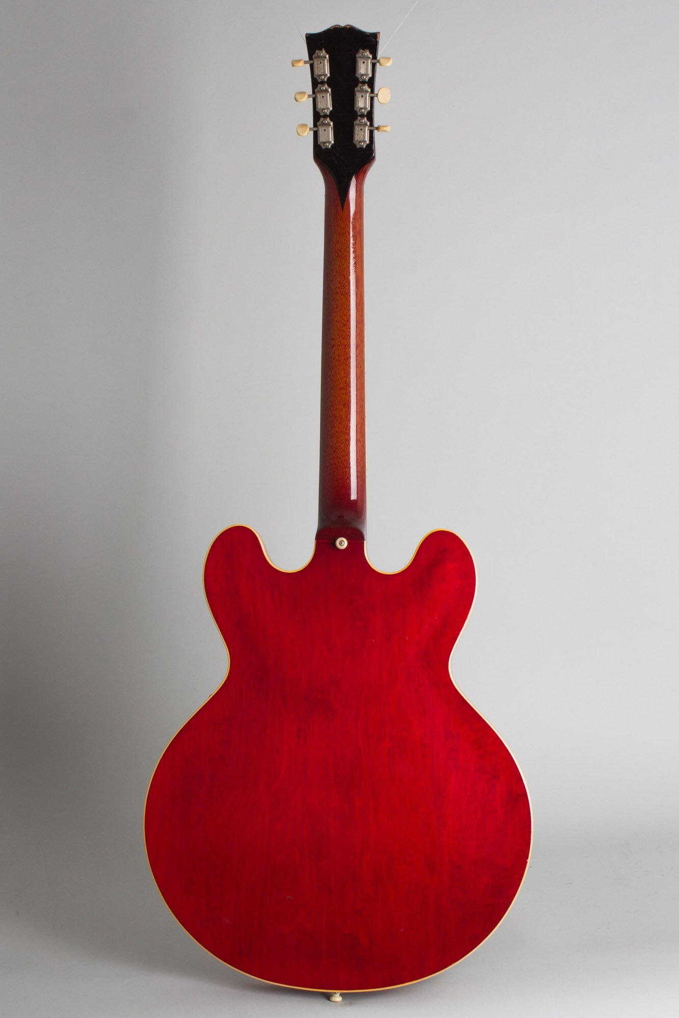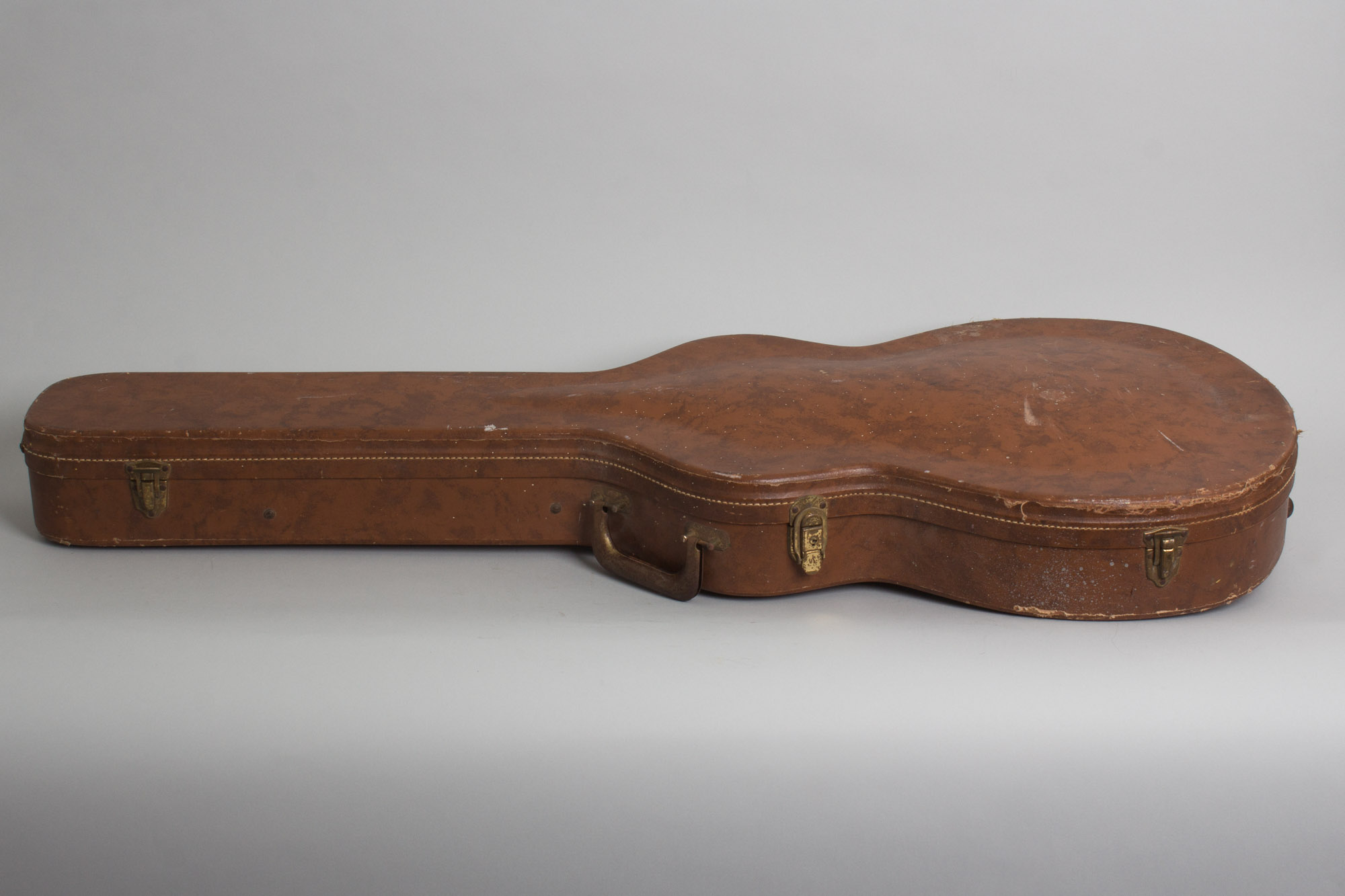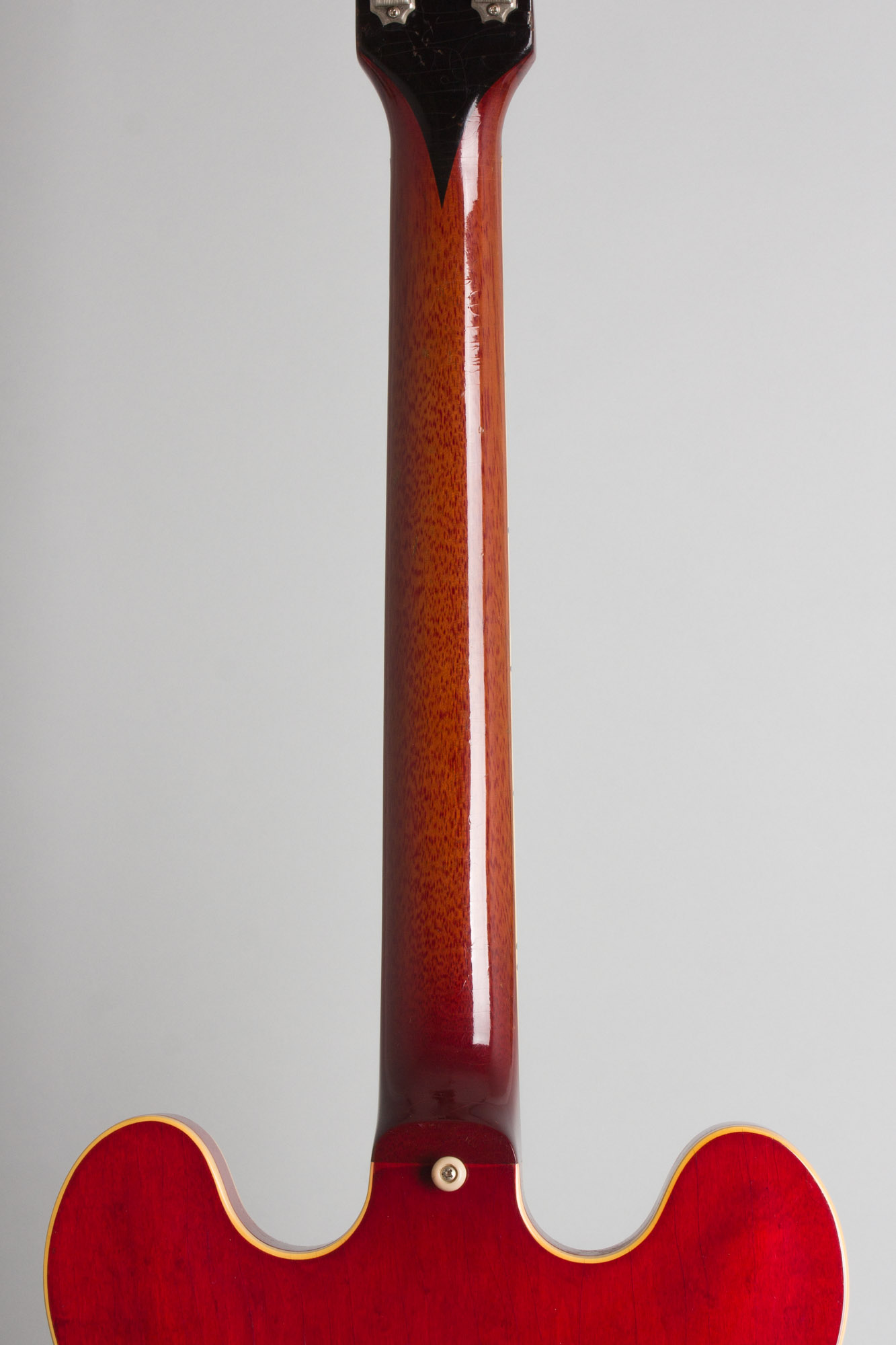 The only alteration is a period Gibson white plastic strap button fitted to the heel; this is almost ubiquitous on this model and was likely done by the original dealer. All hardware is original except the tuners, which are period correct but the "double line" casings indicate they date to the 1964 and after period; there are no errant marks from any other style machines. There is light wear to the nickel plating overall. The original frets show some light wear as do the lower positions of fingerboard. This is a fine-playing and sounding guitar complete in a worn but solid original brown Gibson HSC, which also correct for the period ES-335/45 and has some substantial value in itself. Overall Excellent - Condition.