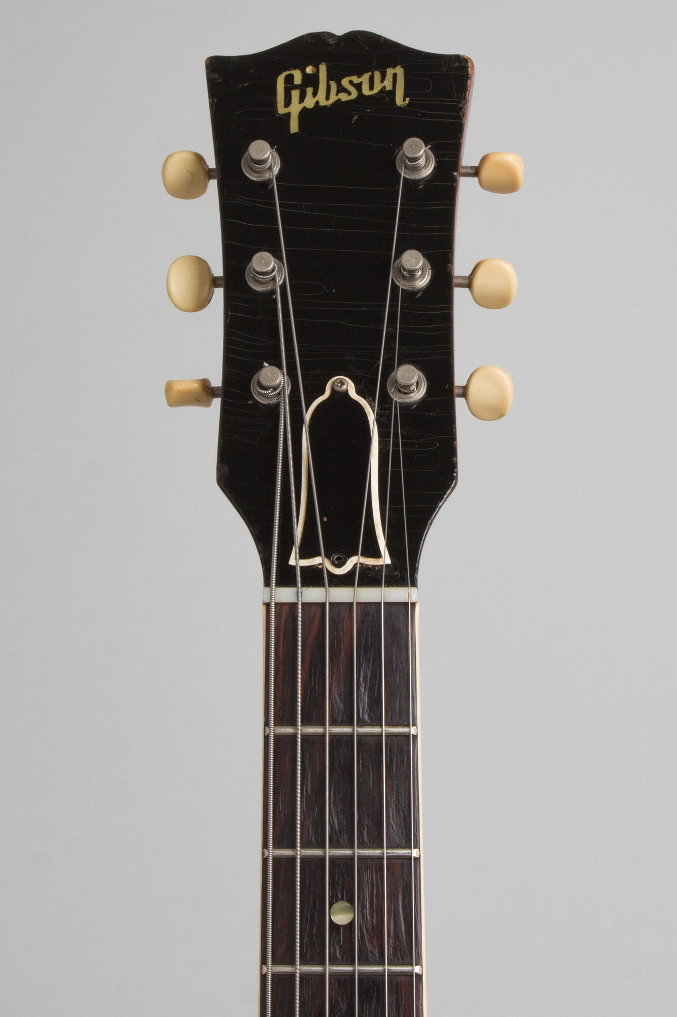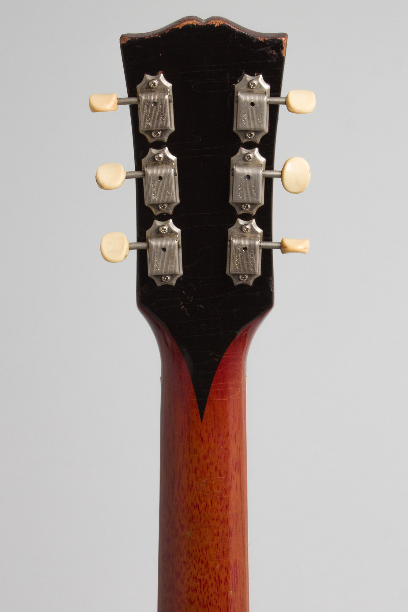 Regardless of when it was sent out into the world, this guitar was built in later 1960 and shows first-generation ES-330 features including the bound dot inlaid rosewood fingerboard, rounder "Mickey Mouse" cutaway horns on the body and a black plastic P-90 pickup cover. The nickel-plated ABR-1 Tune-O-Matic bridge is the first "no-wire" pattern with nickel saddles. The single-bound body is fully hollow with a deep cherry finish and the neck joins at the 16th fret, in common with all early ES-330 variants. This one has something we rarely see on 330's, a black painted headstock rear with a "stinger" pointing down the neck. This was a Gibson factory trick usually used to cover some cosmetic flaw, but it actually is quite attractive and gives the guitar a bit more class than usual. There ARE actually "stinger" collectors out there!