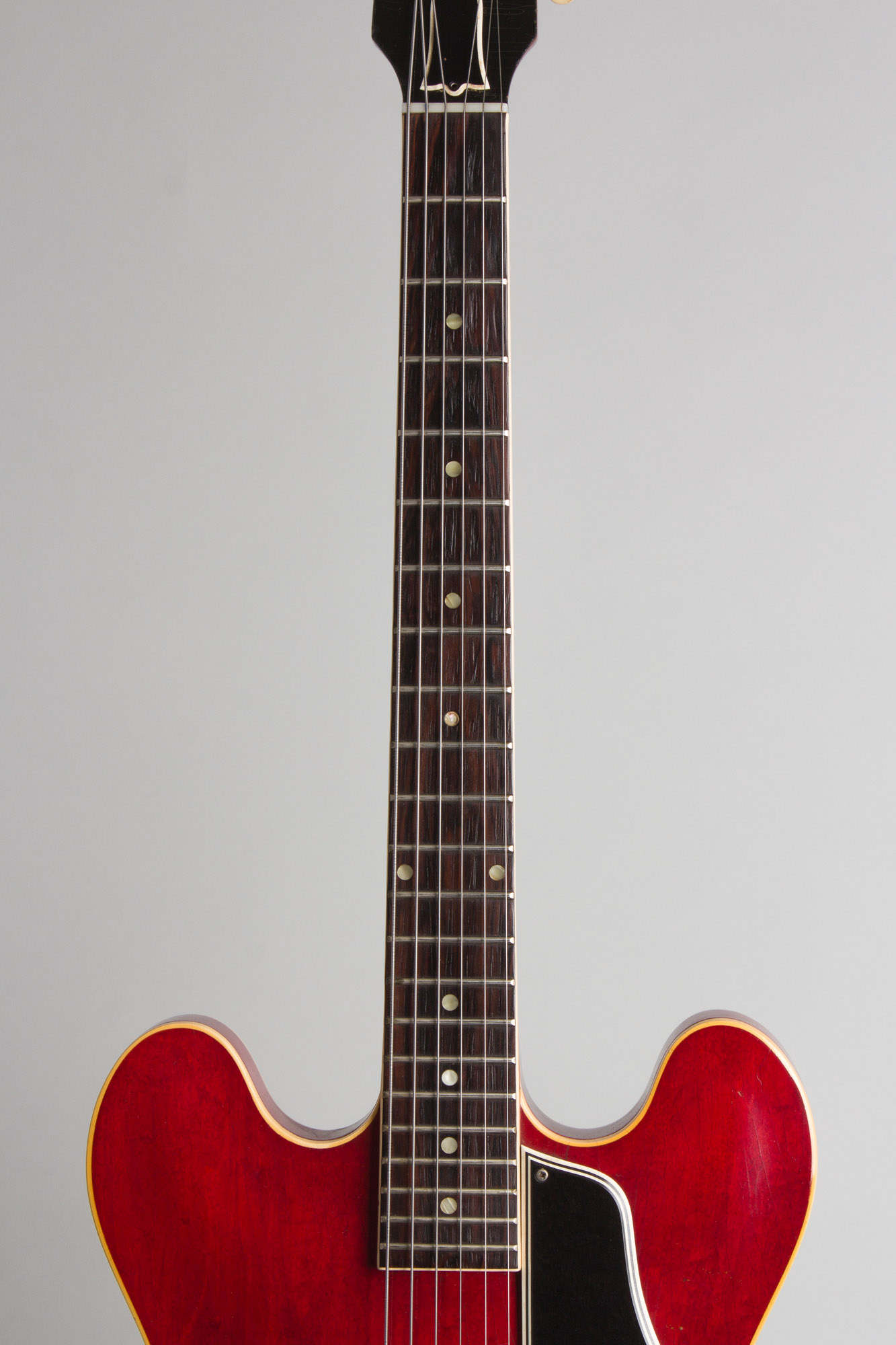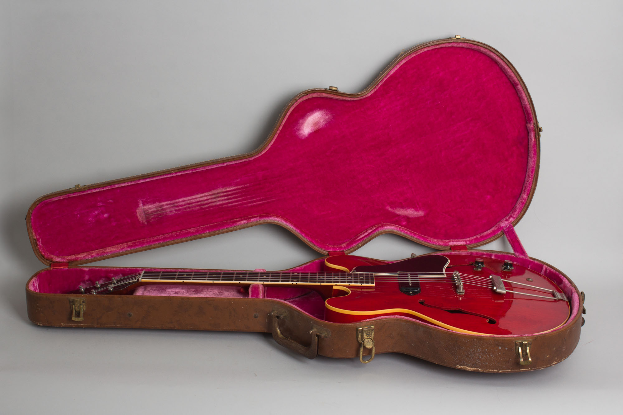 This is a nice original example of one of the very first cherry-finish Gibson ES-330T models from 1960, the initial year of production. The ES-330T (with no "D") was the relatively short-lived single pickup version of the popular ES-330TD, one of Gibson's big successes in the early-mid 1960s. By comparison the cherry single-pickup ES-330 is a fairly rare guitar, with only 582 produced from 1960-'63. all of 37 cherry finish 330Ts are listed as having been shipped in 1960; this option replaced an even rarer natural version towards the end of that year. This one has a factory order number dating to 1960 but as these were applied early in construction it is possible it was actually sold in 1961, one of 214 registered that year.