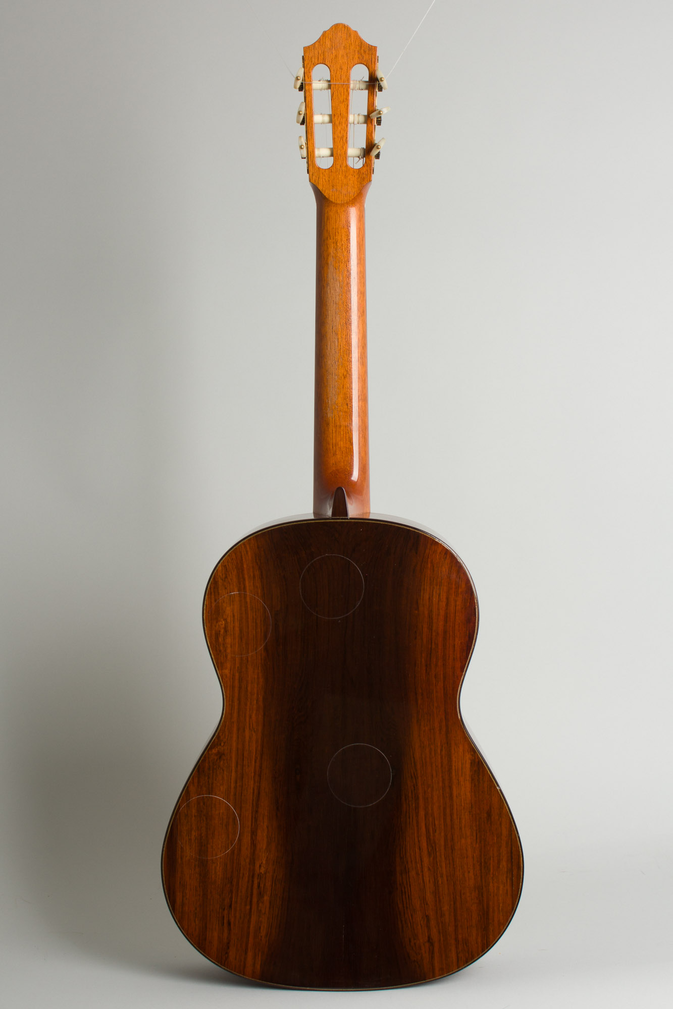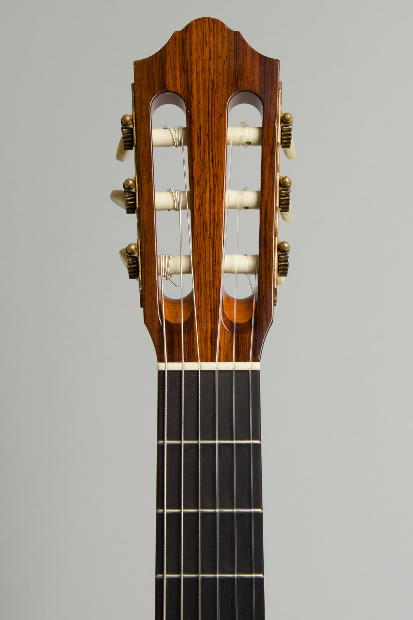 This guitar was hand built in Panhuyzen's Schwanau workshop in 1999. The rather austere label is hand signed and dated. It features a two-piece even grained spruce top framed by multi-layer wood purfling. The back and sides are made of beautiful dramatically grained rosewood, with a mahogany neck and superb black ebony fingerboard. The expansive sound is typical of Panhuyzen's instruments; powerful and well balanced with a strong deep bass and singing trebles. This is a fine concert-quality instrument from a very esteemed luthier.