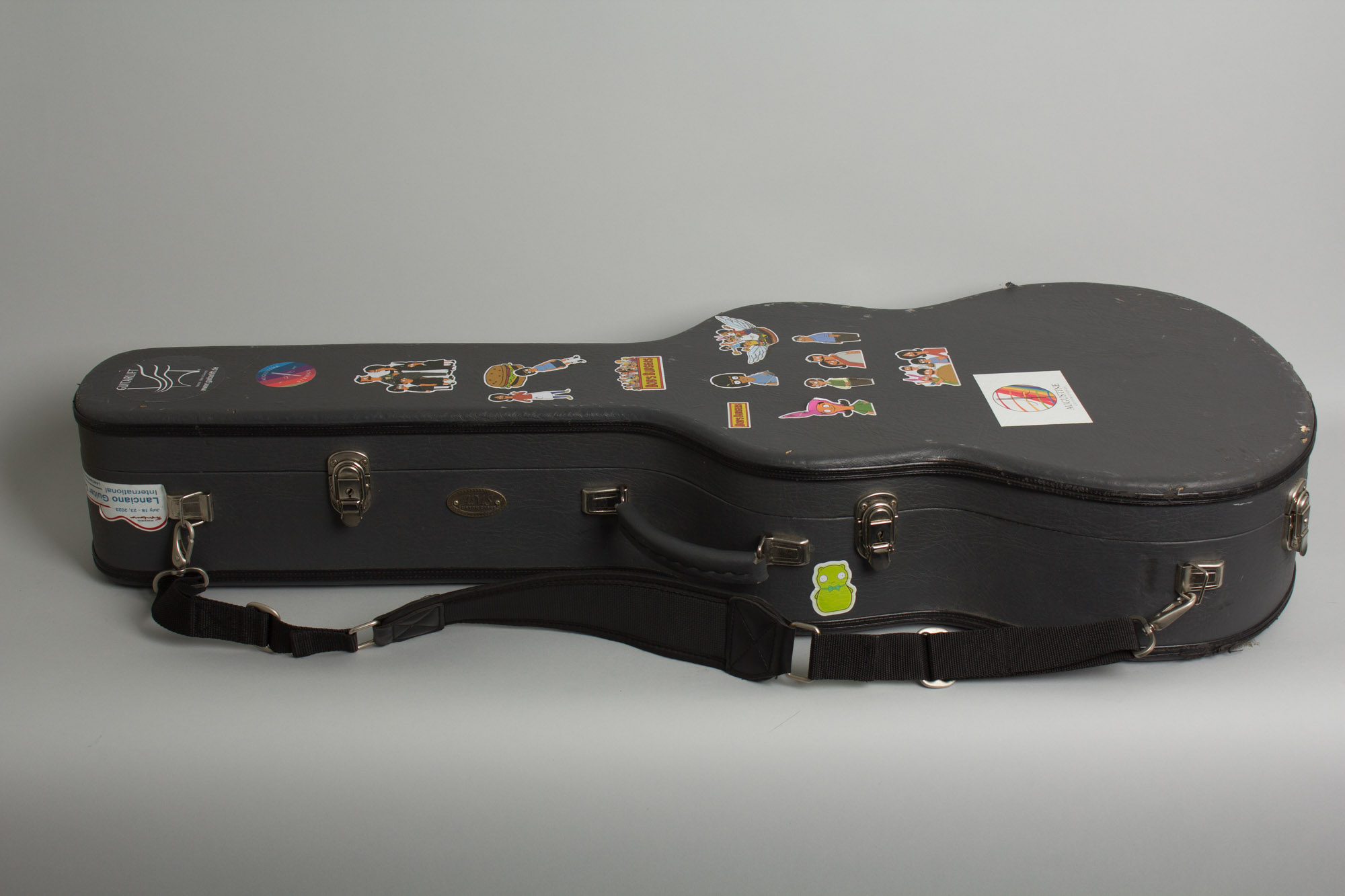 There are a couple of typical repairs; a repaired grain split runs along the center seam of the top from the bridge to the back edge. This is solidly but quite visibly sealed with no added finish. A small section of the back center seam above the tailblock has also been resealed, much more neatly and is comparatively inconspicuous. This is a well played in instrument, It has had plenty of time to mature and offers very responsive with a powerful sound and excellent projection. It lives in a good touring case, the lid festooned with stickers of characters from the animated TV series "Bobs Burgers". Overall Very Good + Condition.