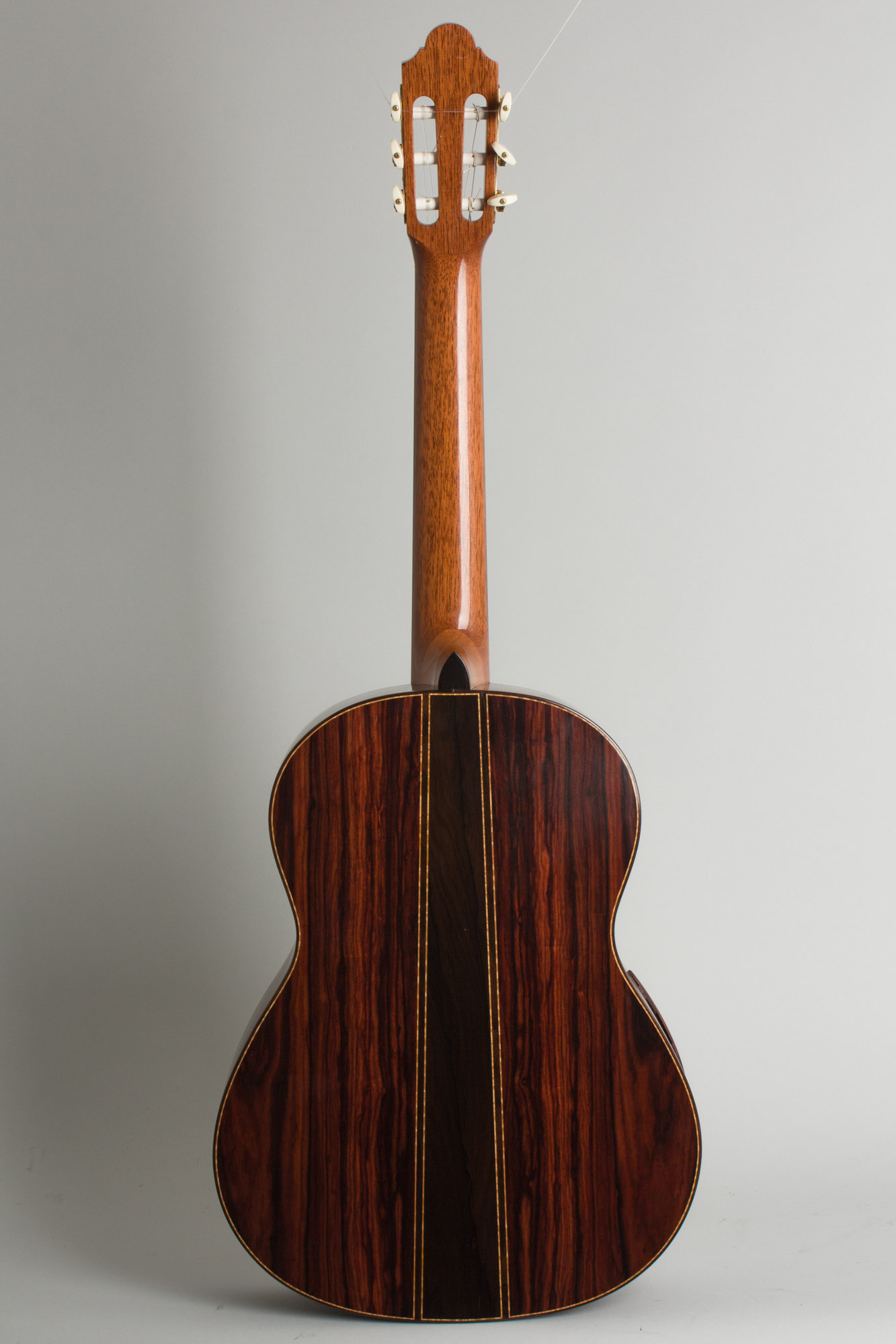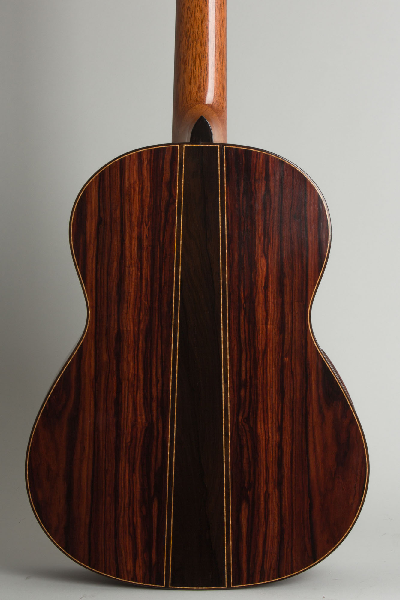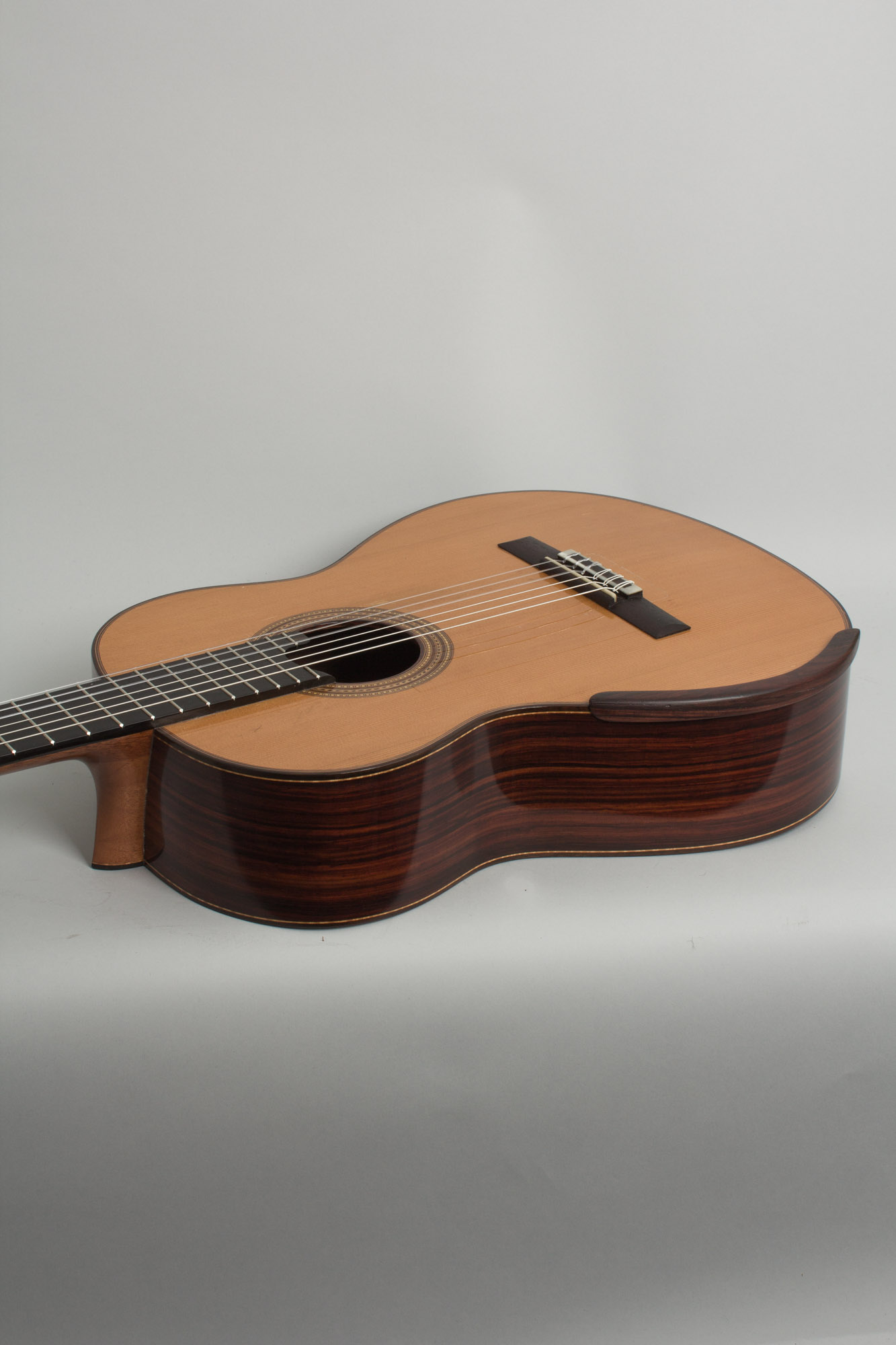 This handmade guitar has lately been in the hands of a performing concert player and though of recent build shows some notable play wear. The top has numerous nail marks below the fingerboard and below and behind the soundhole, with small scuffs and dings over the entire instrument. A small tap-protector style clear plastic plate sits behind the bridge to protect against scars from restringing, another is installed above the strings. There are no cracks or structural issues and this is a strong performing with a powerful even sound and very good projection. This instrument has just begun to mature, and already is a fine player with an excellent traditional sound. Overall Excellent - Condition.