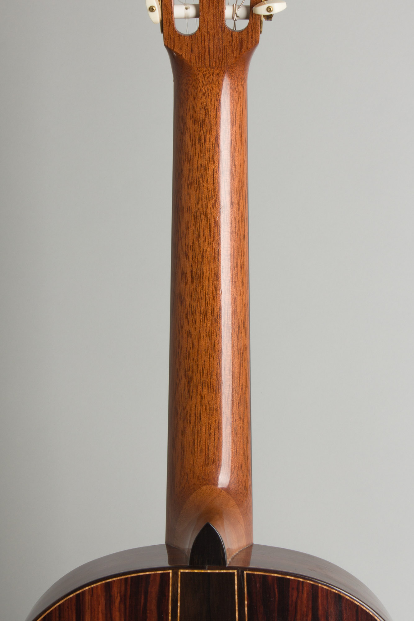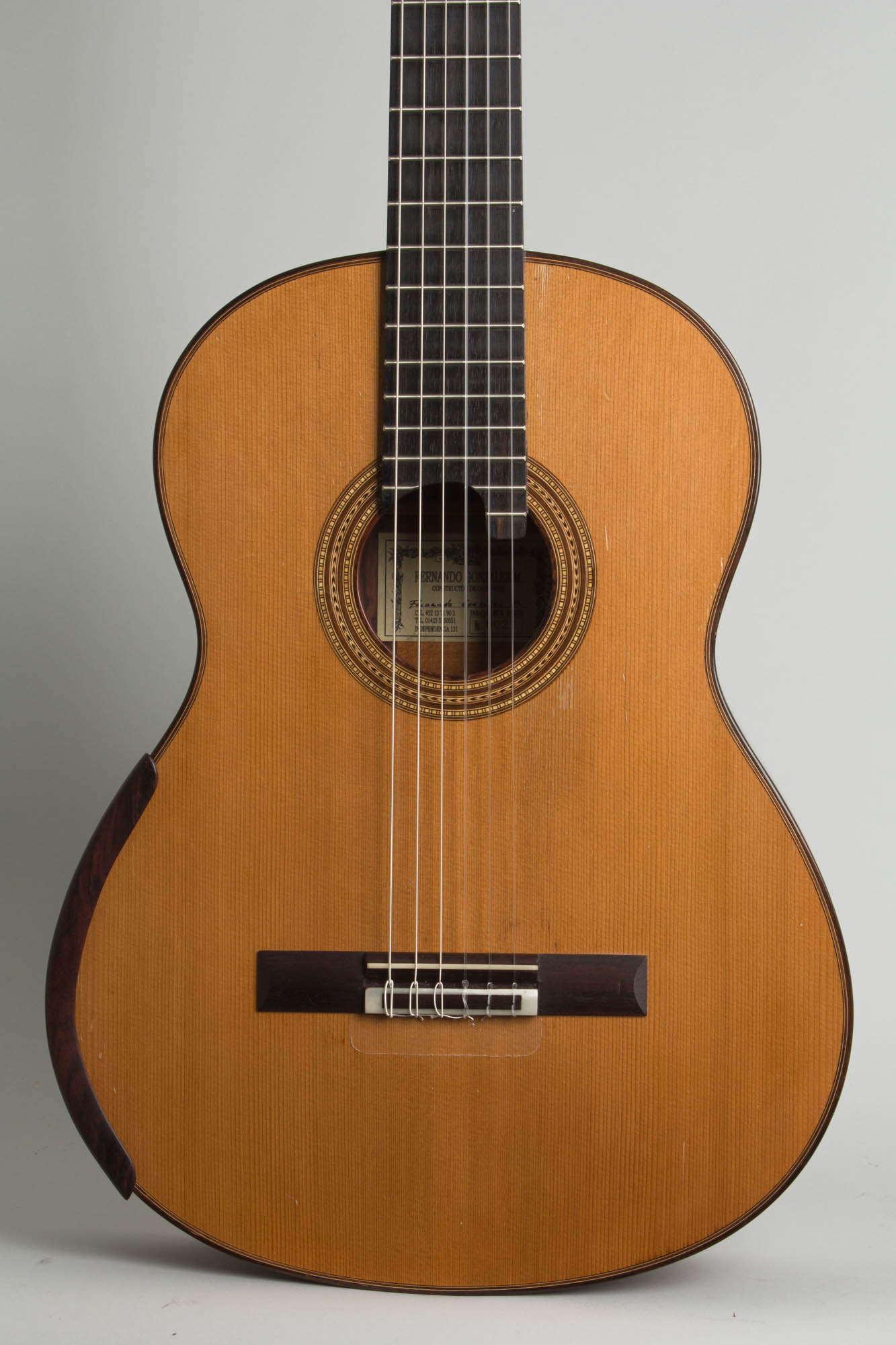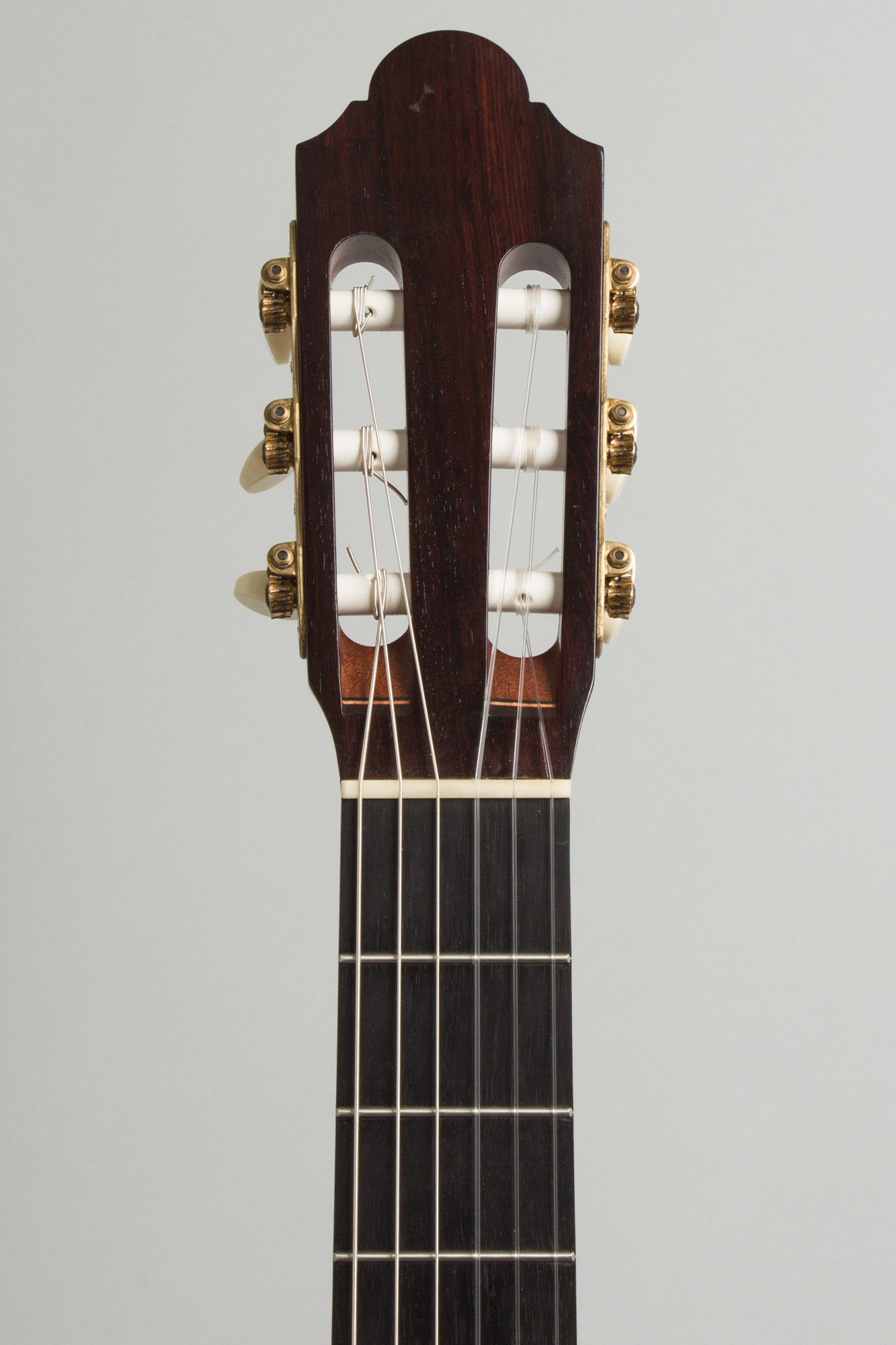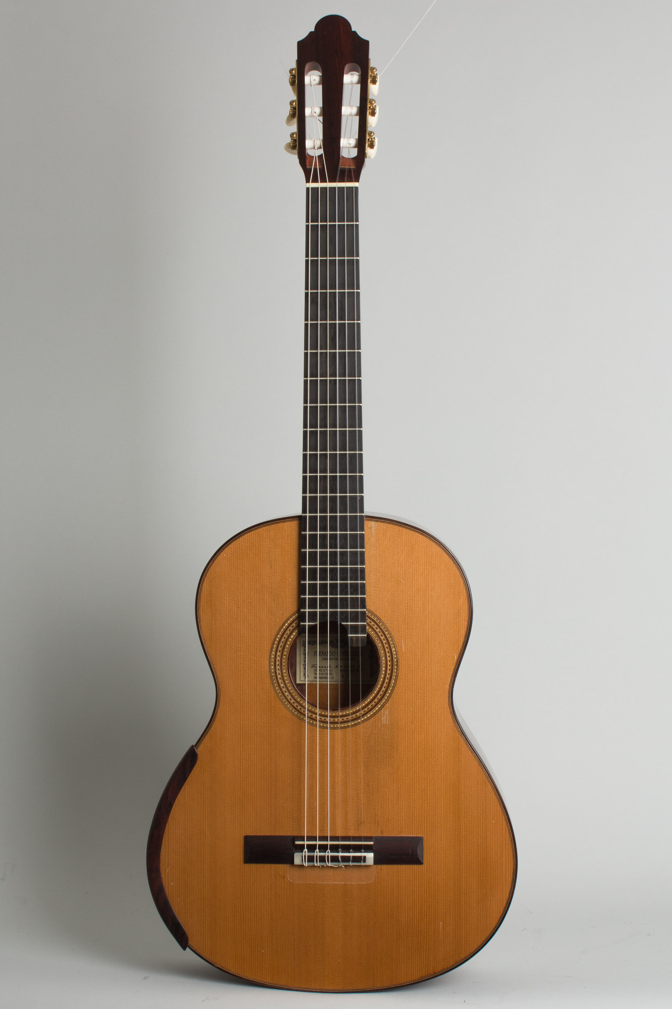 This handmade guitar has lately been in the hands of a performing concert player and though of recent build shows some notable play wear. The top has numerous nail marks below the fingerboard and below and behind the soundhole, with small scuffs and dings over the entire instrument. A small tap-protector style clear plastic plate sits behind the bridge to protect against scars from restringing, another is installed above the strings. There are no cracks or structural issues and this is a strong performing with a powerful even sound and very good projection. This instrument has just begun to mature, and already is a fine player with an excellent traditional sound. Overall Excellent - Condition.