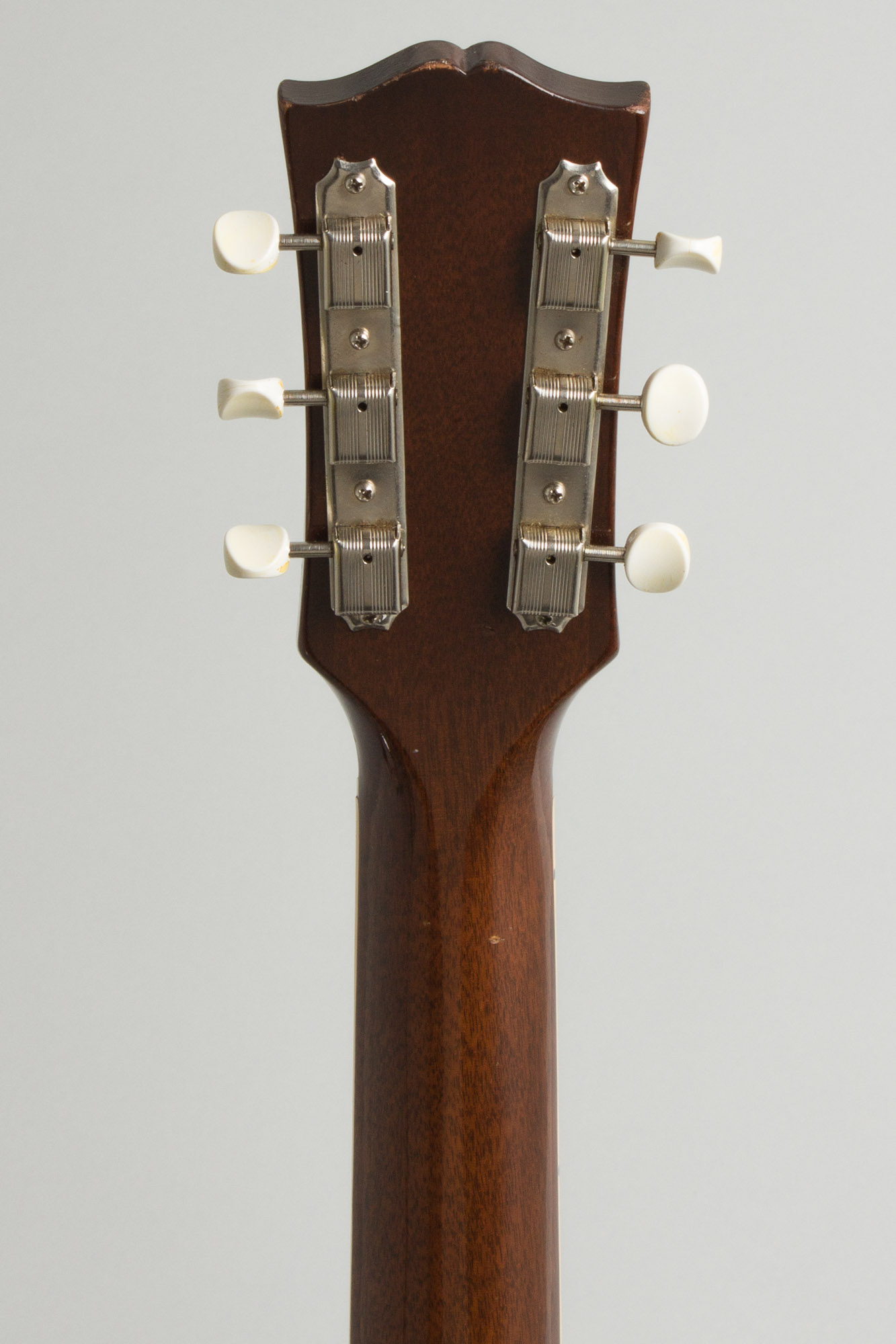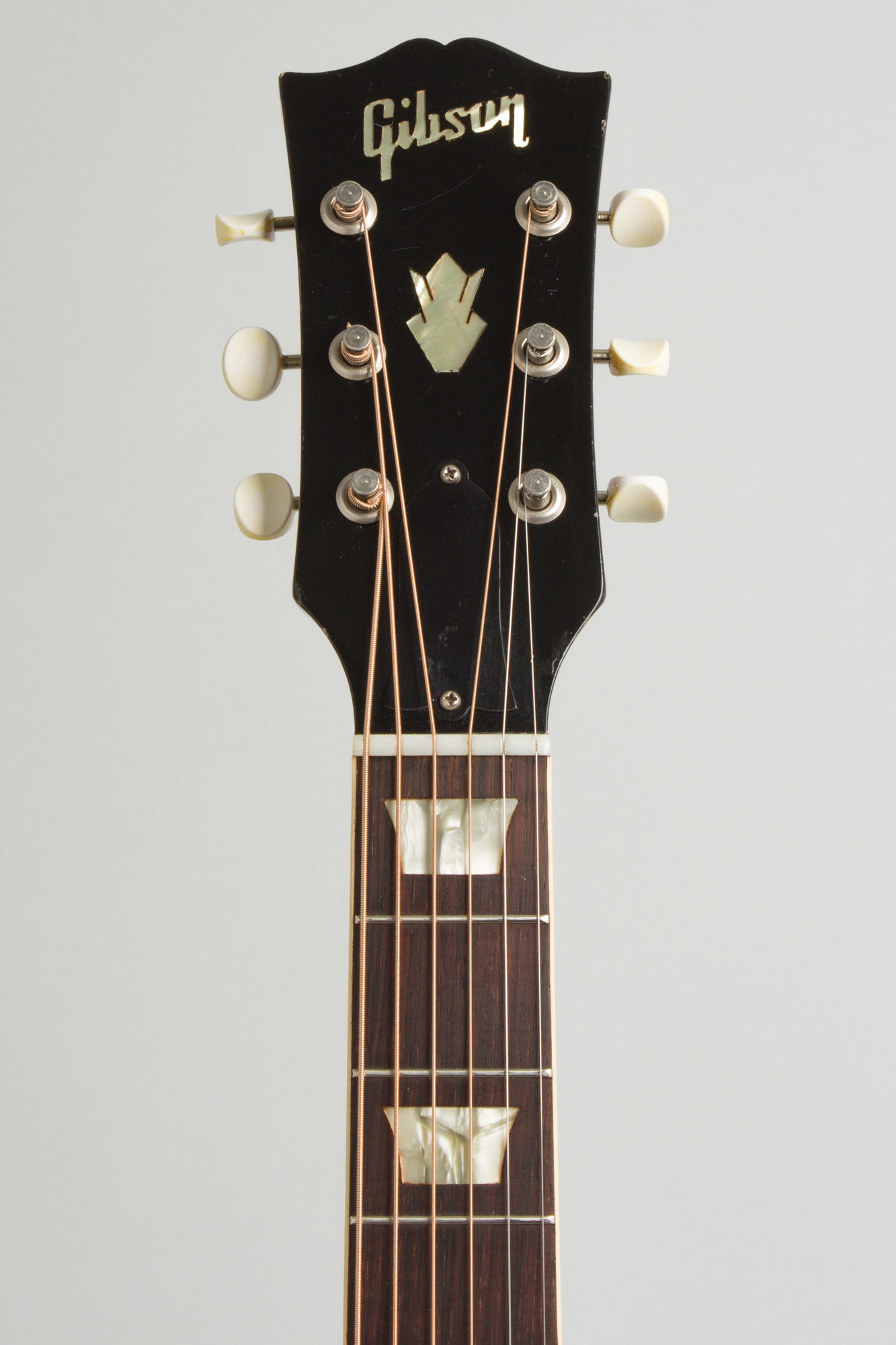 While the instrument is generally similar to the non-cutaway LG-2, it is considerably fancier in appearance and has a rather more upscale feel. The top is triple-bound and the back and fingerboard are single-bound. The headstock carries a pearl Gibson logo and crown inlay and the rosewood fingerboard is inlaid with pearloid trapezoids. The neck is a medium "C" profile with slightly more dress-away on the sides than some '50s Gibsons and very comfortable.