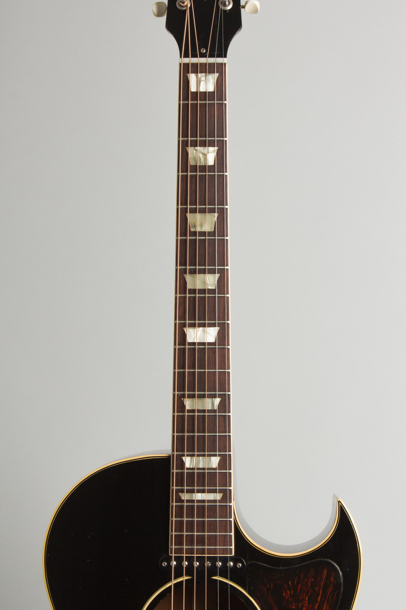 Gibson offered this model as a straight acoustic guitar as the CF-100 or with an ingenious added magnetic pickup as the CF-100E, and both were sold in limited numbers throughout the 1950s and so are fairly rare today. Only 132 of the electric model shipped out in 1956, out of a total of 1257 for the entire run. The pickup is Gibson's standard P-90 single coil, mounted under the top with a decorative bezel around the polepieces. The controls are a standard tone and volume mounted along the lower bout on the top. The top itself is solid spruce and X-braced, so the electronics rig does not inhibit the acoustic response to any great degree. The only construction concession to amplification is a small extra forward section added ahead of the small maple bridgeplate to stiffen the top just a bit.