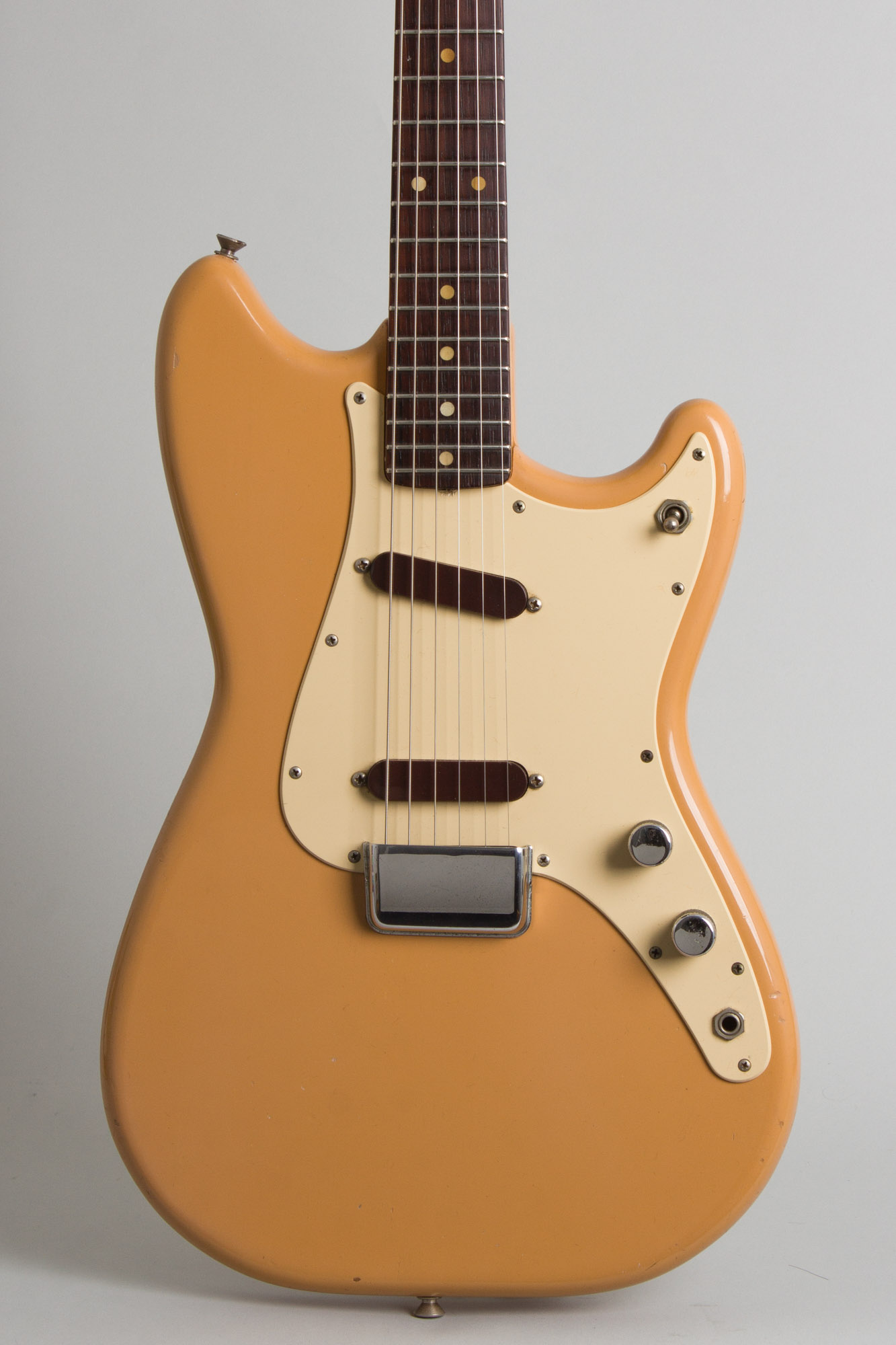 This is a lovely clean and all original example of a late 1960 Fender Duo-Sonic, the company's original two-pickup student guitar. By the middle of 1964 this 3/4 sized model would be re-styled to match the new Mustang, with a slightly different body and altered switching and cosmetics. This more solidly "Pre-CBS" guitar is a transitional version lacking the anodized pickguard of the late 1950's and with the new-in-1959 "slab" rosewood fingerboard on the maple neck. Other distinctive appointments include the old-style "desert sand" body finish and two brown-covered single-coil pickups mounted in the off-white single-layer plastic pickguard selected by a 3-way toggle, with volume and tone controls.