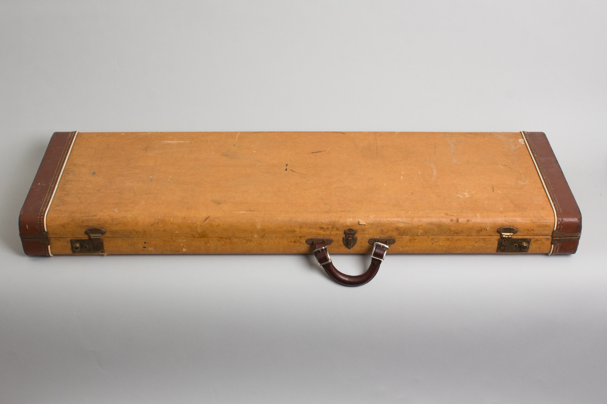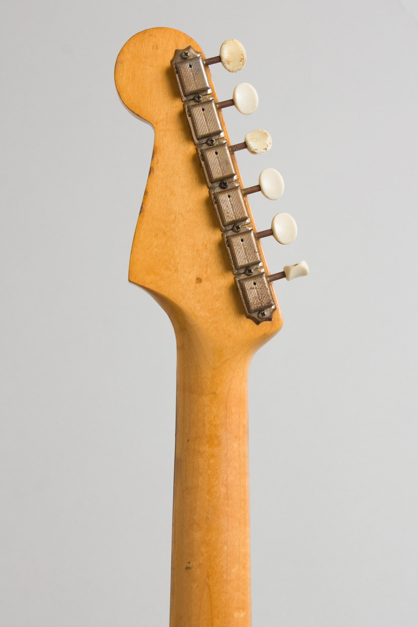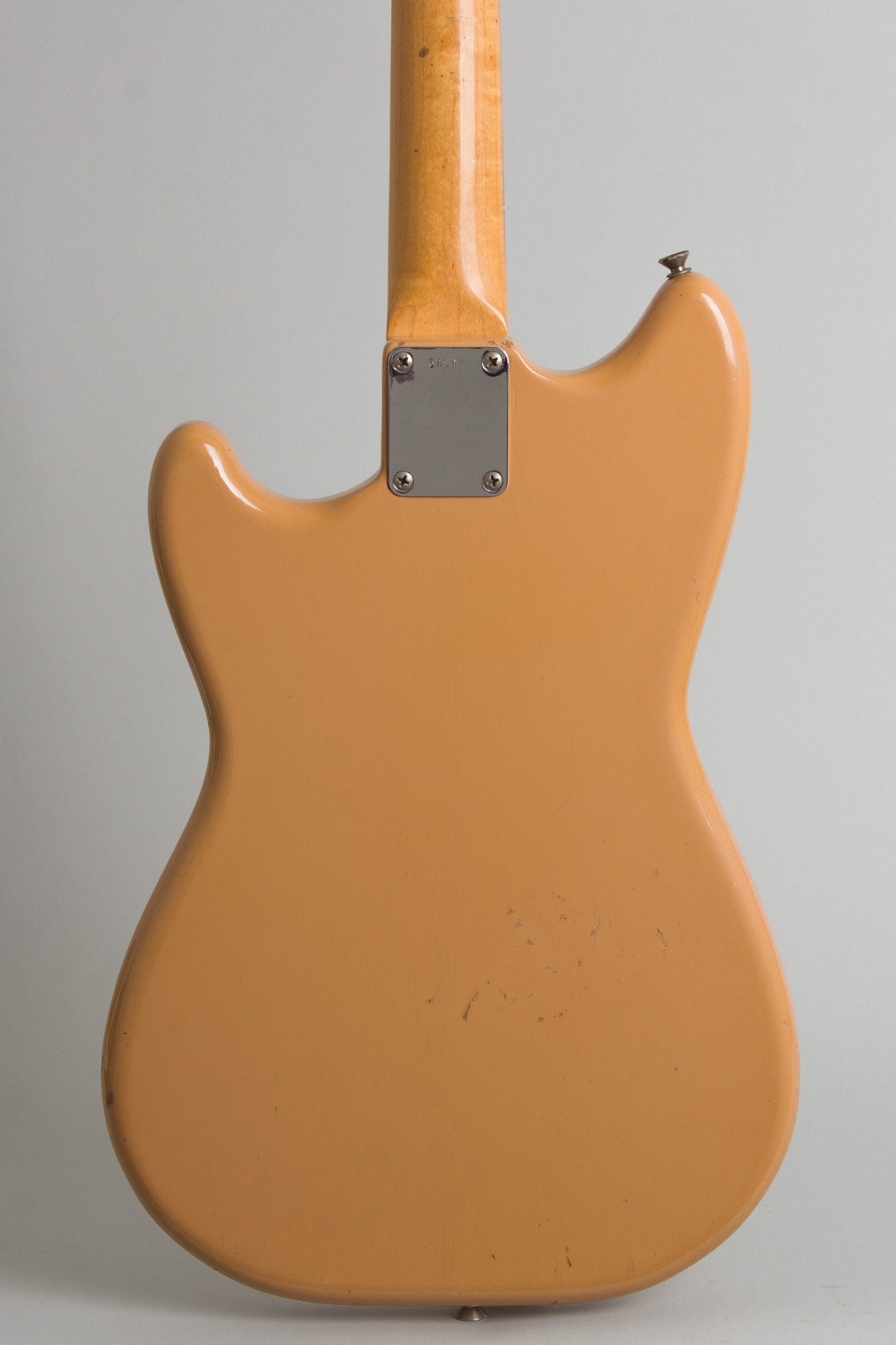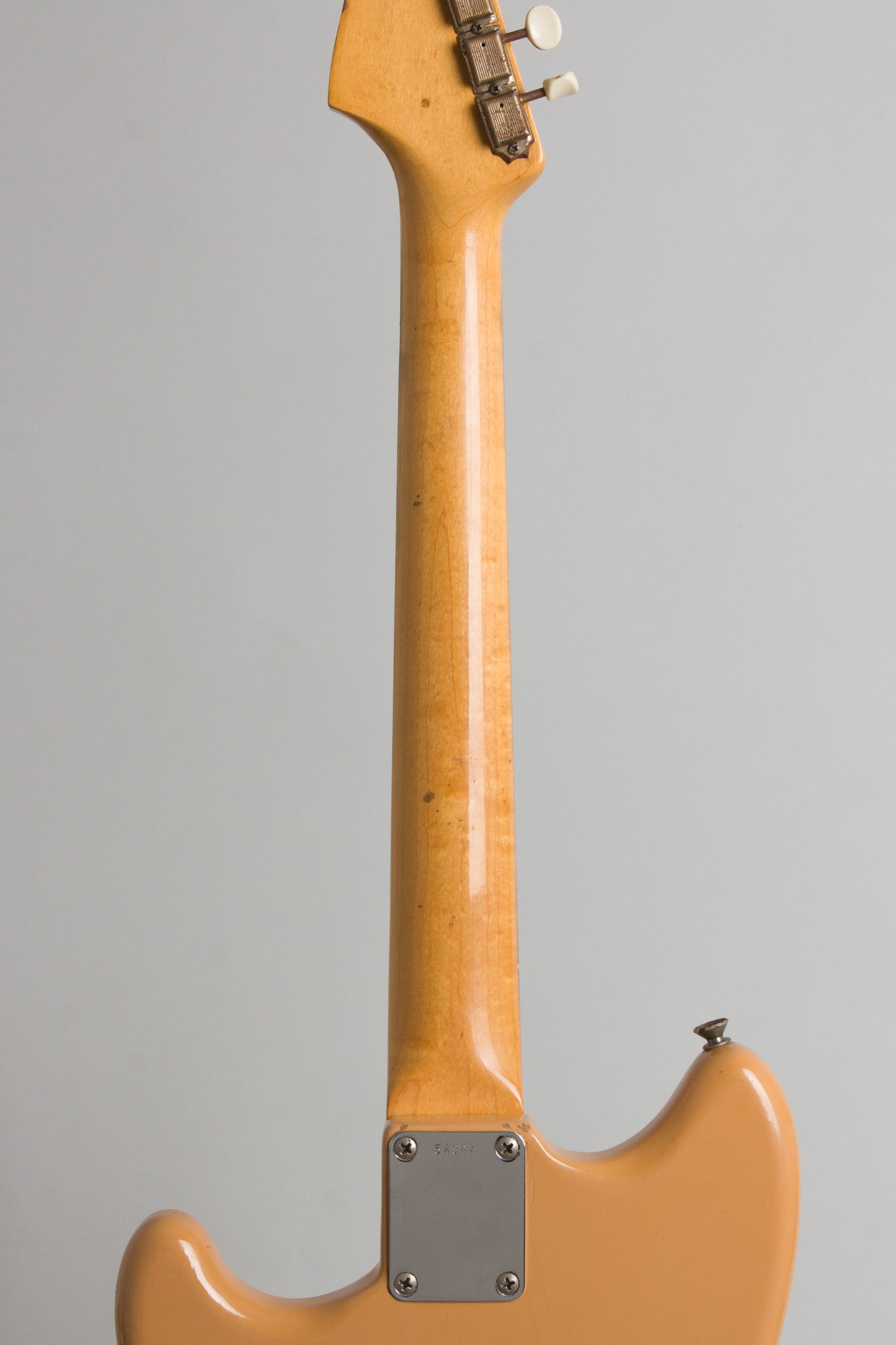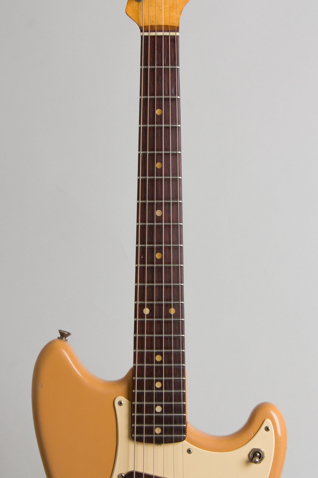 This guitar is in very clean and nearly all original shape, looking pretty much like it came off the pawn shop wall in, say, 1962. There are some faint dings and scuffs in the body lacquer, but minor enough so as to nearly camouflage into the original Desert Sand finish. The back of the neck has a few small feelable dinks and very light rub wear on the edges. The electronics are all original and pristinely kept, the hardware is original and clean with the exception of the 3-way switch and steel bridge saddles being slightly corroded; the biggest signs of wear anywhere on the instrument. The original (and often lost) press-on chrome bridge cover is still intact.