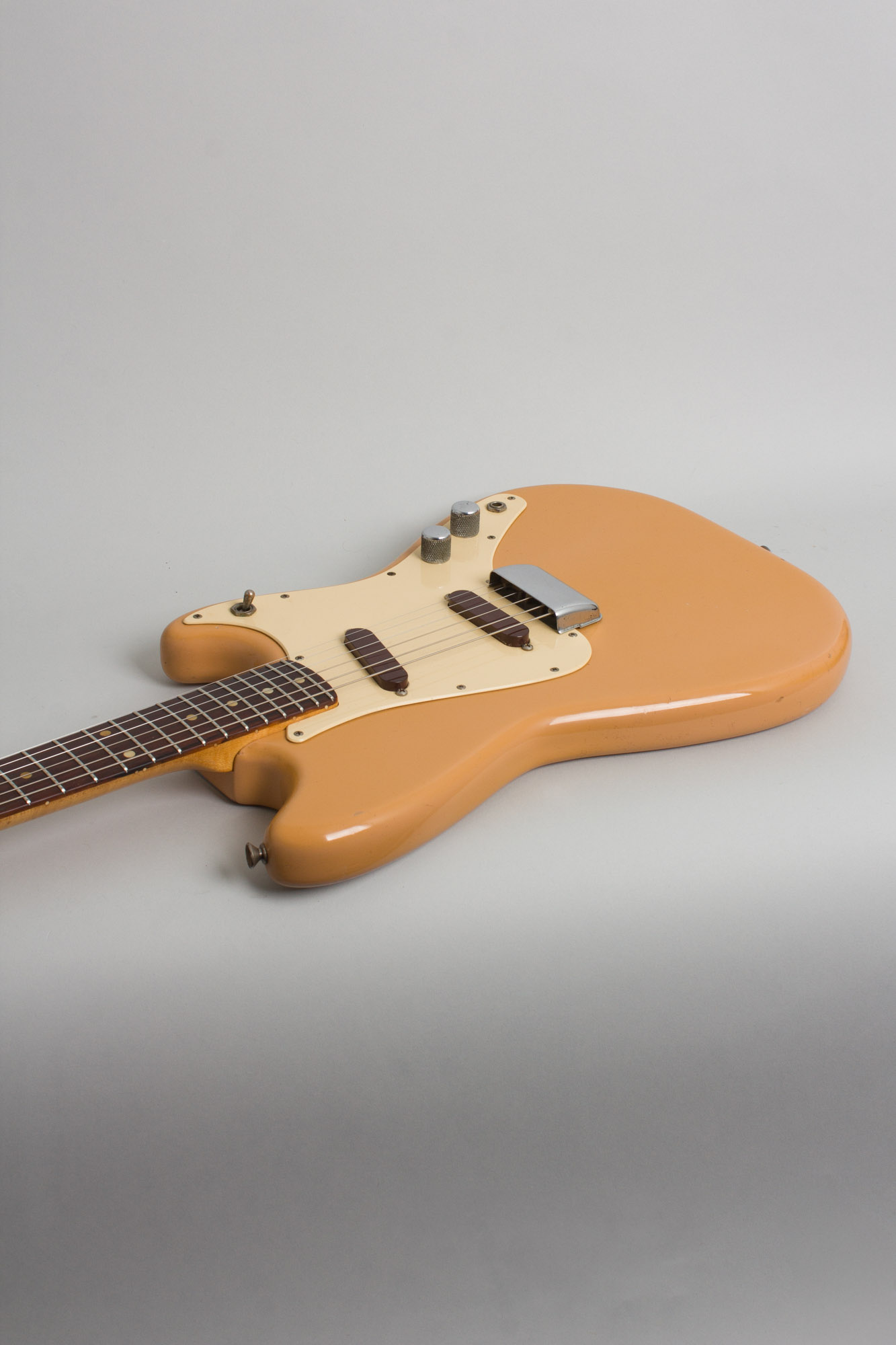 Fender Duo-Sonic Model Solid Body Electric Guitar (1960), made in Fullerton, California, serial # 54947, desert sand finish, alder body, maple neck with rosewood fingerboard, original brown hard shell case.