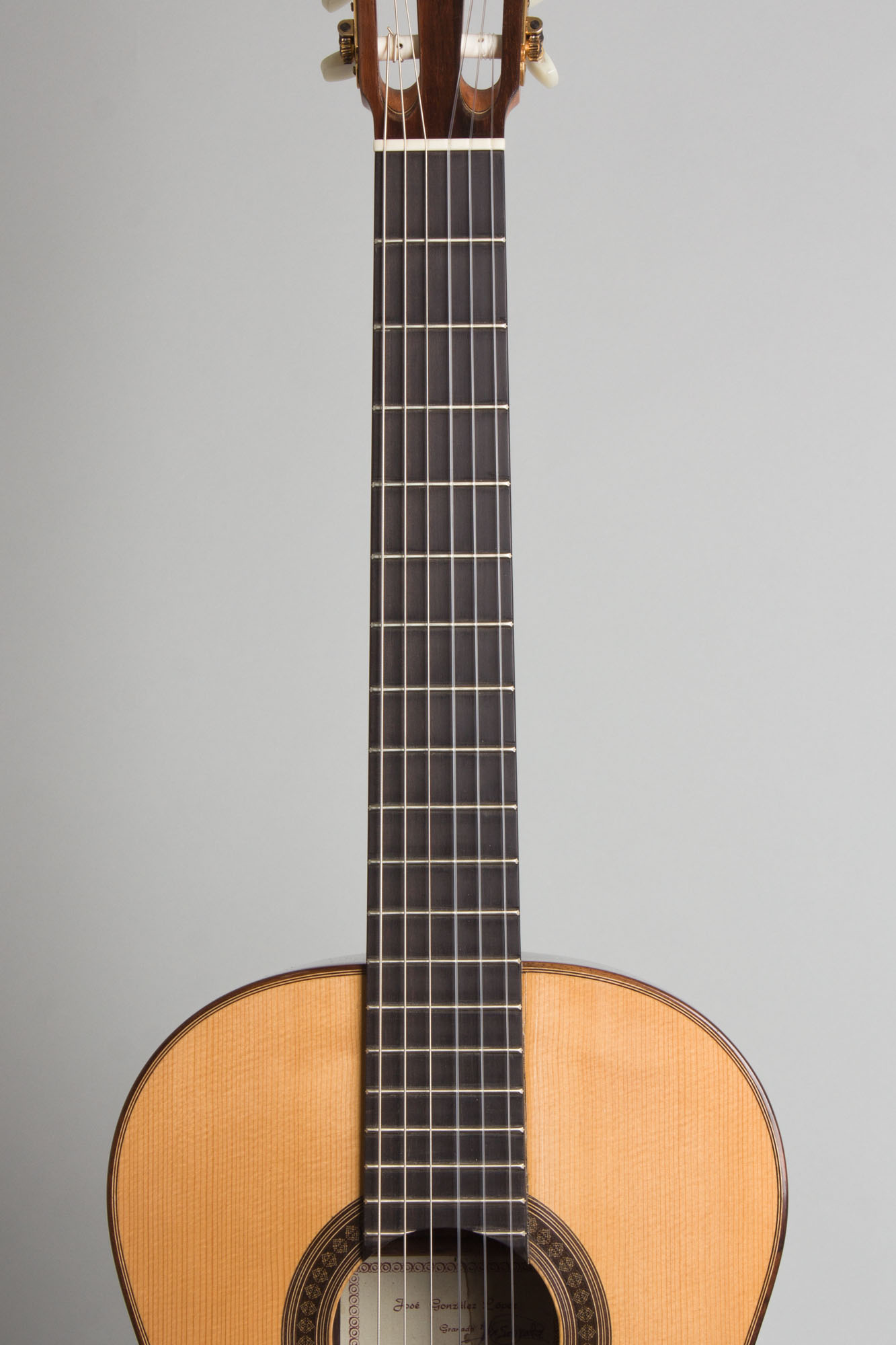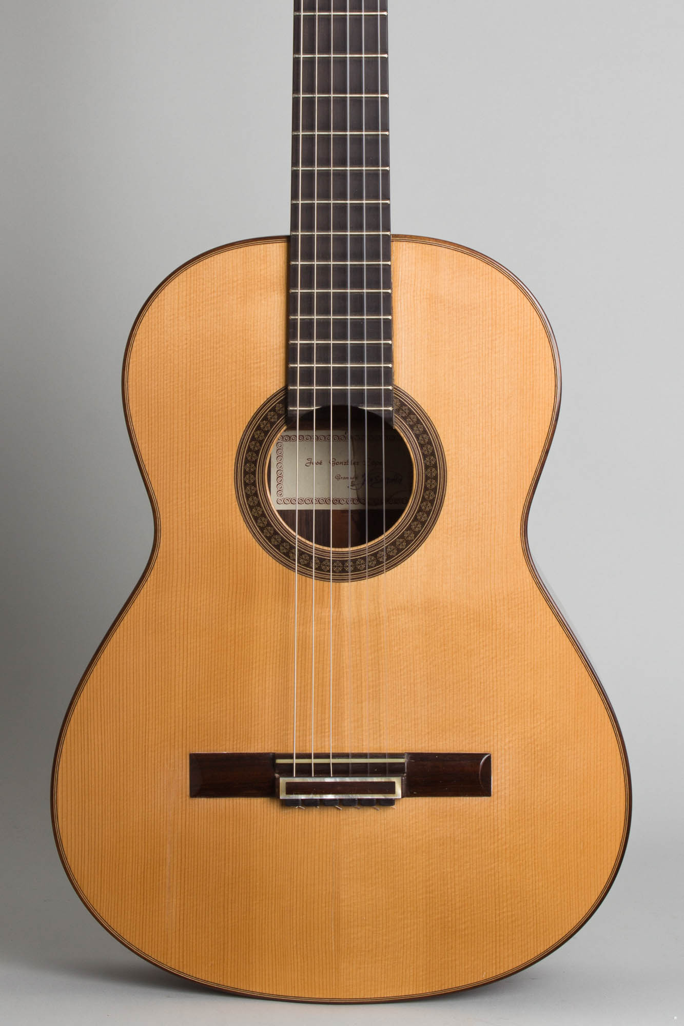 Jose Gonzalez Lopez was born in Orgiva (Granada) in 1961 and began his apprenticeship at age 28 under the guidance of master luthiers Antonio Marin Montero and Jose Marin Plazuelo. Gonzalez Lopez' instruments are deeply rooted deeply in the traditional Granada school of guitar making, and for some years now he has been building excellent Spanish Concert guitars fully worthy of the standards and reputation of the handmade instruments from that city. This handmade guitar features beautiful straight-grained rosewood back and sides and a wider grain spruce top and a Spanish cedar neck with an ebony fingerboard. The label is hand-signed by the maker. The tone of this guitar is very traditionally Spanish; rich and clear with a quick response but more depth than many modern instruments and an overriding sweetness in the trebles.