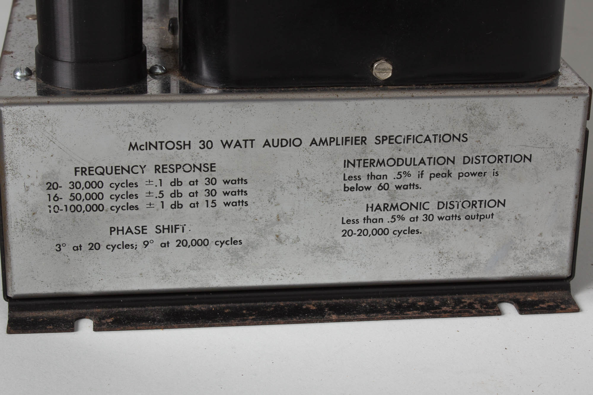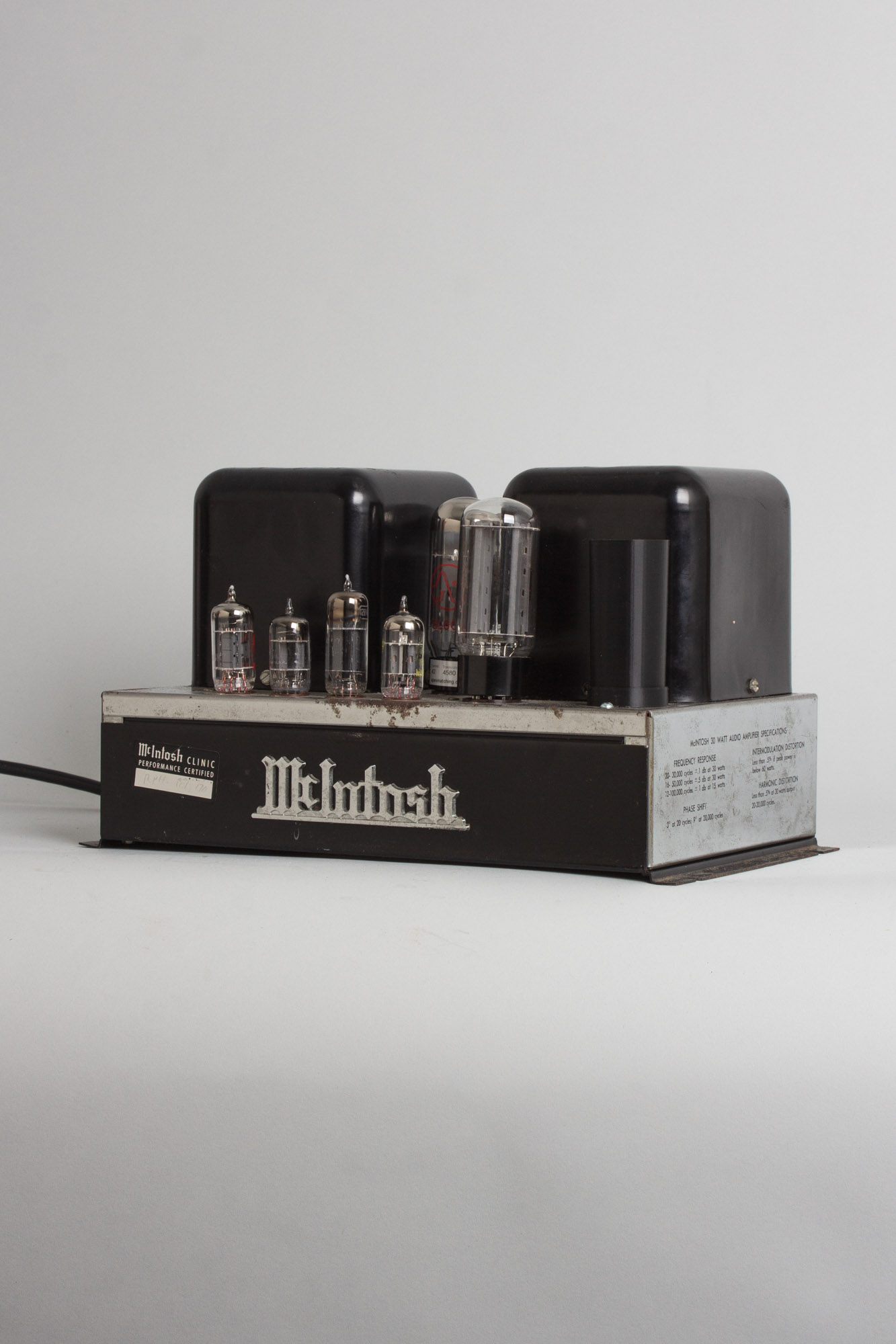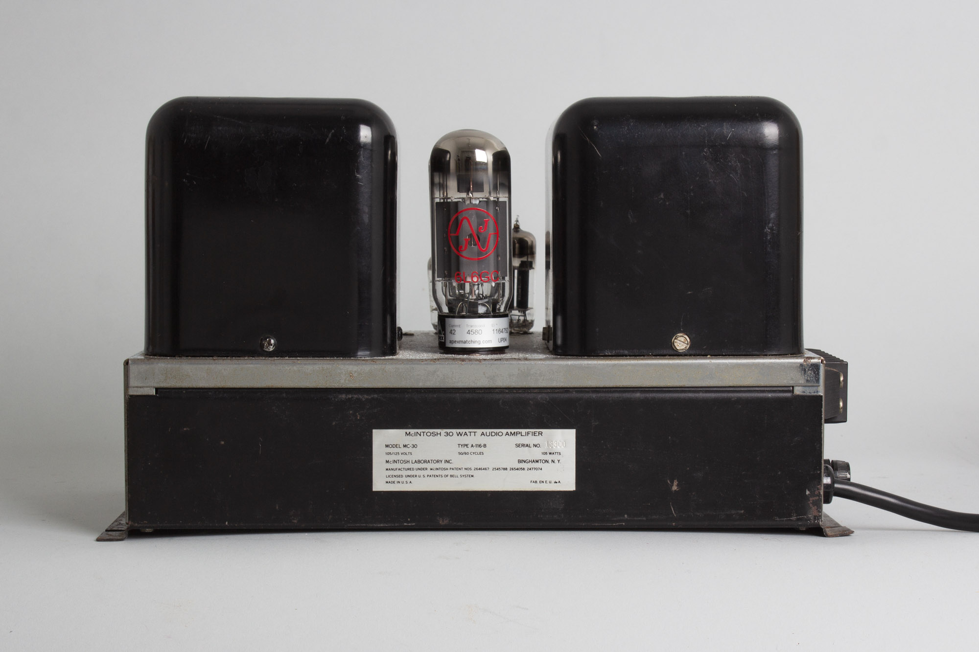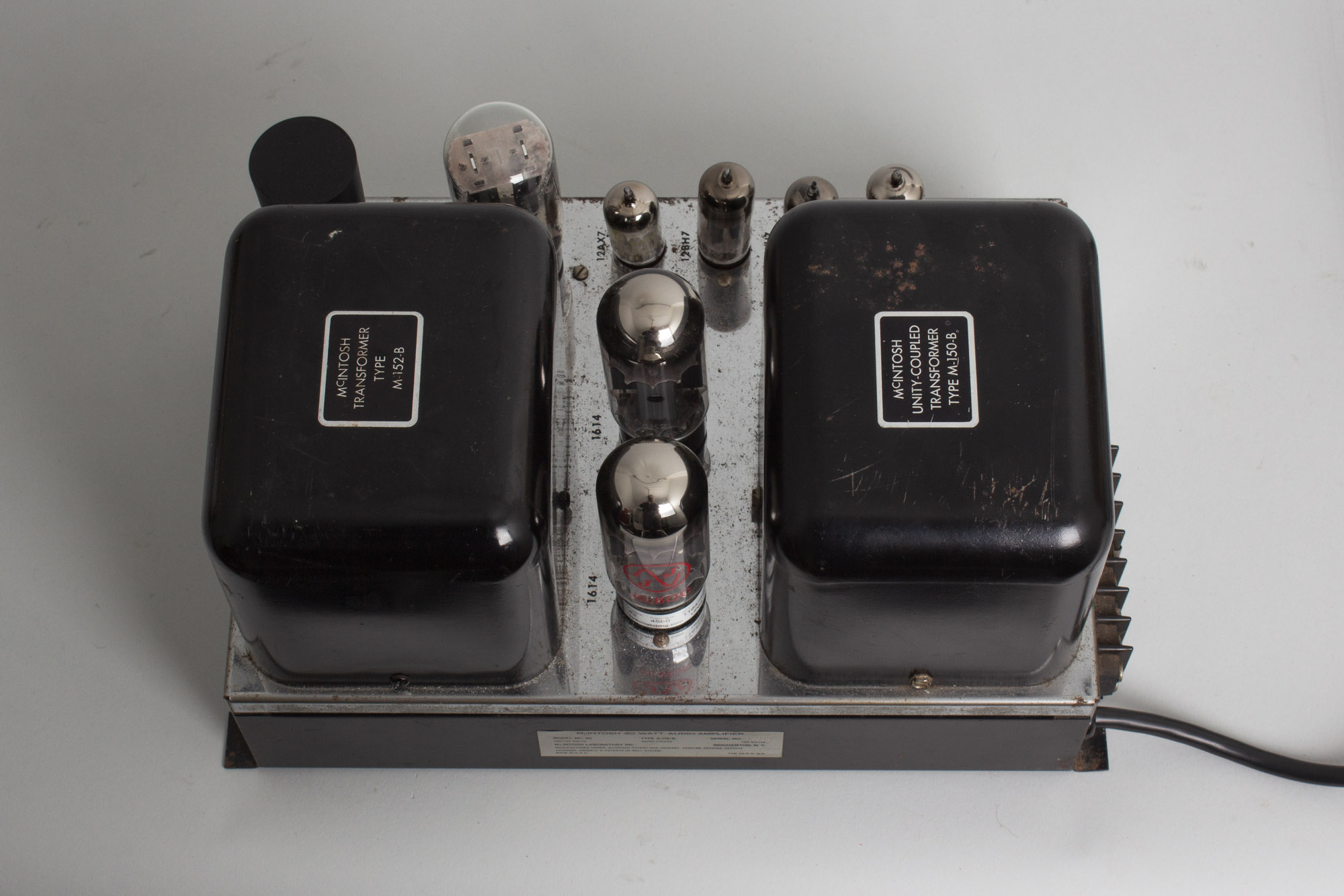 First coming onto the market in 1954, the MC-30 (A-116-B) was in production until 1962 with 14,246 units produced in total. It's an older design and the last tube-rectified amplifier that McIntosh produced. The legendary MC-240, reportedly used by Brian Wilson, Joe Cocker Band and Jerry Garcia, can be thought of as an evolution of the MC-30, being essentially two MC-30s combined into one chassis with solid state rectification and some small changes for stereo operation.